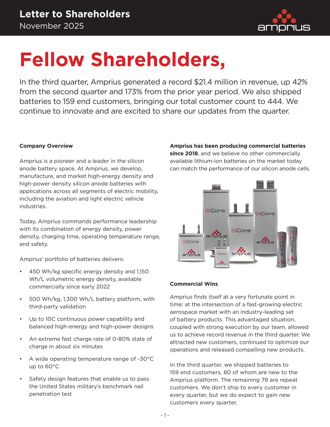 Letter to Shareholders November 2025 - 1 - Amprius has been producing commercial batteries since 2018, and we believe no other commercially available lithium-ion batteries on the market today can match the performance of our silicon anode cells. Commercial Wins Amprius finds itself at a very fortunate point in time: at the intersection of a fast-growing electric aerospace market with an industry-leading set of battery products. This advantaged situation, coupled with strong execution by our team, allowed us to achieve record revenue in the third quarter. We attracted new customers, continued to optimize our operations and released compelling new products. In the third quarter, we shipped batteries to 159 end customers, 80 of whom are new to the Amprius platform. The remaining 79 are repeat customers. We don’t ship to every customer in every quarter, but we do expect to gain new customers every quarter. Company Overview Amprius is a pioneer and a leader in the silicon anode battery space. At Amprius, we develop, manufacture, and market high-energy density and high-power density silicon anode batteries with applications across all segments of electric mobility, including the aviation and light electric vehicle industries. Today, Amprius commands performance leadership with its combination of energy density, power density, charging time, operating temperature range, and safety. Amprius’ portfolio of batteries delivers: • 450 Wh/kg specific energy density and 1,150 Wh/L volumetric energy density, available commercially since early 2022 • 500 Wh/kg, 1,300 Wh/L battery platform, with third-party validation • Up to 10C continuous power capability and balanced high-energy and high-power designs • An extreme fast charge rate of 0-80% state of charge in about six minutes • A wide operating temperature range of -30°C up to 60°C • Safety design features that enable us to pass the United States military’s benchmark nail penetration test Fellow Shareholders, In the third quarter, Amprius generated a record $21.4 million in revenue, up 42% from the second quarter and 173% from the prior year period. We also shipped batteries to 159 end customers, bringing our total customer count to 444. We continue to innovate and are excited to share our updates from the quarter.