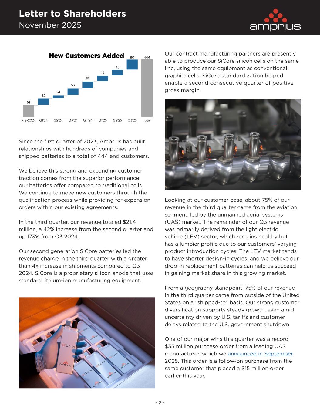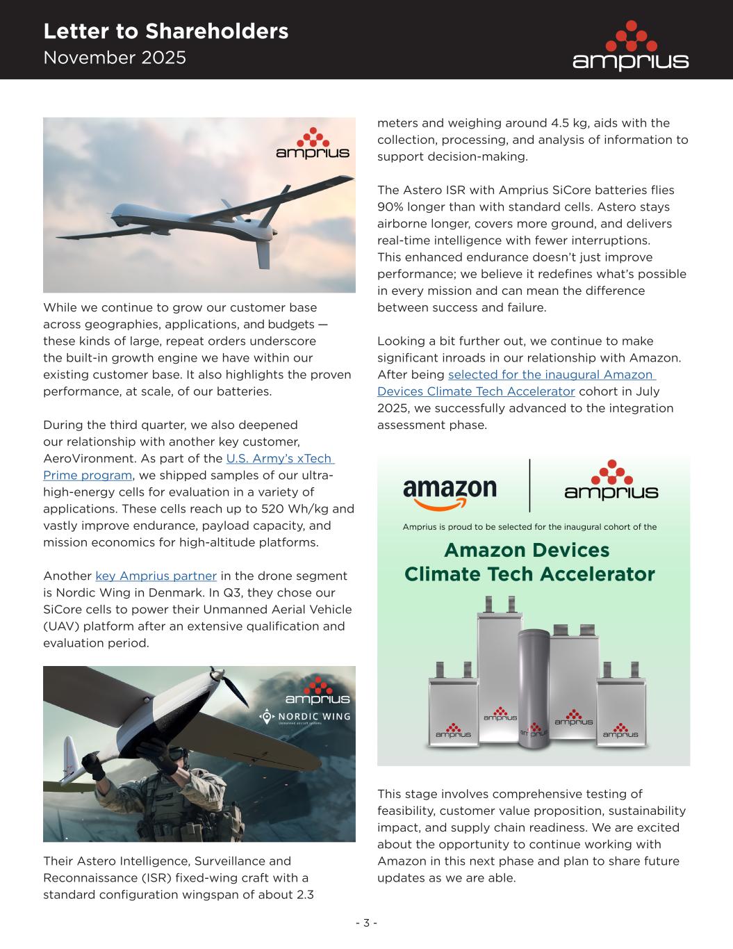 Letter to Shareholders November 2025 - 3 - While we continue to grow our customer base across geographies, applications, and budgets — these kinds of large, repeat orders underscore the built-in growth engine we have within our existing customer base. It also highlights the proven performance, at scale, of our batteries. During the third quarter, we also deepened our relationship with another key customer, AeroVironment. As part of the U.S. Army’s xTech Prime program, we shipped samples of our ultra- high-energy cells for evaluation in a variety of applications. These cells reach up to 520 Wh/kg and vastly improve endurance, payload capacity, and mission economics for high-altitude platforms. Another key Amprius partner in the drone segment is Nordic Wing in Denmark. In Q3, they chose our SiCore cells to power their Unmanned Aerial Vehicle (UAV) platform after an extensive qualification and evaluation period. Their Astero Intelligence, Surveillance and Reconnaissance (ISR) fixed-wing craft with a standard configuration wingspan of about 2.3 meters and weighing around 4.5 kg, aids with the collection, processing, and analysis of information to support decision-making. The Astero ISR with Amprius SiCore batteries flies 90% longer than with standard cells. Astero stays airborne longer, covers more ground, and delivers real-time intelligence with fewer interruptions. This enhanced endurance doesn’t just improve performance; we believe it redefines what’s possible in every mission and can mean the difference between success and failure. Looking a bit further out, we continue to make significant inroads in our relationship with Amazon. After being selected for the inaugural Amazon Devices Climate Tech Accelerator cohort in July 2025, we successfully advanced to the integration assessment phase. This stage involves comprehensive testing of feasibility, customer value proposition, sustainability impact, and supply chain readiness. We are excited about the opportunity to continue working with Amazon in this next phase and plan to share future updates as we are able.