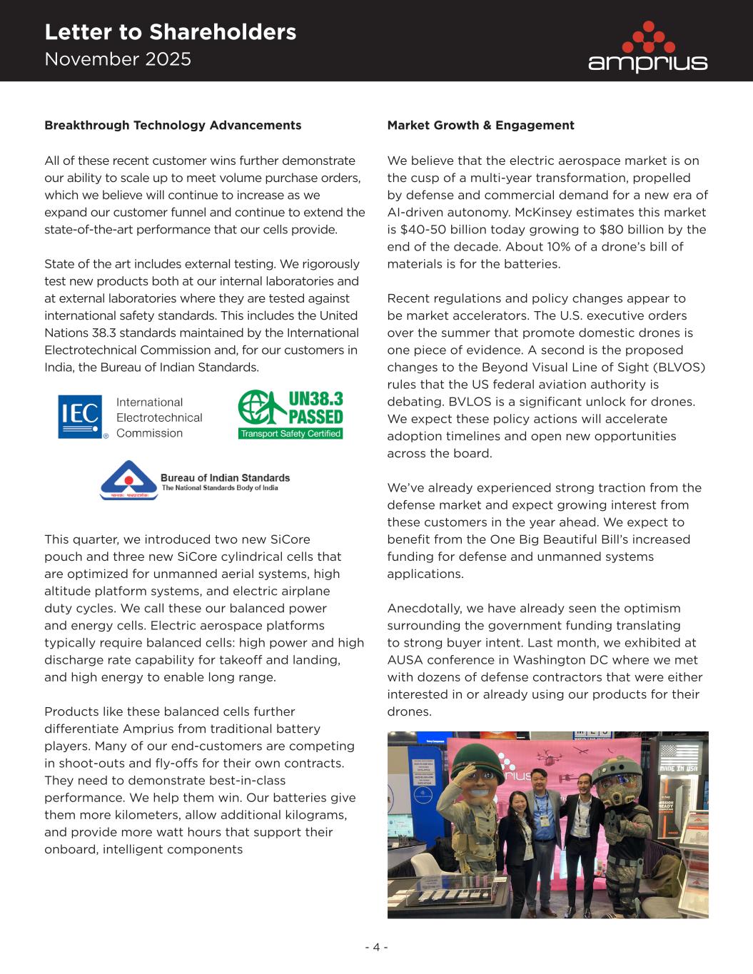 Letter to Shareholders November 2025 - 4 - Breakthrough Technology Advancements All of these recent customer wins further demonstrate our ability to scale up to meet volume purchase orders, which we believe will continue to increase as we expand our customer funnel and continue to extend the state-of-the-art performance that our cells provide. State of the art includes external testing. We rigorously test new products both at our internal laboratories and at external laboratories where they are tested against international safety standards. This includes the United Nations 38.3 standards maintained by the International Electrotechnical Commission and, for our customers in India, the Bureau of Indian Standards. This quarter, we introduced two new SiCore pouch and three new SiCore cylindrical cells that are optimized for unmanned aerial systems, high altitude platform systems, and electric airplane duty cycles. We call these our balanced power and energy cells. Electric aerospace platforms typically require balanced cells: high power and high discharge rate capability for takeoff and landing, and high energy to enable long range. Products like these balanced cells further differentiate Amprius from traditional battery players. Many of our end-customers are competing in shoot-outs and fly-offs for their own contracts. They need to demonstrate best-in-class performance. We help them win. Our batteries give them more kilometers, allow additional kilograms, and provide more watt hours that support their onboard, intelligent components Market Growth & Engagement We believe that the electric aerospace market is on the cusp of a multi-year transformation, propelled by defense and commercial demand for a new era of AI-driven autonomy. McKinsey estimates this market is $40-50 billion today growing to $80 billion by the end of the decade. About 10% of a drone’s bill of materials is for the batteries. Recent regulations and policy changes appear to be market accelerators. The U.S. executive orders over the summer that promote domestic drones is one piece of evidence. A second is the proposed changes to the Beyond Visual Line of Sight (BLVOS) rules that the US federal aviation authority is debating. BVLOS is a significant unlock for drones. We expect these policy actions will accelerate adoption timelines and open new opportunities across the board. We’ve already experienced strong traction from the defense market and expect growing interest from these customers in the year ahead. We expect to benefit from the One Big Beautiful Bill’s increased funding for defense and unmanned systems applications. Anecdotally, we have already seen the optimism surrounding the government funding translating to strong buyer intent. Last month, we exhibited at AUSA conference in Washington DC where we met with dozens of defense contractors that were either interested in or already using our products for their drones.