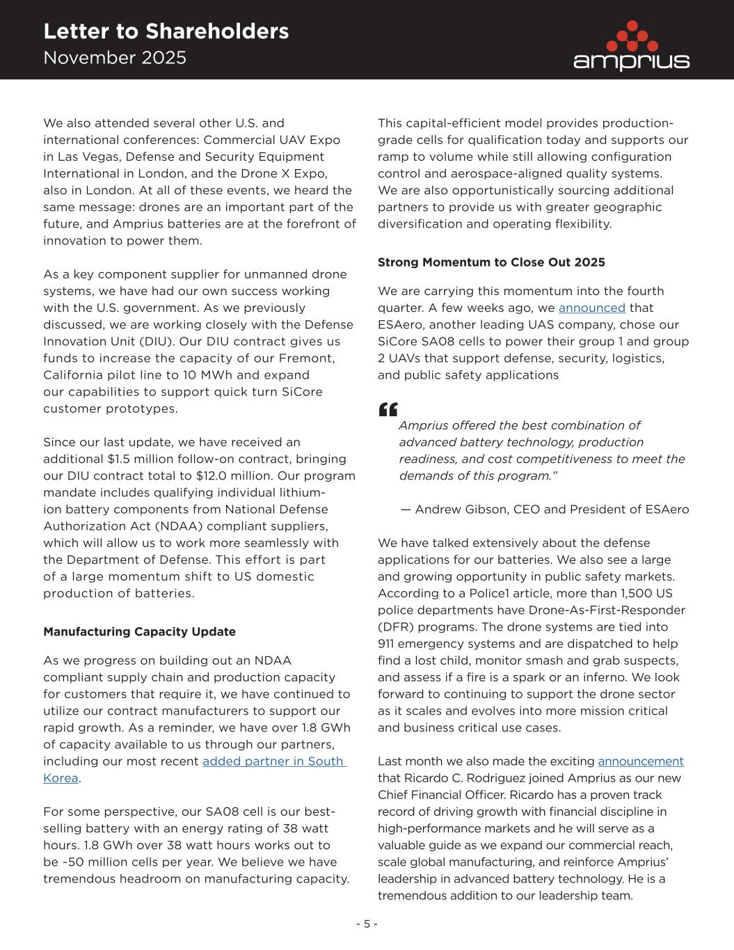 Letter to Shareholders November 2025 - 5 - We also attended several other U.S. and international conferences: Commercial UAV Expo in Las Vegas, Defense and Security Equipment International in London, and the Drone X Expo, also in London. At all of these events, we heard the same message: drones are an important part of the future, and Amprius batteries are at the forefront of innovation to power them. As a key component supplier for unmanned drone systems, we have had our own success working with the U.S. government. As we previously discussed, we are working closely with the Defense Innovation Unit (DIU). Our DIU contract gives us funds to increase the capacity of our Fremont, California pilot line to 10 MWh and expand our capabilities to support quick turn SiCore customer prototypes. Since our last update, we have received an additional $1.5 million follow-on contract, bringing our DIU contract total to $12.0 million. Our program mandate includes qualifying individual lithium- ion battery components from National Defense Authorization Act (NDAA) compliant suppliers, which will allow us to work more seamlessly with the Department of Defense. This effort is part of a large momentum shift to US domestic production of batteries. Manufacturing Capacity Update As we progress on building out an NDAA compliant supply chain and production capacity for customers that require it, we have continued to utilize our contract manufacturers to support our rapid growth. As a reminder, we have over 1.8 GWh of capacity available to us through our partners, including our most recent added partner in South Korea. For some perspective, our SA08 cell is our best- selling battery with an energy rating of 38 watt hours. 1.8 GWh over 38 watt hours works out to be ~50 million cells per year. We believe we have tremendous headroom on manufacturing capacity. This capital-efficient model provides production- grade cells for qualification today and supports our ramp to volume while still allowing configuration control and aerospace-aligned quality systems. We are also opportunistically sourcing additional partners to provide us with greater geographic diversification and operating flexibility. Strong Momentum to Close Out 2025 We are carrying this momentum into the fourth quarter. A few weeks ago, we announced that ESAero, another leading UAS company, chose our SiCore SA08 cells to power their group 1 and group 2 UAVs that support defense, security, logistics, and public safety applications “Amprius offered the best combination of advanced battery technology, production readiness, and cost competitiveness to meet the demands of this program.” — Andrew Gibson, CEO and President of ESAero We have talked extensively about the defense applications for our batteries. We also see a large and growing opportunity in public safety markets. According to a Police1 article, more than 1,500 US police departments have Drone-As-First-Responder (DFR) programs. The drone systems are tied into 911 emergency systems and are dispatched to help find a lost child, monitor smash and grab suspects, and assess if a fire is a spark or an inferno. We look forward to continuing to support the drone sector as it scales and evolves into more mission critical and business critical use cases. Last month we also made the exciting announcement that Ricardo C. Rodriguez joined Amprius as our new Chief Financial Officer. Ricardo has a proven track record of driving growth with financial discipline in high-performance markets and he will serve as a valuable guide as we expand our commercial reach, scale global manufacturing, and reinforce Amprius’ leadership in advanced battery technology. He is a tremendous addition to our leadership team.