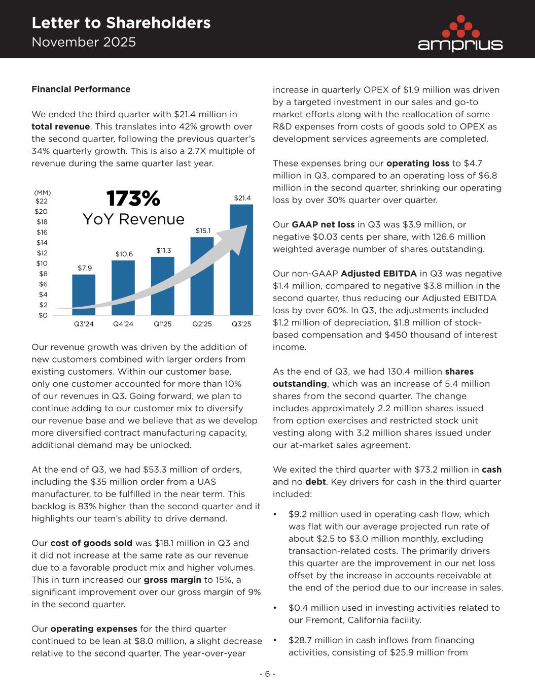 Letter to Shareholders November 2025 - 6 - Financial Performance We ended the third quarter with $21.4 million in total revenue. This translates into 42% growth over the second quarter, following the previous quarter’s 34% quarterly growth. This is also a 2.7X multiple of revenue during the same quarter last year. Our revenue growth was driven by the addition of new customers combined with larger orders from existing customers. Within our customer base, only one customer accounted for more than 10% of our revenues in Q3. Going forward, we plan to continue adding to our customer mix to diversify our revenue base and we believe that as we develop more diversified contract manufacturing capacity, additional demand may be unlocked. At the end of Q3, we had $53.3 million of orders, including the $35 million order from a UAS manufacturer, to be fulfilled in the near term. This backlog is 83% higher than the second quarter and it highlights our team’s ability to drive demand. Our cost of goods sold was $18.1 million in Q3 and it did not increase at the same rate as our revenue due to a favorable product mix and higher volumes. This in turn increased our gross margin to 15%, a significant improvement over our gross margin of 9% in the second quarter. Our operating expenses for the third quarter continued to be lean at $8.0 million, a slight decrease relative to the second quarter. The year-over-year increase in quarterly OPEX of $1.9 million was driven by a targeted investment in our sales and go-to market efforts along with the reallocation of some R&D expenses from costs of goods sold to OPEX as development services agreements are completed. These expenses bring our operating loss to $4.7 million in Q3, compared to an operating loss of $6.8 million in the second quarter, shrinking our operating loss by over 30% quarter over quarter. Our GAAP net loss in Q3 was $3.9 million, or negative $0.03 cents per share, with 126.6 million weighted average number of shares outstanding. Our non-GAAP Adjusted EBITDA in Q3 was negative $1.4 million, compared to negative $3.8 million in the second quarter, thus reducing our Adjusted EBITDA loss by over 60%. In Q3, the adjustments included $1.2 million of depreciation, $1.8 million of stock- based compensation and $450 thousand of interest income. As the end of Q3, we had 130.4 million shares outstanding, which was an increase of 5.4 million shares from the second quarter. The change includes approximately 2.2 million shares issued from option exercises and restricted stock unit vesting along with 3.2 million shares issued under our at-market sales agreement. We exited the third quarter with $73.2 million in cash and no debt. Key drivers for cash in the third quarter included: • $9.2 million used in operating cash flow, which was flat with our average projected run rate of about $2.5 to $3.0 million monthly, excluding transaction-related costs. The primarily drivers this quarter are the improvement in our net loss offset by the increase in accounts receivable at the end of the period due to our increase in sales. • $0.4 million used in investing activities related to our Fremont, California facility. • $28.7 million in cash inflows from financing activities, consisting of $25.9 million from $7.9 $10.6 $11.3 $15.1 $21.4 $0 $2 $4 $6 $8 $10 $12 $14 $16 $18 $20 $22 Q3'24 Q4'24 Q1'25 Q2'25 Q3'25 173% YoY Revenue (MM)
