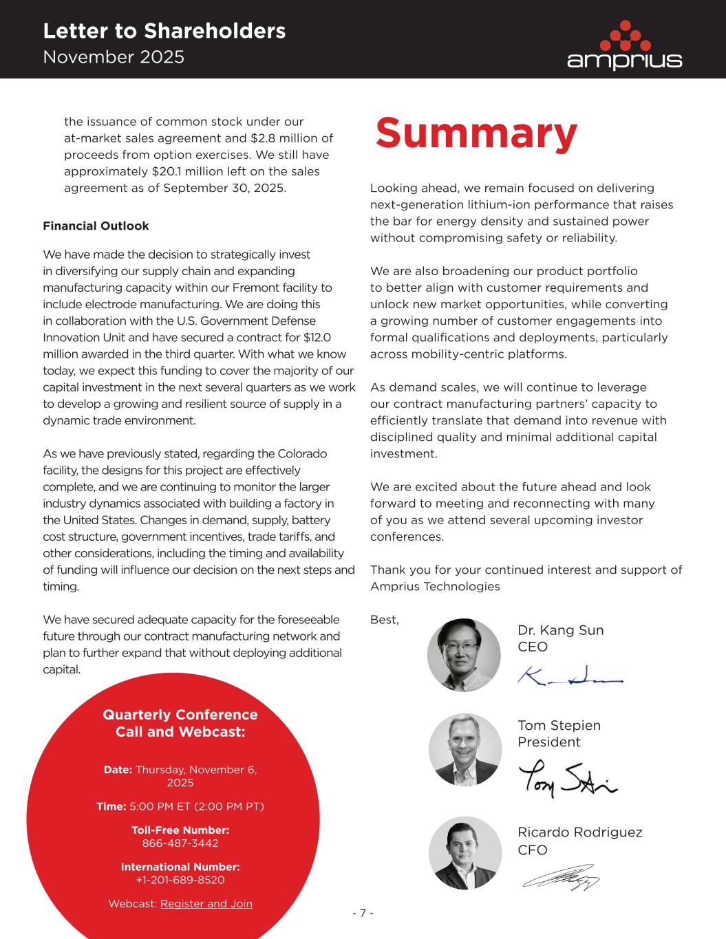 Letter to Shareholders November 2025 - 7 - the issuance of common stock under our at-market sales agreement and $2.8 million of proceeds from option exercises. We still have approximately $20.1 million left on the sales agreement as of September 30, 2025. Financial Outlook We have made the decision to strategically invest in diversifying our supply chain and expanding manufacturing capacity within our Fremont facility to include electrode manufacturing. We are doing this in collaboration with the U.S. Government Defense Innovation Unit and have secured a contract for $12.0 million awarded in the third quarter. With what we know today, we expect this funding to cover the majority of our capital investment in the next several quarters as we work to develop a growing and resilient source of supply in a dynamic trade environment. As we have previously stated, regarding the Colorado facility, the designs for this project are effectively complete, and we are continuing to monitor the larger industry dynamics associated with building a factory in the United States. Changes in demand, supply, battery cost structure, government incentives, trade tariffs, and other considerations, including the timing and availability of funding will influence our decision on the next steps and timing. We have secured adequate capacity for the foreseeable future through our contract manufacturing network and plan to further expand that without deploying additional capital. Looking ahead, we remain focused on delivering next-generation lithium-ion performance that raises the bar for energy density and sustained power without compromising safety or reliability. We are also broadening our product portfolio to better align with customer requirements and unlock new market opportunities, while converting a growing number of customer engagements into formal qualifications and deployments, particularly across mobility-centric platforms. As demand scales, we will continue to leverage our contract manufacturing partners’ capacity to efficiently translate that demand into revenue with disciplined quality and minimal additional capital investment. We are excited about the future ahead and look forward to meeting and reconnecting with many of you as we attend several upcoming investor conferences. Thank you for your continued interest and support of Amprius Technologies Best, Summary Ricardo Rodriguez CFO Dr. Kang Sun CEO Tom Stepien President Quarterly Conference Call and Webcast: Date: Thursday, November 6, 2025 Time: 5:00 PM ET (2:00 PM PT) Toll-Free Number: 866-487-3442 International Number: +1-201-689-8520 Webcast: Register and Join