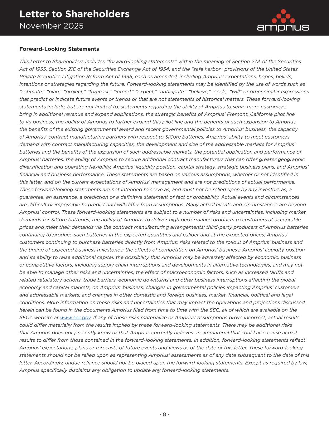 Letter to Shareholders November 2025 - 8 - Forward-Looking Statements This Letter to Shareholders includes “forward-looking statements” within the meaning of Section 27A of the Securities Act of 1933, Section 21E of the Securities Exchange Act of 1934, and the “safe harbor” provisions of the United States Private Securities Litigation Reform Act of 1995, each as amended, including Amprius’ expectations, hopes, beliefs, intentions or strategies regarding the future. Forward-looking statements may be identified by the use of words such as “estimate,” “plan,” “project,” “forecast,” “intend,” “expect,” “anticipate,” “believe,” “seek,” “will” or other similar expressions that predict or indicate future events or trends or that are not statements of historical matters. These forward-looking statements include, but are not limited to, statements regarding the ability of Amprius to serve more customers, bring in additional revenue and expand applications, the strategic benefits of Amprius’ Fremont, California pilot line to its business, the ability of Amprius to further expand this pilot line and the benefits of such expansion to Amprius, the benefits of the existing governmental award and recent governmental policies to Amprius’ business, the capacity of Amprius’ contract manufacturing partners with respect to SiCore batteries, Amprius’ ability to meet customers demand with contract manufacturing capacities, the development and size of the addressable markets for Amprius’ batteries and the benefits of the expansion of such addressable markets, the potential application and performance of Amprius’ batteries, the ability of Amprius to secure additional contract manufacturers that can offer greater geographic diversification and operating flexibility, Amprius’ liquidity position, capital strategy, strategic business plans, and Amprius’ financial and business performance. These statements are based on various assumptions, whether or not identified in this letter, and on the current expectations of Amprius’ management and are not predictions of actual performance. These forward-looking statements are not intended to serve as, and must not be relied upon by any investors as, a guarantee, an assurance, a prediction or a definitive statement of fact or probability. Actual events and circumstances are difficult or impossible to predict and will differ from assumptions. Many actual events and circumstances are beyond Amprius’ control. These forward-looking statements are subject to a number of risks and uncertainties, including market demands for SiCore batteries; the ability of Amprius to deliver high performance products to customers at acceptable prices and meet their demands via the contract manufacturing arrangements; third-party producers of Amprius batteries continuing to produce such batteries in the expected quantities and caliber and at the expected prices; Amprius’ customers continuing to purchase batteries directly from Amprius; risks related to the rollout of Amprius’ business and the timing of expected business milestones; the effects of competition on Amprius’ business; Amprius’ liquidity position and its ability to raise additional capital; the possibility that Amprius may be adversely affected by economic, business or competitive factors, including supply chain interruptions and developments in alternative technologies, and may not be able to manage other risks and uncertainties; the effect of macroeconomic factors, such as increased tariffs and related retaliatory actions, trade barriers, economic downturns and other business interruptions affecting the global economy and capital markets, on Amprius’ business; changes in governmental policies impacting Amprius’ customers and addressable markets; and changes in other domestic and foreign business, market, financial, political and legal conditions. More information on these risks and uncertainties that may impact the operations and projections discussed herein can be found in the documents Amprius filed from time to time with the SEC, all of which are available on the SEC’s website at www.sec.gov. If any of these risks materialize or Amprius’ assumptions prove incorrect, actual results could differ materially from the results implied by these forward-looking statements. There may be additional risks that Amprius does not presently know or that Amprius currently believes are immaterial that could also cause actual results to differ from those contained in the forward-looking statements. In addition, forward-looking statements reflect Amprius’ expectations, plans or forecasts of future events and views as of the date of this letter. These forward-looking statements should not be relied upon as representing Amprius’ assessments as of any date subsequent to the date of this letter. Accordingly, undue reliance should not be placed upon the forward-looking statements. Except as required by law, Amprius specifically disclaims any obligation to update any forward-looking statements.