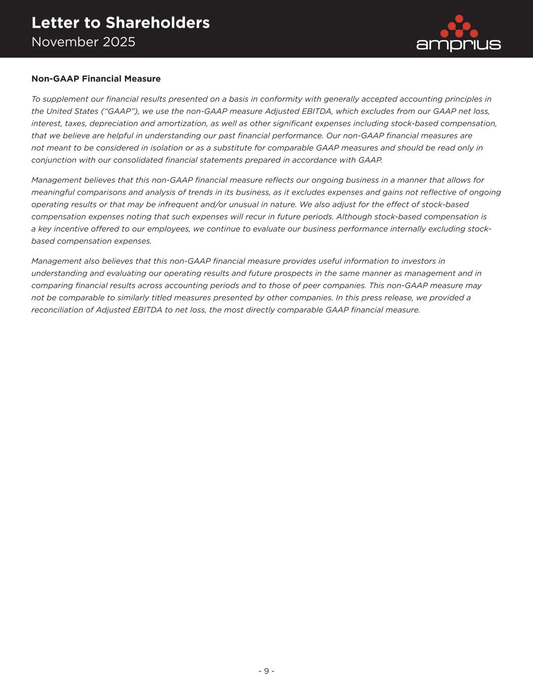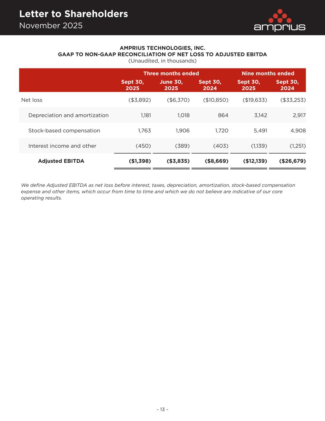Letter to Shareholders November 2025 - 13 - AMPRIUS TECHNOLOGIES, INC. GAAP TO NON-GAAP RECONCILIATION OF NET LOSS TO ADJUSTED EBITDA (Unaudited, in thousands) Three months ended Nine months ended Sept 30, 2025 June 30, 2025 Sept 30, 2024 Sept 30, 2025 Sept 30, 2024 Net loss ($3,892) ($6,370) ($10,850) ($19,633) ($33,253) Depreciation and amortization 1,181 1,018 864 3,142 2,917 Stock-based compensation 1,763 1,906 1,720 5,491 4,908 Interest income and other (450) (389) (403) (1,139) (1,251) Adjusted EBITDA ($1,398) ($3,835) ($8,669) ($12,139) ($26,679) We define Adjusted EBITDA as net loss before interest, taxes, depreciation, amortization, stock-based compensation expense and other items, which occur from time to time and which we do not believe are indicative of our core operating results.