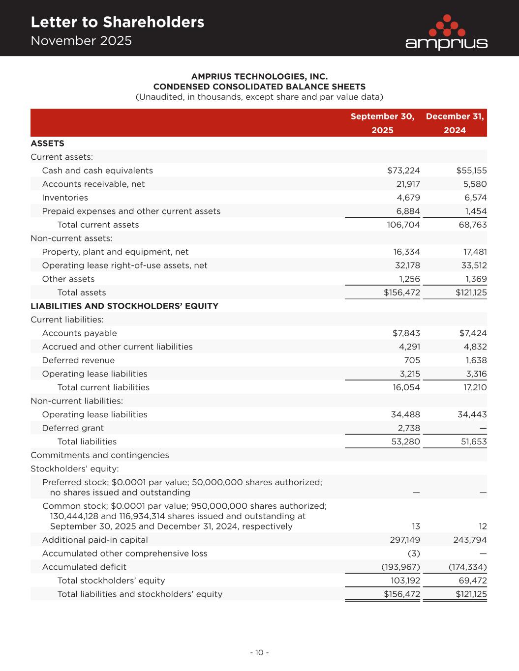 Letter to Shareholders November 2025 - 10 - AMPRIUS TECHNOLOGIES, INC. CONDENSED CONSOLIDATED BALANCE SHEETS (Unaudited, in thousands, except share and par value data) September 30, December 31, 2025 2024 ASSETS Current assets: Cash and cash equivalents $73,224 $55,155 Accounts receivable, net 21,917 5,580 Inventories 4,679 6,574 Prepaid expenses and other current assets 6,884 1,454 Total current assets 106,704 68,763 Non-current assets: Property, plant and equipment, net 16,334 17,481 Operating lease right-of-use assets, net 32,178 33,512 Other assets 1,256 1,369 Total assets $156,472 $121,125 LIABILITIES AND STOCKHOLDERS’ EQUITY Current liabilities: Accounts payable $7,843 $7,424 Accrued and other current liabilities 4,291 4,832 Deferred revenue 705 1,638 Operating lease liabilities 3,215 3,316 Total current liabilities 16,054 17,210 Non-current liabilities: Operating lease liabilities 34,488 34,443 Deferred grant 2,738 — Total liabilities 53,280 51,653 Commitments and contingencies Stockholders’ equity: Preferred stock; $0.0001 par value; 50,000,000 shares authorized; no shares issued and outstanding — — Common stock; $0.0001 par value; 950,000,000 shares authorized; 130,444,128 and 116,934,314 shares issued and outstanding at September 30, 2025 and December 31, 2024, respectively 13 12 Additional paid-in capital 297,149 243,794 Accumulated other comprehensive loss (3) — Accumulated deficit (193,967) (174,334) Total stockholders’ equity 103,192 69,472 Total liabilities and stockholders’ equity $156,472 $121,125
