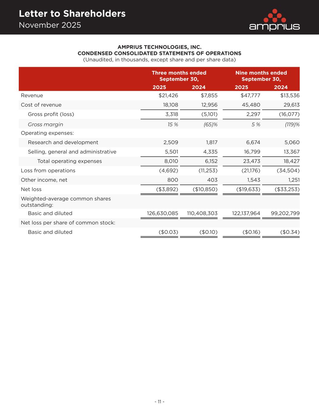 Letter to Shareholders November 2025 - 11 - AMPRIUS TECHNOLOGIES, INC. CONDENSED CONSOLIDATED STATEMENTS OF OPERATIONS (Unaudited, in thousands, except share and per share data) Three months ended September 30, Nine months ended September 30, 2025 2024 2025 2024 Revenue $21,426 $7,855 $47,777 $13,536 Cost of revenue 18,108 12,956 45,480 29,613 Gross profit (loss) 3,318 (5,101) 2,297 (16,077) Gross margin 15 % (65)% 5 % (119)% Operating expenses: Research and development 2,509 1,817 6,674 5,060 Selling, general and administrative 5,501 4,335 16,799 13,367 Total operating expenses 8,010 6,152 23,473 18,427 Loss from operations (4,692) (11,253) (21,176) (34,504) Other income, net 800 403 1,543 1,251 Net loss ($3,892) ($10,850) ($19,633) ($33,253) Weighted-average common shares outstanding: Basic and diluted 126,630,085 110,408,303 122,137,964 99,202,799 Net loss per share of common stock: Basic and diluted ($0.03) ($0.10) ($0.16) ($0.34)