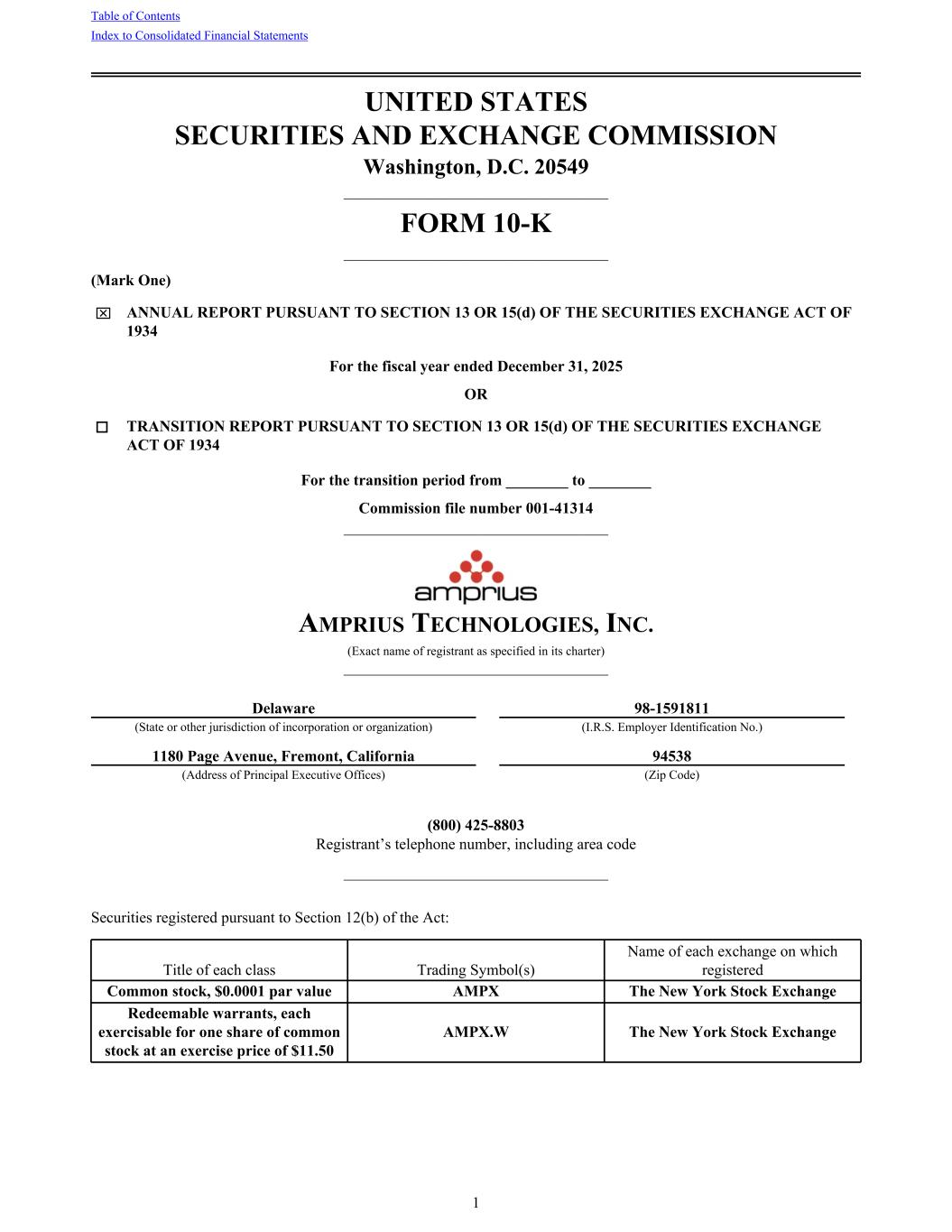 UNITED STATES SECURITIES AND EXCHANGE COMMISSION Washington, D.C. 20549 __________________________________ FORM 10-K __________________________________ (Mark One) x ANNUAL REPORT PURSUANT TO SECTION 13 OR 15(d) OF THE SECURITIES EXCHANGE ACT OF 1934 For the fiscal year ended December 31, 2025 OR o TRANSITION REPORT PURSUANT TO SECTION 13 OR 15(d) OF THE SECURITIES EXCHANGE ACT OF 1934 For the transition period from ________ to ________ Commission file number 001-41314 __________________________________ AMPRIUS TECHNOLOGIES, INC. (Exact name of registrant as specified in its charter) __________________________________ Delaware 98-1591811 (State or other jurisdiction of incorporation or organization) (I.R.S. Employer Identification No.) 1180 Page Avenue, Fremont, California 94538 (Address of Principal Executive Offices) (Zip Code) (800) 425-8803 Registrant’s telephone number, including area code __________________________________ Securities registered pursuant to Section 12(b) of the Act: Title of each class Trading Symbol(s) Name of each exchange on which registered Common stock, $0.0001 par value AMPX The New York Stock Exchange Redeemable warrants, each exercisable for one share of common stock at an exercise price of $11.50 AMPX.W The New York Stock Exchange Table of Contents Index to Consolidated Financial Statements 1