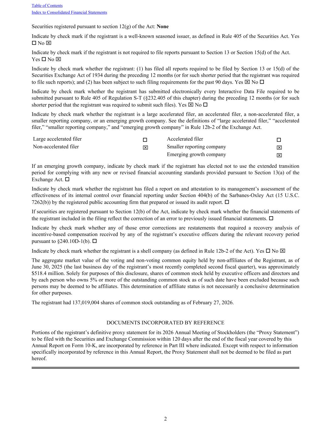 Securities registered pursuant to section 12(g) of the Act: None Indicate by check mark if the registrant is a well-known seasoned issuer, as defined in Rule 405 of the Securities Act. Yes o No x Indicate by check mark if the registrant is not required to file reports pursuant to Section 13 or Section 15(d) of the Act. Yes o No x Indicate by check mark whether the registrant: (1) has filed all reports required to be filed by Section 13 or 15(d) of the Securities Exchange Act of 1934 during the preceding 12 months (or for such shorter period that the registrant was required to file such reports); and (2) has been subject to such filing requirements for the past 90 days. Yes x No o Indicate by check mark whether the registrant has submitted electronically every Interactive Data File required to be submitted pursuant to Rule 405 of Regulation S-T (§232.405 of this chapter) during the preceding 12 months (or for such shorter period that the registrant was required to submit such files). Yes x No o Indicate by check mark whether the registrant is a large accelerated filer, an accelerated filer, a non-accelerated filer, a smaller reporting company, or an emerging growth company. See the definitions of “large accelerated filer,” “accelerated filer,” “smaller reporting company,” and “emerging growth company” in Rule 12b-2 of the Exchange Act. Large accelerated filer o Accelerated filer o Non-accelerated filer x Smaller reporting company x Emerging growth company x If an emerging growth company, indicate by check mark if the registrant has elected not to use the extended transition period for complying with any new or revised financial accounting standards provided pursuant to Section 13(a) of the Exchange Act. o Indicate by check mark whether the registrant has filed a report on and attestation to its management’s assessment of the effectiveness of its internal control over financial reporting under Section 404(b) of the Sarbanes-Oxley Act (15 U.S.C. 7262(b)) by the registered public accounting firm that prepared or issued its audit report. o If securities are registered pursuant to Section 12(b) of the Act, indicate by check mark whether the financial statements of the registrant included in the filing reflect the correction of an error to previously issued financial statements. o Indicate by check mark whether any of those error corrections are restatements that required a recovery analysis of incentive-based compensation received by any of the registrant’s executive officers during the relevant recovery period pursuant to §240.10D-1(b). o Indicate by check mark whether the registrant is a shell company (as defined in Rule 12b-2 of the Act). Yes o No x The aggregate market value of the voting and non-voting common equity held by non-affiliates of the Registrant, as of June 30, 2025 (the last business day of the registrant’s most recently completed second fiscal quarter), was approximately $518.4 million. Solely for purposes of this disclosure, shares of common stock held by executive officers and directors and by each person who owns 5% or more of the outstanding common stock as of such date have been excluded because such persons may be deemed to be affiliates. This determination of affiliate status is not necessarily a conclusive determination for other purposes. The registrant had 137,019,004 shares of common stock outstanding as of February 27, 2026. DOCUMENTS INCORPORATED BY REFERENCE Portions of the registrant’s definitive proxy statement for its 2026 Annual Meeting of Stockholders (the “Proxy Statement”) to be filed with the Securities and Exchange Commission within 120 days after the end of the fiscal year covered by this Annual Report on Form 10-K, are incorporated by reference in Part III where indicated. Except with respect to information specifically incorporated by reference in this Annual Report, the Proxy Statement shall not be deemed to be filed as part hereof. Table of Contents Index to Consolidated Financial Statements 2