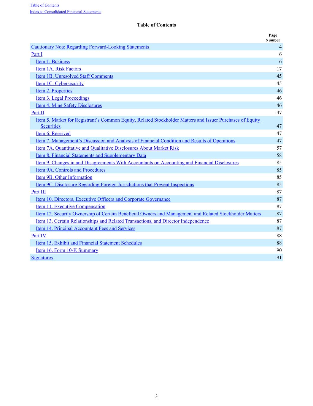 Table of Contents Page Number Cautionary Note Regarding Forward-Looking Statements 4 Part I 6 Item 1. Business 6 Item 1A. Risk Factors 17 Item 1B. Unresolved Staff Comments 45 Item 1C. Cybersecurity 45 Item 2. Properties 46 Item 3. Legal Proceedings 46 Item 4. Mine Safety Disclosures 46 Part II 47 Item 5. Market for Registrant’s Common Equity, Related Stockholder Matters and Issuer Purchases of Equity Securities 47 Item 6. Reserved 47 Item 7. Management’s Discussion and Analysis of Financial Condition and Results of Operations 47 Item 7A. Quantitative and Qualitative Disclosures About Market Risk 57 Item 8. Financial Statements and Supplementary Data 58 Item 9. Changes in and Disagreements With Accountants on Accounting and Financial Disclosures 85 Item 9A. Controls and Procedures 85 Item 9B. Other Information 85 Item 9C. Disclosure Regarding Foreign Jurisdictions that Prevent Inspections 85 Part III 87 Item 10. Directors, Executive Officers and Corporate Governance 87 Item 11. Executive Compensation 87 Item 12. Security Ownership of Certain Beneficial Owners and Management and Related Stockholder Matters 87 Item 13. Certain Relationships and Related Transactions, and Director Independence 87 Item 14. Principal Accountant Fees and Services 87 Part IV 88 Item 15. Exhibit and Financial Statement Schedules 88 Item 16. Form 10-K Summary 90 Signatures 91 Table of Contents Index to Consolidated Financial Statements 3