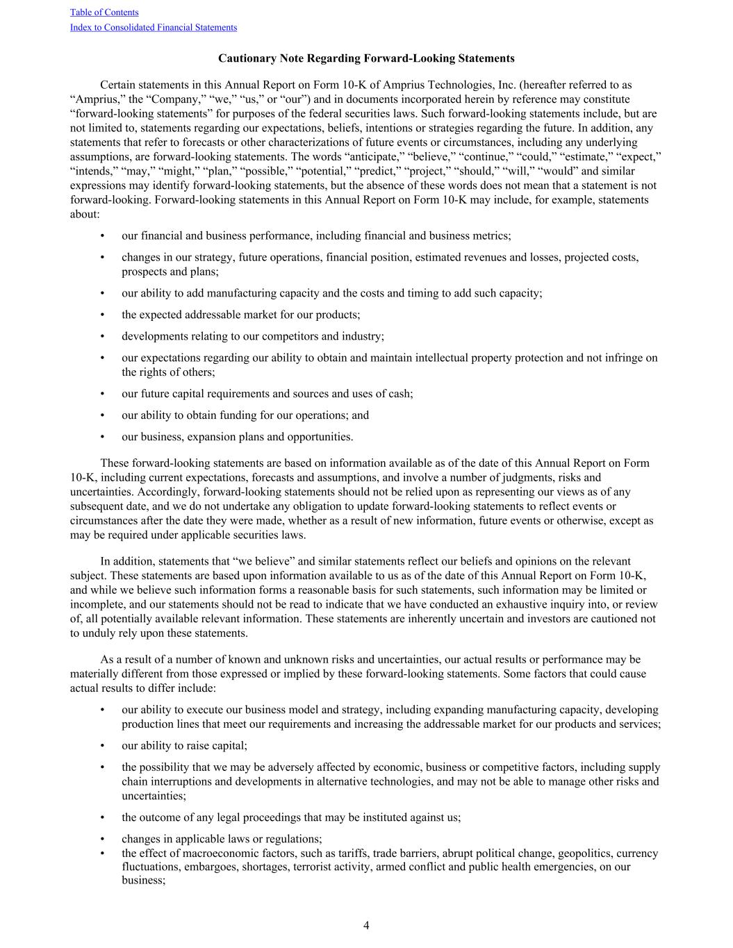 Cautionary Note Regarding Forward-Looking Statements Certain statements in this Annual Report on Form 10-K of Amprius Technologies, Inc. (hereafter referred to as “Amprius,” the “Company,” “we,” “us,” or “our”) and in documents incorporated herein by reference may constitute “forward-looking statements” for purposes of the federal securities laws. Such forward-looking statements include, but are not limited to, statements regarding our expectations, beliefs, intentions or strategies regarding the future. In addition, any statements that refer to forecasts or other characterizations of future events or circumstances, including any underlying assumptions, are forward-looking statements. The words “anticipate,” “believe,” “continue,” “could,” “estimate,” “expect,” “intends,” “may,” “might,” “plan,” “possible,” “potential,” “predict,” “project,” “should,” “will,” “would” and similar expressions may identify forward-looking statements, but the absence of these words does not mean that a statement is not forward-looking. Forward-looking statements in this Annual Report on Form 10-K may include, for example, statements about: • our financial and business performance, including financial and business metrics; • changes in our strategy, future operations, financial position, estimated revenues and losses, projected costs, prospects and plans; • our ability to add manufacturing capacity and the costs and timing to add such capacity; • the expected addressable market for our products; • developments relating to our competitors and industry; • our expectations regarding our ability to obtain and maintain intellectual property protection and not infringe on the rights of others; • our future capital requirements and sources and uses of cash; • our ability to obtain funding for our operations; and • our business, expansion plans and opportunities. These forward-looking statements are based on information available as of the date of this Annual Report on Form 10-K, including current expectations, forecasts and assumptions, and involve a number of judgments, risks and uncertainties. Accordingly, forward-looking statements should not be relied upon as representing our views as of any subsequent date, and we do not undertake any obligation to update forward-looking statements to reflect events or circumstances after the date they were made, whether as a result of new information, future events or otherwise, except as may be required under applicable securities laws. In addition, statements that “we believe” and similar statements reflect our beliefs and opinions on the relevant subject. These statements are based upon information available to us as of the date of this Annual Report on Form 10-K, and while we believe such information forms a reasonable basis for such statements, such information may be limited or incomplete, and our statements should not be read to indicate that we have conducted an exhaustive inquiry into, or review of, all potentially available relevant information. These statements are inherently uncertain and investors are cautioned not to unduly rely upon these statements. As a result of a number of known and unknown risks and uncertainties, our actual results or performance may be materially different from those expressed or implied by these forward-looking statements. Some factors that could cause actual results to differ include: • our ability to execute our business model and strategy, including expanding manufacturing capacity, developing production lines that meet our requirements and increasing the addressable market for our products and services; • our ability to raise capital; • the possibility that we may be adversely affected by economic, business or competitive factors, including supply chain interruptions and developments in alternative technologies, and may not be able to manage other risks and uncertainties; • the outcome of any legal proceedings that may be instituted against us; • changes in applicable laws or regulations; • the effect of macroeconomic factors, such as tariffs, trade barriers, abrupt political change, geopolitics, currency fluctuations, embargoes, shortages, terrorist activity, armed conflict and public health emergencies, on our business; Table of Contents Index to Consolidated Financial Statements 4