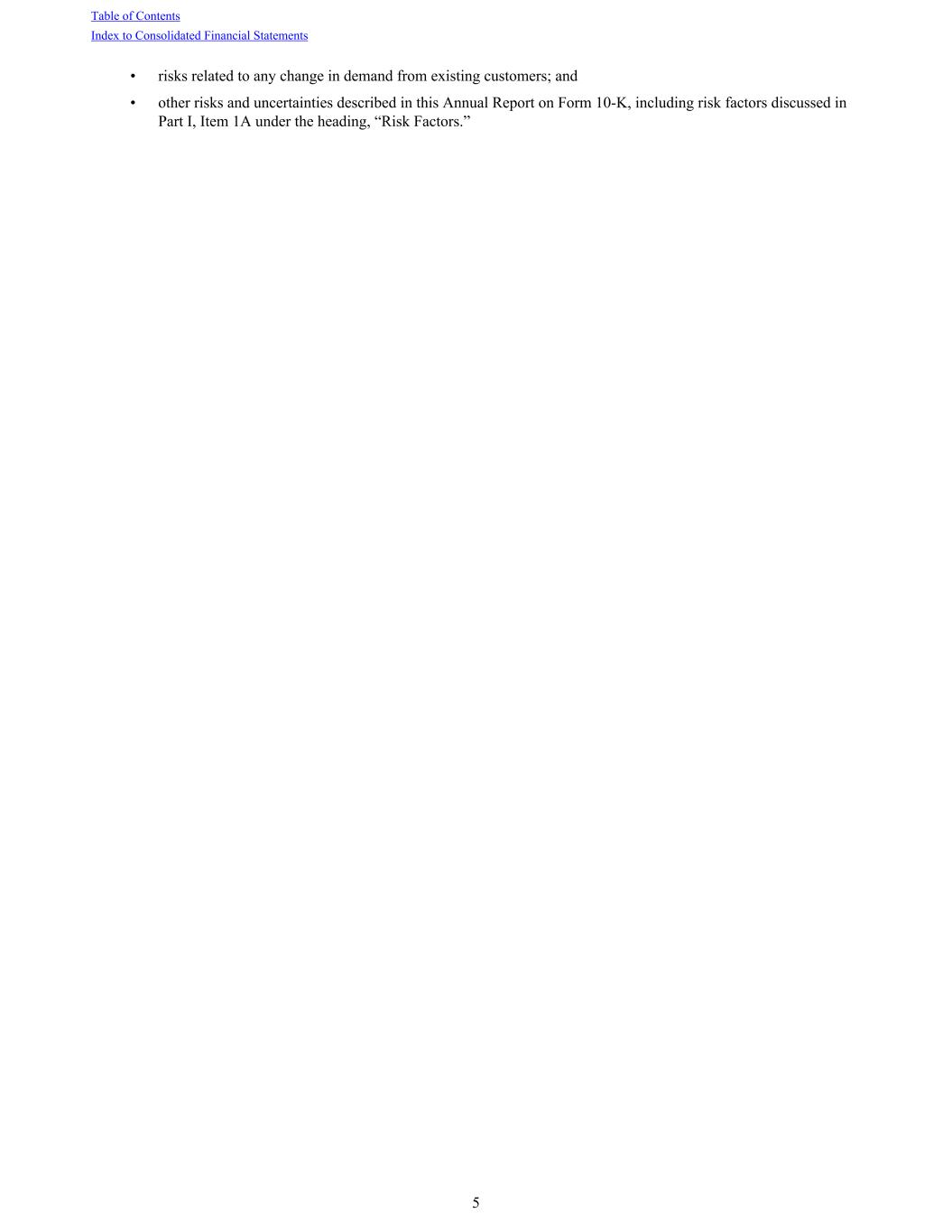 • risks related to any change in demand from existing customers; and • other risks and uncertainties described in this Annual Report on Form 10-K, including risk factors discussed in Part I, Item 1A under the heading, “Risk Factors.” Table of Contents Index to Consolidated Financial Statements 5