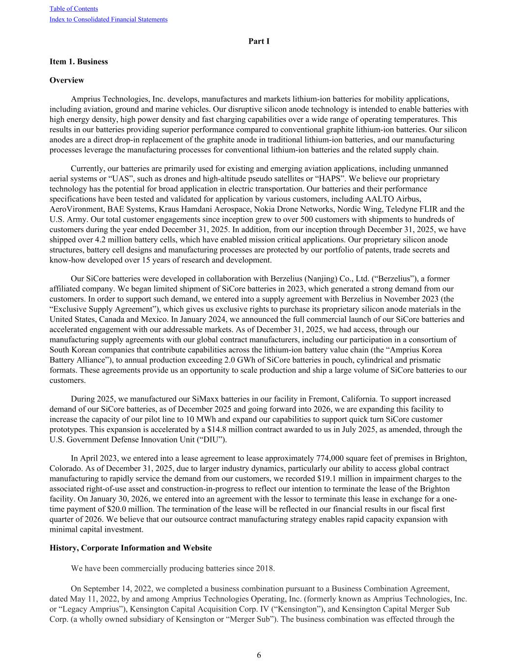 Part I Item 1. Business Overview Amprius Technologies, Inc. develops, manufactures and markets lithium-ion batteries for mobility applications, including aviation, ground and marine vehicles. Our disruptive silicon anode technology is intended to enable batteries with high energy density, high power density and fast charging capabilities over a wide range of operating temperatures. This results in our batteries providing superior performance compared to conventional graphite lithium-ion batteries. Our silicon anodes are a direct drop-in replacement of the graphite anode in traditional lithium-ion batteries, and our manufacturing processes leverage the manufacturing processes for conventional lithium-ion batteries and the related supply chain. Currently, our batteries are primarily used for existing and emerging aviation applications, including unmanned aerial systems or “UAS”, such as drones and high-altitude pseudo satellites or “HAPS”. We believe our proprietary technology has the potential for broad application in electric transportation. Our batteries and their performance specifications have been tested and validated for application by various customers, including AALTO Airbus, AeroVironment, BAE Systems, Kraus Hamdani Aerospace, Nokia Drone Networks, Nordic Wing, Teledyne FLIR and the U.S. Army. Our total customer engagements since inception grew to over 500 customers with shipments to hundreds of customers during the year ended December 31, 2025. In addition, from our inception through December 31, 2025, we have shipped over 4.2 million battery cells, which have enabled mission critical applications. Our proprietary silicon anode structures, battery cell designs and manufacturing processes are protected by our portfolio of patents, trade secrets and know-how developed over 15 years of research and development. Our SiCore batteries were developed in collaboration with Berzelius (Nanjing) Co., Ltd. (“Berzelius”), a former affiliated company. We began limited shipment of SiCore batteries in 2023, which generated a strong demand from our customers. In order to support such demand, we entered into a supply agreement with Berzelius in November 2023 (the “Exclusive Supply Agreement”), which gives us exclusive rights to purchase its proprietary silicon anode materials in the United States, Canada and Mexico. In January 2024, we announced the full commercial launch of our SiCore batteries and accelerated engagement with our addressable markets. As of December 31, 2025, we had access, through our manufacturing supply agreements with our global contract manufacturers, including our participation in a consortium of South Korean companies that contribute capabilities across the lithium-ion battery value chain (the “Amprius Korea Battery Alliance”), to annual production exceeding 2.0 GWh of SiCore batteries in pouch, cylindrical and prismatic formats. These agreements provide us an opportunity to scale production and ship a large volume of SiCore batteries to our customers. During 2025, we manufactured our SiMaxx batteries in our facility in Fremont, California. To support increased demand of our SiCore batteries, as of December 2025 and going forward into 2026, we are expanding this facility to increase the capacity of our pilot line to 10 MWh and expand our capabilities to support quick turn SiCore customer prototypes. This expansion is accelerated by a $14.8 million contract awarded to us in July 2025, as amended, through the U.S. Government Defense Innovation Unit (“DIU”). In April 2023, we entered into a lease agreement to lease approximately 774,000 square feet of premises in Brighton, Colorado. As of December 31, 2025, due to larger industry dynamics, particularly our ability to access global contract manufacturing to rapidly service the demand from our customers, we recorded $19.1 million in impairment charges to the associated right-of-use asset and construction-in-progress to reflect our intention to terminate the lease of the Brighton facility. On January 30, 2026, we entered into an agreement with the lessor to terminate this lease in exchange for a one- time payment of $20.0 million. The termination of the lease will be reflected in our financial results in our fiscal first quarter of 2026. We believe that our outsource contract manufacturing strategy enables rapid capacity expansion with minimal capital investment. History, Corporate Information and Website We have been commercially producing batteries since 2018. On September 14, 2022, we completed a business combination pursuant to a Business Combination Agreement, dated May 11, 2022, by and among Amprius Technologies Operating, Inc. (formerly known as Amprius Technologies, Inc. or “Legacy Amprius”), Kensington Capital Acquisition Corp. IV (“Kensington”), and Kensington Capital Merger Sub Corp. (a wholly owned subsidiary of Kensington or “Merger Sub”). The business combination was effected through the Table of Contents Index to Consolidated Financial Statements 6