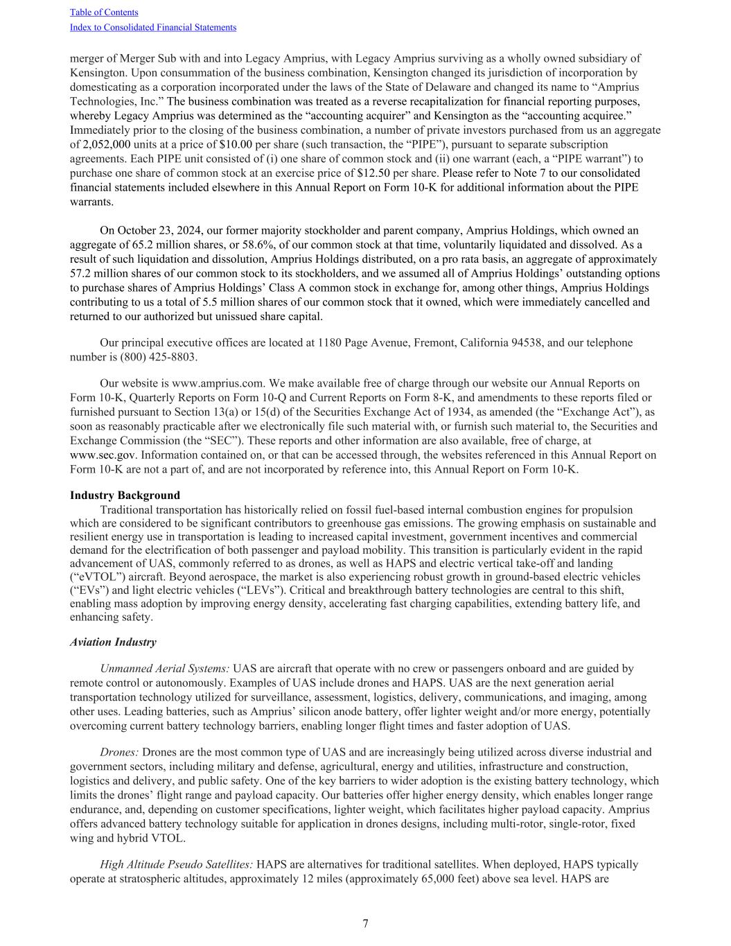 merger of Merger Sub with and into Legacy Amprius, with Legacy Amprius surviving as a wholly owned subsidiary of Kensington. Upon consummation of the business combination, Kensington changed its jurisdiction of incorporation by domesticating as a corporation incorporated under the laws of the State of Delaware and changed its name to “Amprius Technologies, Inc.” The business combination was treated as a reverse recapitalization for financial reporting purposes, whereby Legacy Amprius was determined as the “accounting acquirer” and Kensington as the “accounting acquiree.” Immediately prior to the closing of the business combination, a number of private investors purchased from us an aggregate of 2,052,000 units at a price of $10.00 per share (such transaction, the “PIPE”), pursuant to separate subscription agreements. Each PIPE unit consisted of (i) one share of common stock and (ii) one warrant (each, a “PIPE warrant”) to purchase one share of common stock at an exercise price of $12.50 per share. Please refer to Note 7 to our consolidated financial statements included elsewhere in this Annual Report on Form 10-K for additional information about the PIPE warrants. On October 23, 2024, our former majority stockholder and parent company, Amprius Holdings, which owned an aggregate of 65.2 million shares, or 58.6%, of our common stock at that time, voluntarily liquidated and dissolved. As a result of such liquidation and dissolution, Amprius Holdings distributed, on a pro rata basis, an aggregate of approximately 57.2 million shares of our common stock to its stockholders, and we assumed all of Amprius Holdings’ outstanding options to purchase shares of Amprius Holdings’ Class A common stock in exchange for, among other things, Amprius Holdings contributing to us a total of 5.5 million shares of our common stock that it owned, which were immediately cancelled and returned to our authorized but unissued share capital. Our principal executive offices are located at 1180 Page Avenue, Fremont, California 94538, and our telephone number is (800) 425-8803. Our website is www.amprius.com. We make available free of charge through our website our Annual Reports on Form 10-K, Quarterly Reports on Form 10-Q and Current Reports on Form 8-K, and amendments to these reports filed or furnished pursuant to Section 13(a) or 15(d) of the Securities Exchange Act of 1934, as amended (the “Exchange Act”), as soon as reasonably practicable after we electronically file such material with, or furnish such material to, the Securities and Exchange Commission (the “SEC”). These reports and other information are also available, free of charge, at www.sec.gov. Information contained on, or that can be accessed through, the websites referenced in this Annual Report on Form 10-K are not a part of, and are not incorporated by reference into, this Annual Report on Form 10-K. Industry Background Traditional transportation has historically relied on fossil fuel-based internal combustion engines for propulsion which are considered to be significant contributors to greenhouse gas emissions. The growing emphasis on sustainable and resilient energy use in transportation is leading to increased capital investment, government incentives and commercial demand for the electrification of both passenger and payload mobility. This transition is particularly evident in the rapid advancement of UAS, commonly referred to as drones, as well as HAPS and electric vertical take-off and landing (“eVTOL”) aircraft. Beyond aerospace, the market is also experiencing robust growth in ground-based electric vehicles (“EVs”) and light electric vehicles (“LEVs”). Critical and breakthrough battery technologies are central to this shift, enabling mass adoption by improving energy density, accelerating fast charging capabilities, extending battery life, and enhancing safety. Aviation Industry Unmanned Aerial Systems: UAS are aircraft that operate with no crew or passengers onboard and are guided by remote control or autonomously. Examples of UAS include drones and HAPS. UAS are the next generation aerial transportation technology utilized for surveillance, assessment, logistics, delivery, communications, and imaging, among other uses. Leading batteries, such as Amprius’ silicon anode battery, offer lighter weight and/or more energy, potentially overcoming current battery technology barriers, enabling longer flight times and faster adoption of UAS. Drones: Drones are the most common type of UAS and are increasingly being utilized across diverse industrial and government sectors, including military and defense, agricultural, energy and utilities, infrastructure and construction, logistics and delivery, and public safety. One of the key barriers to wider adoption is the existing battery technology, which limits the drones’ flight range and payload capacity. Our batteries offer higher energy density, which enables longer range endurance, and, depending on customer specifications, lighter weight, which facilitates higher payload capacity. Amprius offers advanced battery technology suitable for application in drones designs, including multi-rotor, single-rotor, fixed wing and hybrid VTOL. High Altitude Pseudo Satellites: HAPS are alternatives for traditional satellites. When deployed, HAPS typically operate at stratospheric altitudes, approximately 12 miles (approximately 65,000 feet) above sea level. HAPS are Table of Contents Index to Consolidated Financial Statements 7