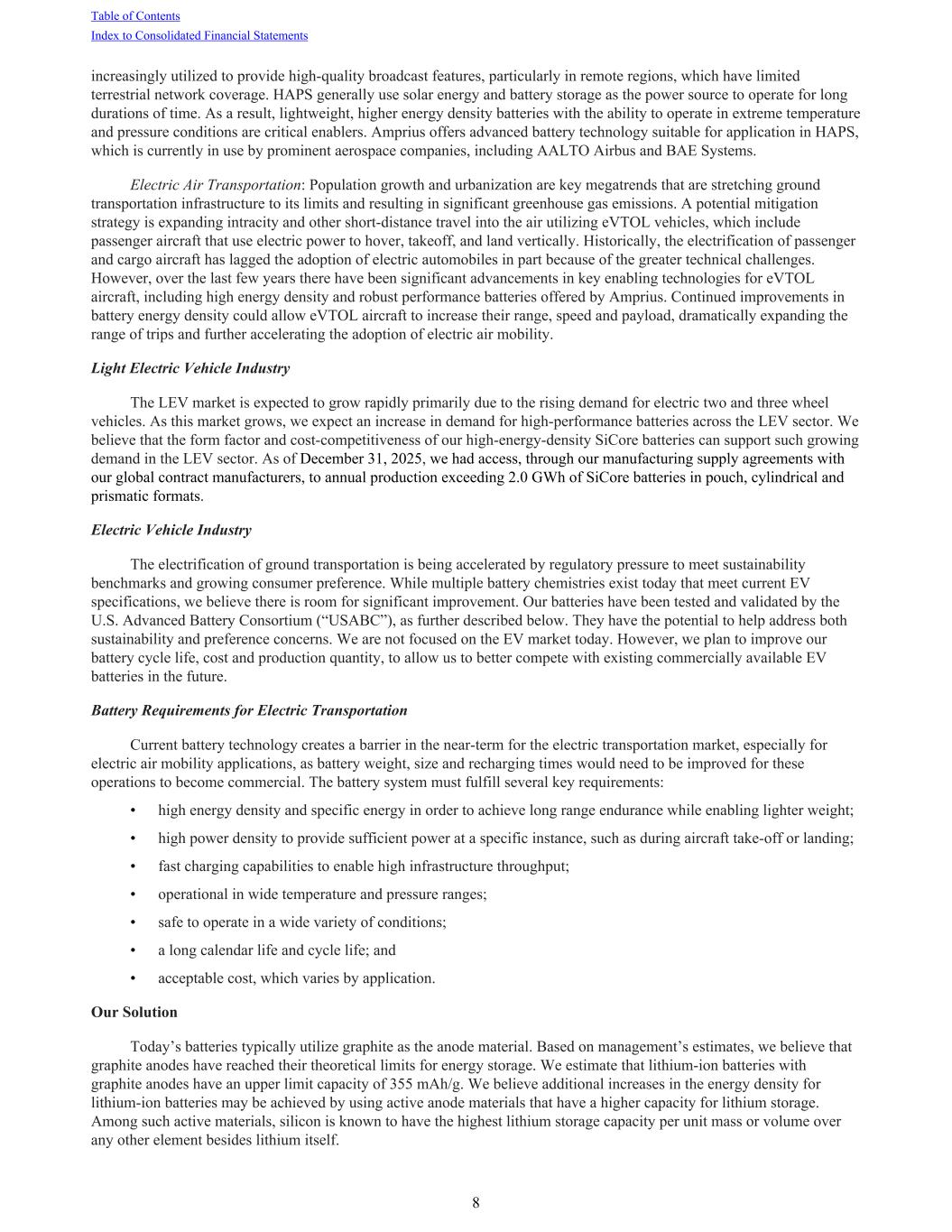 increasingly utilized to provide high-quality broadcast features, particularly in remote regions, which have limited terrestrial network coverage. HAPS generally use solar energy and battery storage as the power source to operate for long durations of time. As a result, lightweight, higher energy density batteries with the ability to operate in extreme temperature and pressure conditions are critical enablers. Amprius offers advanced battery technology suitable for application in HAPS, which is currently in use by prominent aerospace companies, including AALTO Airbus and BAE Systems. Electric Air Transportation: Population growth and urbanization are key megatrends that are stretching ground transportation infrastructure to its limits and resulting in significant greenhouse gas emissions. A potential mitigation strategy is expanding intracity and other short-distance travel into the air utilizing eVTOL vehicles, which include passenger aircraft that use electric power to hover, takeoff, and land vertically. Historically, the electrification of passenger and cargo aircraft has lagged the adoption of electric automobiles in part because of the greater technical challenges. However, over the last few years there have been significant advancements in key enabling technologies for eVTOL aircraft, including high energy density and robust performance batteries offered by Amprius. Continued improvements in battery energy density could allow eVTOL aircraft to increase their range, speed and payload, dramatically expanding the range of trips and further accelerating the adoption of electric air mobility. Light Electric Vehicle Industry The LEV market is expected to grow rapidly primarily due to the rising demand for electric two and three wheel vehicles. As this market grows, we expect an increase in demand for high-performance batteries across the LEV sector. We believe that the form factor and cost-competitiveness of our high-energy-density SiCore batteries can support such growing demand in the LEV sector. As of December 31, 2025, we had access, through our manufacturing supply agreements with our global contract manufacturers, to annual production exceeding 2.0 GWh of SiCore batteries in pouch, cylindrical and prismatic formats. Electric Vehicle Industry The electrification of ground transportation is being accelerated by regulatory pressure to meet sustainability benchmarks and growing consumer preference. While multiple battery chemistries exist today that meet current EV specifications, we believe there is room for significant improvement. Our batteries have been tested and validated by the U.S. Advanced Battery Consortium (“USABC”), as further described below. They have the potential to help address both sustainability and preference concerns. We are not focused on the EV market today. However, we plan to improve our battery cycle life, cost and production quantity, to allow us to better compete with existing commercially available EV batteries in the future. Battery Requirements for Electric Transportation Current battery technology creates a barrier in the near-term for the electric transportation market, especially for electric air mobility applications, as battery weight, size and recharging times would need to be improved for these operations to become commercial. The battery system must fulfill several key requirements: • high energy density and specific energy in order to achieve long range endurance while enabling lighter weight; • high power density to provide sufficient power at a specific instance, such as during aircraft take-off or landing; • fast charging capabilities to enable high infrastructure throughput; • operational in wide temperature and pressure ranges; • safe to operate in a wide variety of conditions; • a long calendar life and cycle life; and • acceptable cost, which varies by application. Our Solution Today’s batteries typically utilize graphite as the anode material. Based on management’s estimates, we believe that graphite anodes have reached their theoretical limits for energy storage. We estimate that lithium-ion batteries with graphite anodes have an upper limit capacity of 355 mAh/g. We believe additional increases in the energy density for lithium-ion batteries may be achieved by using active anode materials that have a higher capacity for lithium storage. Among such active materials, silicon is known to have the highest lithium storage capacity per unit mass or volume over any other element besides lithium itself. Table of Contents Index to Consolidated Financial Statements 8