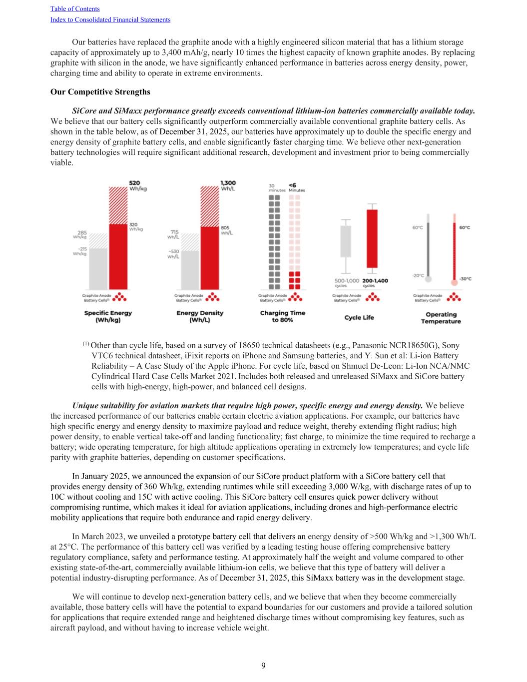Our batteries have replaced the graphite anode with a highly engineered silicon material that has a lithium storage capacity of approximately up to 3,400 mAh/g, nearly 10 times the highest capacity of known graphite anodes. By replacing graphite with silicon in the anode, we have significantly enhanced performance in batteries across energy density, power, charging time and ability to operate in extreme environments. Our Competitive Strengths SiCore and SiMaxx performance greatly exceeds conventional lithium-ion batteries commercially available today. We believe that our battery cells significantly outperform commercially available conventional graphite battery cells. As shown in the table below, as of December 31, 2025, our batteries have approximately up to double the specific energy and energy density of graphite battery cells, and enable significantly faster charging time. We believe other next-generation battery technologies will require significant additional research, development and investment prior to being commercially viable. (1) Other than cycle life, based on a survey of 18650 technical datasheets (e.g., Panasonic NCR18650G), Sony VTC6 technical datasheet, iFixit reports on iPhone and Samsung batteries, and Y. Sun et al: Li-ion Battery Reliability – A Case Study of the Apple iPhone. For cycle life, based on Shmuel De-Leon: Li-Ion NCA/NMC Cylindrical Hard Case Cells Market 2021. Includes both released and unreleased SiMaxx and SiCore battery cells with high-energy, high-power, and balanced cell designs. Unique suitability for aviation markets that require high power, specific energy and energy density. We believe the increased performance of our batteries enable certain electric aviation applications. For example, our batteries have high specific energy and energy density to maximize payload and reduce weight, thereby extending flight radius; high power density, to enable vertical take-off and landing functionality; fast charge, to minimize the time required to recharge a battery; wide operating temperature, for high altitude applications operating in extremely low temperatures; and cycle life parity with graphite batteries, depending on customer specifications. In January 2025, we announced the expansion of our SiCore product platform with a SiCore battery cell that provides energy density of 360 Wh/kg, extending runtimes while still exceeding 3,000 W/kg, with discharge rates of up to 10C without cooling and 15C with active cooling. This SiCore battery cell ensures quick power delivery without compromising runtime, which makes it ideal for aviation applications, including drones and high-performance electric mobility applications that require both endurance and rapid energy delivery. In March 2023, we unveiled a prototype battery cell that delivers an energy density of >500 Wh/kg and >1,300 Wh/L at 25°C. The performance of this battery cell was verified by a leading testing house offering comprehensive battery regulatory compliance, safety and performance testing. At approximately half the weight and volume compared to other existing state-of-the-art, commercially available lithium-ion cells, we believe that this type of battery will deliver a potential industry-disrupting performance. As of December 31, 2025, this SiMaxx battery was in the development stage. We will continue to develop next-generation battery cells, and we believe that when they become commercially available, those battery cells will have the potential to expand boundaries for our customers and provide a tailored solution for applications that require extended range and heightened discharge times without compromising key features, such as aircraft payload, and without having to increase vehicle weight. Table of Contents Index to Consolidated Financial Statements 9