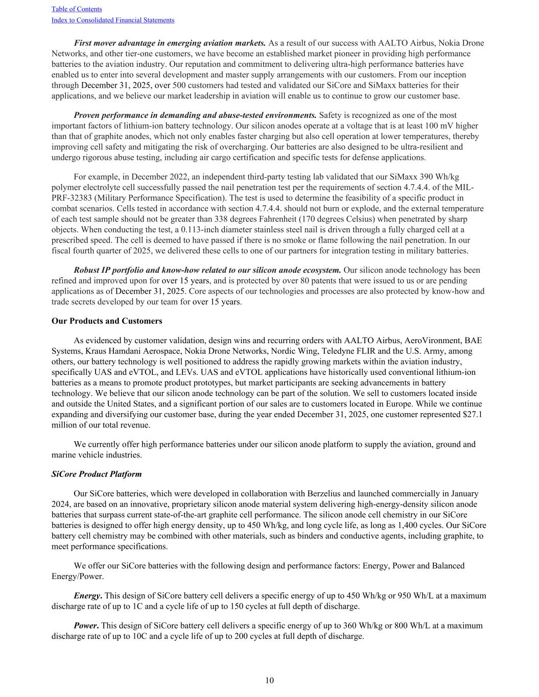 First mover advantage in emerging aviation markets. As a result of our success with AALTO Airbus, Nokia Drone Networks, and other tier-one customers, we have become an established market pioneer in providing high performance batteries to the aviation industry. Our reputation and commitment to delivering ultra-high performance batteries have enabled us to enter into several development and master supply arrangements with our customers. From our inception through December 31, 2025, over 500 customers had tested and validated our SiCore and SiMaxx batteries for their applications, and we believe our market leadership in aviation will enable us to continue to grow our customer base. Proven performance in demanding and abuse-tested environments. Safety is recognized as one of the most important factors of lithium-ion battery technology. Our silicon anodes operate at a voltage that is at least 100 mV higher than that of graphite anodes, which not only enables faster charging but also cell operation at lower temperatures, thereby improving cell safety and mitigating the risk of overcharging. Our batteries are also designed to be ultra-resilient and undergo rigorous abuse testing, including air cargo certification and specific tests for defense applications. For example, in December 2022, an independent third-party testing lab validated that our SiMaxx 390 Wh/kg polymer electrolyte cell successfully passed the nail penetration test per the requirements of section 4.7.4.4. of the MIL- PRF-32383 (Military Performance Specification). The test is used to determine the feasibility of a specific product in combat scenarios. Cells tested in accordance with section 4.7.4.4. should not burn or explode, and the external temperature of each test sample should not be greater than 338 degrees Fahrenheit (170 degrees Celsius) when penetrated by sharp objects. When conducting the test, a 0.113-inch diameter stainless steel nail is driven through a fully charged cell at a prescribed speed. The cell is deemed to have passed if there is no smoke or flame following the nail penetration. In our fiscal fourth quarter of 2025, we delivered these cells to one of our partners for integration testing in military batteries. Robust IP portfolio and know-how related to our silicon anode ecosystem. Our silicon anode technology has been refined and improved upon for over 15 years, and is protected by over 80 patents that were issued to us or are pending applications as of December 31, 2025. Core aspects of our technologies and processes are also protected by know-how and trade secrets developed by our team for over 15 years. Our Products and Customers As evidenced by customer validation, design wins and recurring orders with AALTO Airbus, AeroVironment, BAE Systems, Kraus Hamdani Aerospace, Nokia Drone Networks, Nordic Wing, Teledyne FLIR and the U.S. Army, among others, our battery technology is well positioned to address the rapidly growing markets within the aviation industry, specifically UAS and eVTOL, and LEVs. UAS and eVTOL applications have historically used conventional lithium-ion batteries as a means to promote product prototypes, but market participants are seeking advancements in battery technology. We believe that our silicon anode technology can be part of the solution. We sell to customers located inside and outside the United States, and a significant portion of our sales are to customers located in Europe. While we continue expanding and diversifying our customer base, during the year ended December 31, 2025, one customer represented $27.1 million of our total revenue. We currently offer high performance batteries under our silicon anode platform to supply the aviation, ground and marine vehicle industries. SiCore Product Platform Our SiCore batteries, which were developed in collaboration with Berzelius and launched commercially in January 2024, are based on an innovative, proprietary silicon anode material system delivering high-energy-density silicon anode batteries that surpass current state-of-the-art graphite cell performance. The silicon anode cell chemistry in our SiCore batteries is designed to offer high energy density, up to 450 Wh/kg, and long cycle life, as long as 1,400 cycles. Our SiCore battery cell chemistry may be combined with other materials, such as binders and conductive agents, including graphite, to meet performance specifications. We offer our SiCore batteries with the following design and performance factors: Energy, Power and Balanced Energy/Power. Energy. This design of SiCore battery cell delivers a specific energy of up to 450 Wh/kg or 950 Wh/L at a maximum discharge rate of up to 1C and a cycle life of up to 150 cycles at full depth of discharge. Power. This design of SiCore battery cell delivers a specific energy of up to 360 Wh/kg or 800 Wh/L at a maximum discharge rate of up to 10C and a cycle life of up to 200 cycles at full depth of discharge. Table of Contents Index to Consolidated Financial Statements 10