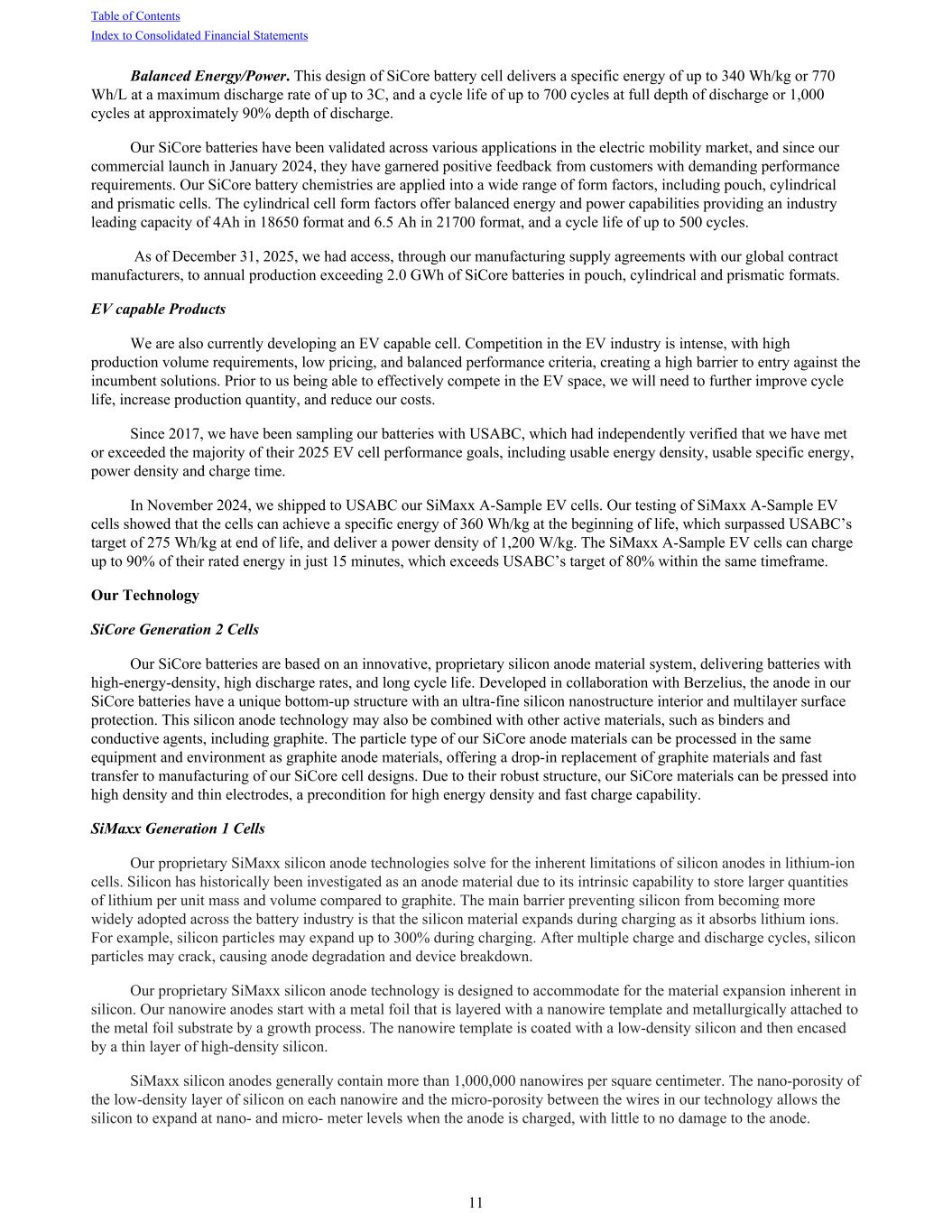 Balanced Energy/Power. This design of SiCore battery cell delivers a specific energy of up to 340 Wh/kg or 770 Wh/L at a maximum discharge rate of up to 3C, and a cycle life of up to 700 cycles at full depth of discharge or 1,000 cycles at approximately 90% depth of discharge. Our SiCore batteries have been validated across various applications in the electric mobility market, and since our commercial launch in January 2024, they have garnered positive feedback from customers with demanding performance requirements. Our SiCore battery chemistries are applied into a wide range of form factors, including pouch, cylindrical and prismatic cells. The cylindrical cell form factors offer balanced energy and power capabilities providing an industry leading capacity of 4Ah in 18650 format and 6.5 Ah in 21700 format, and a cycle life of up to 500 cycles. As of December 31, 2025, we had access, through our manufacturing supply agreements with our global contract manufacturers, to annual production exceeding 2.0 GWh of SiCore batteries in pouch, cylindrical and prismatic formats. EV capable Products We are also currently developing an EV capable cell. Competition in the EV industry is intense, with high production volume requirements, low pricing, and balanced performance criteria, creating a high barrier to entry against the incumbent solutions. Prior to us being able to effectively compete in the EV space, we will need to further improve cycle life, increase production quantity, and reduce our costs. Since 2017, we have been sampling our batteries with USABC, which had independently verified that we have met or exceeded the majority of their 2025 EV cell performance goals, including usable energy density, usable specific energy, power density and charge time. In November 2024, we shipped to USABC our SiMaxx A-Sample EV cells. Our testing of SiMaxx A-Sample EV cells showed that the cells can achieve a specific energy of 360 Wh/kg at the beginning of life, which surpassed USABC’s target of 275 Wh/kg at end of life, and deliver a power density of 1,200 W/kg. The SiMaxx A-Sample EV cells can charge up to 90% of their rated energy in just 15 minutes, which exceeds USABC’s target of 80% within the same timeframe. Our Technology SiCore Generation 2 Cells Our SiCore batteries are based on an innovative, proprietary silicon anode material system, delivering batteries with high-energy-density, high discharge rates, and long cycle life. Developed in collaboration with Berzelius, the anode in our SiCore batteries have a unique bottom-up structure with an ultra-fine silicon nanostructure interior and multilayer surface protection. This silicon anode technology may also be combined with other active materials, such as binders and conductive agents, including graphite. The particle type of our SiCore anode materials can be processed in the same equipment and environment as graphite anode materials, offering a drop-in replacement of graphite materials and fast transfer to manufacturing of our SiCore cell designs. Due to their robust structure, our SiCore materials can be pressed into high density and thin electrodes, a precondition for high energy density and fast charge capability. SiMaxx Generation 1 Cells Our proprietary SiMaxx silicon anode technologies solve for the inherent limitations of silicon anodes in lithium-ion cells. Silicon has historically been investigated as an anode material due to its intrinsic capability to store larger quantities of lithium per unit mass and volume compared to graphite. The main barrier preventing silicon from becoming more widely adopted across the battery industry is that the silicon material expands during charging as it absorbs lithium ions. For example, silicon particles may expand up to 300% during charging. After multiple charge and discharge cycles, silicon particles may crack, causing anode degradation and device breakdown. Our proprietary SiMaxx silicon anode technology is designed to accommodate for the material expansion inherent in silicon. Our nanowire anodes start with a metal foil that is layered with a nanowire template and metallurgically attached to the metal foil substrate by a growth process. The nanowire template is coated with a low-density silicon and then encased by a thin layer of high-density silicon. SiMaxx silicon anodes generally contain more than 1,000,000 nanowires per square centimeter. The nano-porosity of the low-density layer of silicon on each nanowire and the micro-porosity between the wires in our technology allows the silicon to expand at nano- and micro- meter levels when the anode is charged, with little to no damage to the anode. Table of Contents Index to Consolidated Financial Statements 11