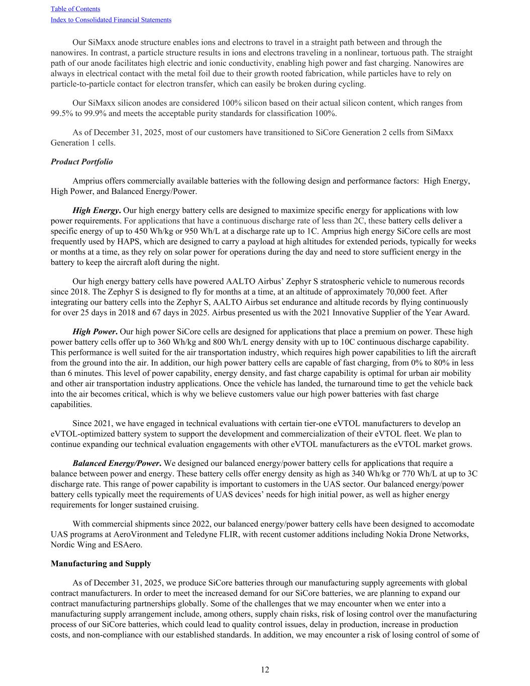 Our SiMaxx anode structure enables ions and electrons to travel in a straight path between and through the nanowires. In contrast, a particle structure results in ions and electrons traveling in a nonlinear, tortuous path. The straight path of our anode facilitates high electric and ionic conductivity, enabling high power and fast charging. Nanowires are always in electrical contact with the metal foil due to their growth rooted fabrication, while particles have to rely on particle-to-particle contact for electron transfer, which can easily be broken during cycling. Our SiMaxx silicon anodes are considered 100% silicon based on their actual silicon content, which ranges from 99.5% to 99.9% and meets the acceptable purity standards for classification 100%. As of December 31, 2025, most of our customers have transitioned to SiCore Generation 2 cells from SiMaxx Generation 1 cells. Product Portfolio Amprius offers commercially available batteries with the following design and performance factors: High Energy, High Power, and Balanced Energy/Power. High Energy. Our high energy battery cells are designed to maximize specific energy for applications with low power requirements. For applications that have a continuous discharge rate of less than 2C, these battery cells deliver a specific energy of up to 450 Wh/kg or 950 Wh/L at a discharge rate up to 1C. Amprius high energy SiCore cells are most frequently used by HAPS, which are designed to carry a payload at high altitudes for extended periods, typically for weeks or months at a time, as they rely on solar power for operations during the day and need to store sufficient energy in the battery to keep the aircraft aloft during the night. Our high energy battery cells have powered AALTO Airbus’ Zephyr S stratospheric vehicle to numerous records since 2018. The Zephyr S is designed to fly for months at a time, at an altitude of approximately 70,000 feet. After integrating our battery cells into the Zephyr S, AALTO Airbus set endurance and altitude records by flying continuously for over 25 days in 2018 and 67 days in 2025. Airbus presented us with the 2021 Innovative Supplier of the Year Award. High Power. Our high power SiCore cells are designed for applications that place a premium on power. These high power battery cells offer up to 360 Wh/kg and 800 Wh/L energy density with up to 10C continuous discharge capability. This performance is well suited for the air transportation industry, which requires high power capabilities to lift the aircraft from the ground into the air. In addition, our high power battery cells are capable of fast charging, from 0% to 80% in less than 6 minutes. This level of power capability, energy density, and fast charge capability is optimal for urban air mobility and other air transportation industry applications. Once the vehicle has landed, the turnaround time to get the vehicle back into the air becomes critical, which is why we believe customers value our high power batteries with fast charge capabilities. Since 2021, we have engaged in technical evaluations with certain tier-one eVTOL manufacturers to develop an eVTOL-optimized battery system to support the development and commercialization of their eVTOL fleet. We plan to continue expanding our technical evaluation engagements with other eVTOL manufacturers as the eVTOL market grows. Balanced Energy/Power. We designed our balanced energy/power battery cells for applications that require a balance between power and energy. These battery cells offer energy density as high as 340 Wh/kg or 770 Wh/L at up to 3C discharge rate. This range of power capability is important to customers in the UAS sector. Our balanced energy/power battery cells typically meet the requirements of UAS devices’ needs for high initial power, as well as higher energy requirements for longer sustained cruising. With commercial shipments since 2022, our balanced energy/power battery cells have been designed to accomodate UAS programs at AeroVironment and Teledyne FLIR, with recent customer additions including Nokia Drone Networks, Nordic Wing and ESAero. Manufacturing and Supply As of December 31, 2025, we produce SiCore batteries through our manufacturing supply agreements with global contract manufacturers. In order to meet the increased demand for our SiCore batteries, we are planning to expand our contract manufacturing partnerships globally. Some of the challenges that we may encounter when we enter into a manufacturing supply arrangement include, among others, supply chain risks, risk of losing control over the manufacturing process of our SiCore batteries, which could lead to quality control issues, delay in production, increase in production costs, and non-compliance with our established standards. In addition, we may encounter a risk of losing control of some of Table of Contents Index to Consolidated Financial Statements 12