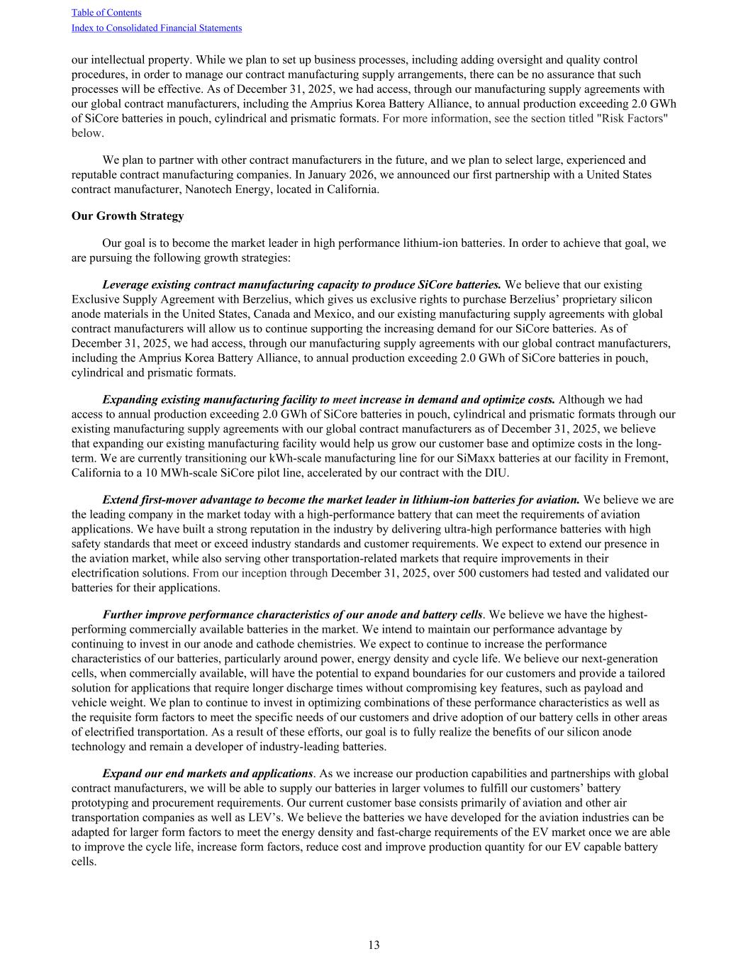 our intellectual property. While we plan to set up business processes, including adding oversight and quality control procedures, in order to manage our contract manufacturing supply arrangements, there can be no assurance that such processes will be effective. As of December 31, 2025, we had access, through our manufacturing supply agreements with our global contract manufacturers, including the Amprius Korea Battery Alliance, to annual production exceeding 2.0 GWh of SiCore batteries in pouch, cylindrical and prismatic formats. For more information, see the section titled "Risk Factors" below. We plan to partner with other contract manufacturers in the future, and we plan to select large, experienced and reputable contract manufacturing companies. In January 2026, we announced our first partnership with a United States contract manufacturer, Nanotech Energy, located in California. Our Growth Strategy Our goal is to become the market leader in high performance lithium-ion batteries. In order to achieve that goal, we are pursuing the following growth strategies: Leverage existing contract manufacturing capacity to produce SiCore batteries. We believe that our existing Exclusive Supply Agreement with Berzelius, which gives us exclusive rights to purchase Berzelius’ proprietary silicon anode materials in the United States, Canada and Mexico, and our existing manufacturing supply agreements with global contract manufacturers will allow us to continue supporting the increasing demand for our SiCore batteries. As of December 31, 2025, we had access, through our manufacturing supply agreements with our global contract manufacturers, including the Amprius Korea Battery Alliance, to annual production exceeding 2.0 GWh of SiCore batteries in pouch, cylindrical and prismatic formats. Expanding existing manufacturing facility to meet increase in demand and optimize costs. Although we had access to annual production exceeding 2.0 GWh of SiCore batteries in pouch, cylindrical and prismatic formats through our existing manufacturing supply agreements with our global contract manufacturers as of December 31, 2025, we believe that expanding our existing manufacturing facility would help us grow our customer base and optimize costs in the long- term. We are currently transitioning our kWh-scale manufacturing line for our SiMaxx batteries at our facility in Fremont, California to a 10 MWh-scale SiCore pilot line, accelerated by our contract with the DIU. Extend first-mover advantage to become the market leader in lithium-ion batteries for aviation. We believe we are the leading company in the market today with a high-performance battery that can meet the requirements of aviation applications. We have built a strong reputation in the industry by delivering ultra-high performance batteries with high safety standards that meet or exceed industry standards and customer requirements. We expect to extend our presence in the aviation market, while also serving other transportation-related markets that require improvements in their electrification solutions. From our inception through December 31, 2025, over 500 customers had tested and validated our batteries for their applications. Further improve performance characteristics of our anode and battery cells. We believe we have the highest- performing commercially available batteries in the market. We intend to maintain our performance advantage by continuing to invest in our anode and cathode chemistries. We expect to continue to increase the performance characteristics of our batteries, particularly around power, energy density and cycle life. We believe our next-generation cells, when commercially available, will have the potential to expand boundaries for our customers and provide a tailored solution for applications that require longer discharge times without compromising key features, such as payload and vehicle weight. We plan to continue to invest in optimizing combinations of these performance characteristics as well as the requisite form factors to meet the specific needs of our customers and drive adoption of our battery cells in other areas of electrified transportation. As a result of these efforts, our goal is to fully realize the benefits of our silicon anode technology and remain a developer of industry-leading batteries. Expand our end markets and applications. As we increase our production capabilities and partnerships with global contract manufacturers, we will be able to supply our batteries in larger volumes to fulfill our customers’ battery prototyping and procurement requirements. Our current customer base consists primarily of aviation and other air transportation companies as well as LEV’s. We believe the batteries we have developed for the aviation industries can be adapted for larger form factors to meet the energy density and fast-charge requirements of the EV market once we are able to improve the cycle life, increase form factors, reduce cost and improve production quantity for our EV capable battery cells. Table of Contents Index to Consolidated Financial Statements 13