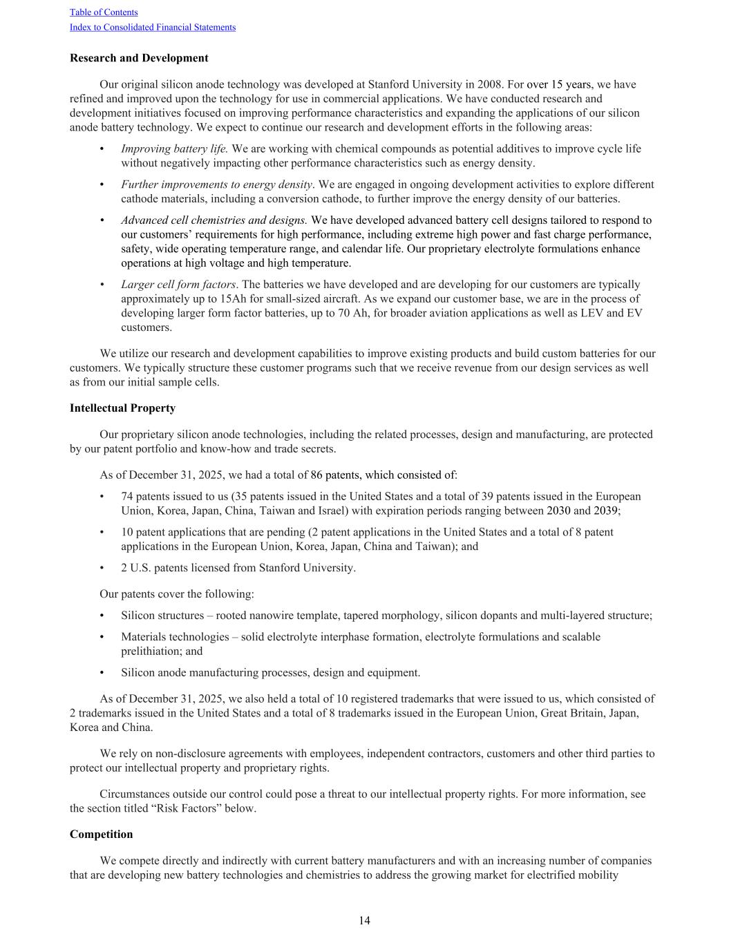 Research and Development Our original silicon anode technology was developed at Stanford University in 2008. For over 15 years, we have refined and improved upon the technology for use in commercial applications. We have conducted research and development initiatives focused on improving performance characteristics and expanding the applications of our silicon anode battery technology. We expect to continue our research and development efforts in the following areas: • Improving battery life. We are working with chemical compounds as potential additives to improve cycle life without negatively impacting other performance characteristics such as energy density. • Further improvements to energy density. We are engaged in ongoing development activities to explore different cathode materials, including a conversion cathode, to further improve the energy density of our batteries. • Advanced cell chemistries and designs. We have developed advanced battery cell designs tailored to respond to our customers’ requirements for high performance, including extreme high power and fast charge performance, safety, wide operating temperature range, and calendar life. Our proprietary electrolyte formulations enhance operations at high voltage and high temperature. • Larger cell form factors. The batteries we have developed and are developing for our customers are typically approximately up to 15Ah for small-sized aircraft. As we expand our customer base, we are in the process of developing larger form factor batteries, up to 70 Ah, for broader aviation applications as well as LEV and EV customers. We utilize our research and development capabilities to improve existing products and build custom batteries for our customers. We typically structure these customer programs such that we receive revenue from our design services as well as from our initial sample cells. Intellectual Property Our proprietary silicon anode technologies, including the related processes, design and manufacturing, are protected by our patent portfolio and know-how and trade secrets. As of December 31, 2025, we had a total of 86 patents, which consisted of: • 74 patents issued to us (35 patents issued in the United States and a total of 39 patents issued in the European Union, Korea, Japan, China, Taiwan and Israel) with expiration periods ranging between 2030 and 2039; • 10 patent applications that are pending (2 patent applications in the United States and a total of 8 patent applications in the European Union, Korea, Japan, China and Taiwan); and • 2 U.S. patents licensed from Stanford University. Our patents cover the following: • Silicon structures – rooted nanowire template, tapered morphology, silicon dopants and multi-layered structure; • Materials technologies – solid electrolyte interphase formation, electrolyte formulations and scalable prelithiation; and • Silicon anode manufacturing processes, design and equipment. As of December 31, 2025, we also held a total of 10 registered trademarks that were issued to us, which consisted of 2 trademarks issued in the United States and a total of 8 trademarks issued in the European Union, Great Britain, Japan, Korea and China. We rely on non-disclosure agreements with employees, independent contractors, customers and other third parties to protect our intellectual property and proprietary rights. Circumstances outside our control could pose a threat to our intellectual property rights. For more information, see the section titled “Risk Factors” below. Competition We compete directly and indirectly with current battery manufacturers and with an increasing number of companies that are developing new battery technologies and chemistries to address the growing market for electrified mobility Table of Contents Index to Consolidated Financial Statements 14