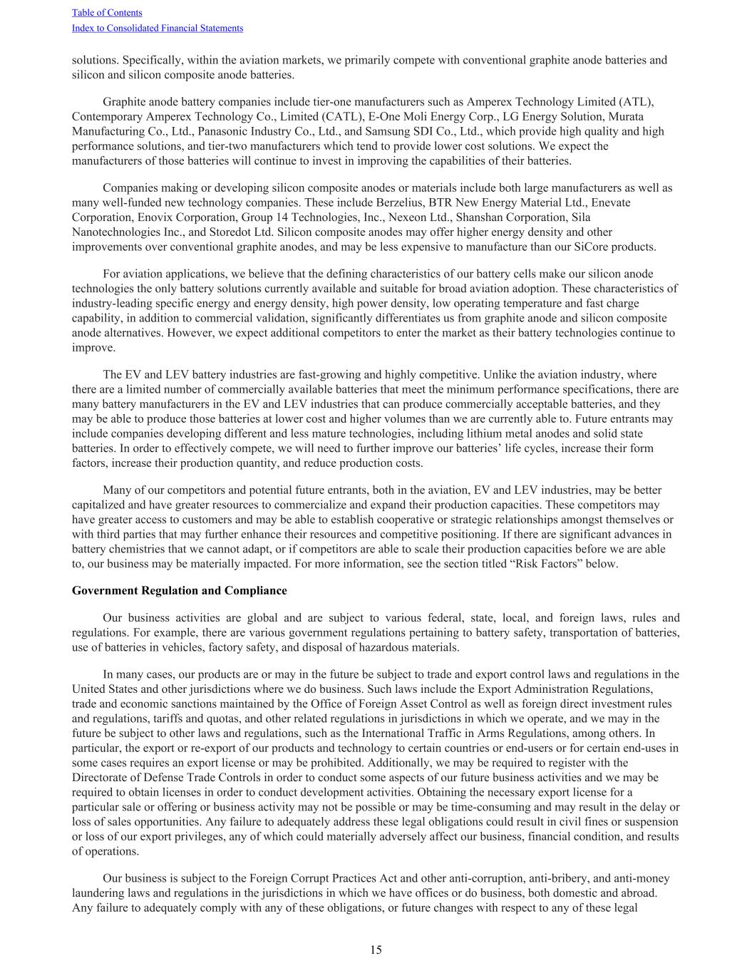 solutions. Specifically, within the aviation markets, we primarily compete with conventional graphite anode batteries and silicon and silicon composite anode batteries. Graphite anode battery companies include tier-one manufacturers such as Amperex Technology Limited (ATL), Contemporary Amperex Technology Co., Limited (CATL), E-One Moli Energy Corp., LG Energy Solution, Murata Manufacturing Co., Ltd., Panasonic Industry Co., Ltd., and Samsung SDI Co., Ltd., which provide high quality and high performance solutions, and tier-two manufacturers which tend to provide lower cost solutions. We expect the manufacturers of those batteries will continue to invest in improving the capabilities of their batteries. Companies making or developing silicon composite anodes or materials include both large manufacturers as well as many well-funded new technology companies. These include Berzelius, BTR New Energy Material Ltd., Enevate Corporation, Enovix Corporation, Group 14 Technologies, Inc., Nexeon Ltd., Shanshan Corporation, Sila Nanotechnologies Inc., and Storedot Ltd. Silicon composite anodes may offer higher energy density and other improvements over conventional graphite anodes, and may be less expensive to manufacture than our SiCore products. For aviation applications, we believe that the defining characteristics of our battery cells make our silicon anode technologies the only battery solutions currently available and suitable for broad aviation adoption. These characteristics of industry-leading specific energy and energy density, high power density, low operating temperature and fast charge capability, in addition to commercial validation, significantly differentiates us from graphite anode and silicon composite anode alternatives. However, we expect additional competitors to enter the market as their battery technologies continue to improve. The EV and LEV battery industries are fast-growing and highly competitive. Unlike the aviation industry, where there are a limited number of commercially available batteries that meet the minimum performance specifications, there are many battery manufacturers in the EV and LEV industries that can produce commercially acceptable batteries, and they may be able to produce those batteries at lower cost and higher volumes than we are currently able to. Future entrants may include companies developing different and less mature technologies, including lithium metal anodes and solid state batteries. In order to effectively compete, we will need to further improve our batteries’ life cycles, increase their form factors, increase their production quantity, and reduce production costs. Many of our competitors and potential future entrants, both in the aviation, EV and LEV industries, may be better capitalized and have greater resources to commercialize and expand their production capacities. These competitors may have greater access to customers and may be able to establish cooperative or strategic relationships amongst themselves or with third parties that may further enhance their resources and competitive positioning. If there are significant advances in battery chemistries that we cannot adapt, or if competitors are able to scale their production capacities before we are able to, our business may be materially impacted. For more information, see the section titled “Risk Factors” below. Government Regulation and Compliance Our business activities are global and are subject to various federal, state, local, and foreign laws, rules and regulations. For example, there are various government regulations pertaining to battery safety, transportation of batteries, use of batteries in vehicles, factory safety, and disposal of hazardous materials. In many cases, our products are or may in the future be subject to trade and export control laws and regulations in the United States and other jurisdictions where we do business. Such laws include the Export Administration Regulations, trade and economic sanctions maintained by the Office of Foreign Asset Control as well as foreign direct investment rules and regulations, tariffs and quotas, and other related regulations in jurisdictions in which we operate, and we may in the future be subject to other laws and regulations, such as the International Traffic in Arms Regulations, among others. In particular, the export or re-export of our products and technology to certain countries or end-users or for certain end-uses in some cases requires an export license or may be prohibited. Additionally, we may be required to register with the Directorate of Defense Trade Controls in order to conduct some aspects of our future business activities and we may be required to obtain licenses in order to conduct development activities. Obtaining the necessary export license for a particular sale or offering or business activity may not be possible or may be time-consuming and may result in the delay or loss of sales opportunities. Any failure to adequately address these legal obligations could result in civil fines or suspension or loss of our export privileges, any of which could materially adversely affect our business, financial condition, and results of operations. Our business is subject to the Foreign Corrupt Practices Act and other anti-corruption, anti-bribery, and anti-money laundering laws and regulations in the jurisdictions in which we have offices or do business, both domestic and abroad. Any failure to adequately comply with any of these obligations, or future changes with respect to any of these legal Table of Contents Index to Consolidated Financial Statements 15