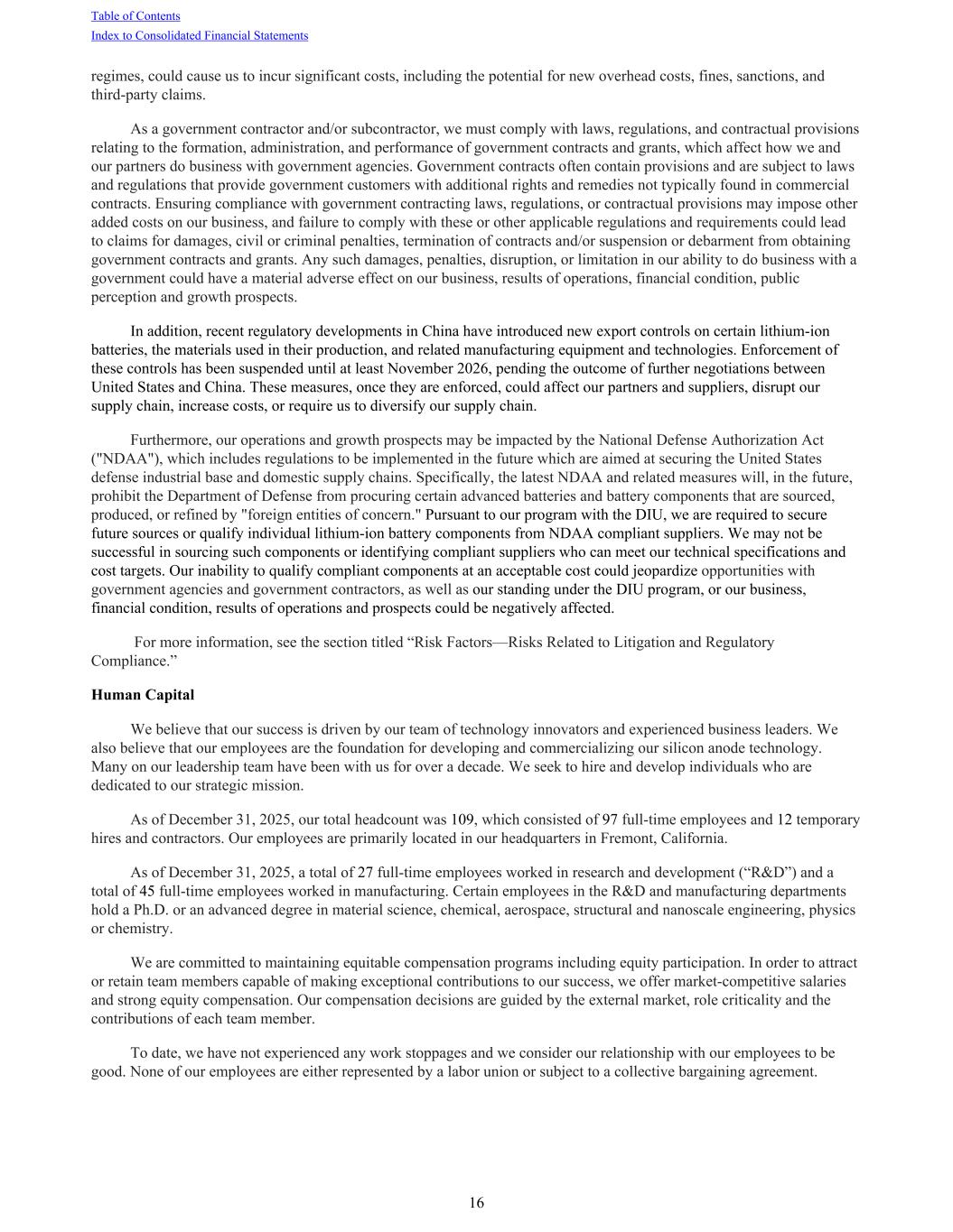 regimes, could cause us to incur significant costs, including the potential for new overhead costs, fines, sanctions, and third-party claims. As a government contractor and/or subcontractor, we must comply with laws, regulations, and contractual provisions relating to the formation, administration, and performance of government contracts and grants, which affect how we and our partners do business with government agencies. Government contracts often contain provisions and are subject to laws and regulations that provide government customers with additional rights and remedies not typically found in commercial contracts. Ensuring compliance with government contracting laws, regulations, or contractual provisions may impose other added costs on our business, and failure to comply with these or other applicable regulations and requirements could lead to claims for damages, civil or criminal penalties, termination of contracts and/or suspension or debarment from obtaining government contracts and grants. Any such damages, penalties, disruption, or limitation in our ability to do business with a government could have a material adverse effect on our business, results of operations, financial condition, public perception and growth prospects. In addition, recent regulatory developments in China have introduced new export controls on certain lithium-ion batteries, the materials used in their production, and related manufacturing equipment and technologies. Enforcement of these controls has been suspended until at least November 2026, pending the outcome of further negotiations between United States and China. These measures, once they are enforced, could affect our partners and suppliers, disrupt our supply chain, increase costs, or require us to diversify our supply chain. Furthermore, our operations and growth prospects may be impacted by the National Defense Authorization Act ("NDAA"), which includes regulations to be implemented in the future which are aimed at securing the United States defense industrial base and domestic supply chains. Specifically, the latest NDAA and related measures will, in the future, prohibit the Department of Defense from procuring certain advanced batteries and battery components that are sourced, produced, or refined by "foreign entities of concern." Pursuant to our program with the DIU, we are required to secure future sources or qualify individual lithium-ion battery components from NDAA compliant suppliers. We may not be successful in sourcing such components or identifying compliant suppliers who can meet our technical specifications and cost targets. Our inability to qualify compliant components at an acceptable cost could jeopardize opportunities with government agencies and government contractors, as well as our standing under the DIU program, or our business, financial condition, results of operations and prospects could be negatively affected. For more information, see the section titled “Risk Factors—Risks Related to Litigation and Regulatory Compliance.” Human Capital We believe that our success is driven by our team of technology innovators and experienced business leaders. We also believe that our employees are the foundation for developing and commercializing our silicon anode technology. Many on our leadership team have been with us for over a decade. We seek to hire and develop individuals who are dedicated to our strategic mission. As of December 31, 2025, our total headcount was 109, which consisted of 97 full-time employees and 12 temporary hires and contractors. Our employees are primarily located in our headquarters in Fremont, California. As of December 31, 2025, a total of 27 full-time employees worked in research and development (“R&D”) and a total of 45 full-time employees worked in manufacturing. Certain employees in the R&D and manufacturing departments hold a Ph.D. or an advanced degree in material science, chemical, aerospace, structural and nanoscale engineering, physics or chemistry. We are committed to maintaining equitable compensation programs including equity participation. In order to attract or retain team members capable of making exceptional contributions to our success, we offer market-competitive salaries and strong equity compensation. Our compensation decisions are guided by the external market, role criticality and the contributions of each team member. To date, we have not experienced any work stoppages and we consider our relationship with our employees to be good. None of our employees are either represented by a labor union or subject to a collective bargaining agreement. Table of Contents Index to Consolidated Financial Statements 16