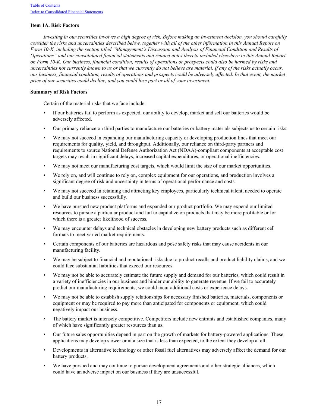 Item 1A. Risk Factors Investing in our securities involves a high degree of risk. Before making an investment decision, you should carefully consider the risks and uncertainties described below, together with all of the other information in this Annual Report on Form 10-K, including the section titled “Management’s Discussion and Analysis of Financial Condition and Results of Operations” and our consolidated financial statements and related notes thereto included elsewhere in this Annual Report on Form 10-K. Our business, financial condition, results of operations or prospects could also be harmed by risks and uncertainties not currently known to us or that we currently do not believe are material. If any of the risks actually occur, our business, financial condition, results of operations and prospects could be adversely affected. In that event, the market price of our securities could decline, and you could lose part or all of your investment. Summary of Risk Factors Certain of the material risks that we face include: • If our batteries fail to perform as expected, our ability to develop, market and sell our batteries would be adversely affected. • Our primary reliance on third parties to manufacture our batteries or battery materials subjects us to certain risks. • We may not succeed in expanding our manufacturing capacity or developing production lines that meet our requirements for quality, yield, and throughput. Additionally, our reliance on third-party partners and requirements to source National Defense Authorization Act (NDAA)-compliant components at acceptable cost targets may result in significant delays, increased capital expenditures, or operational inefficiencies. • We may not meet our manufacturing cost targets, which would limit the size of our market opportunities. • We rely on, and will continue to rely on, complex equipment for our operations, and production involves a significant degree of risk and uncertainty in terms of operational performance and costs. • We may not succeed in retaining and attracting key employees, particularly technical talent, needed to operate and build our business successfully. • We have pursued new product platforms and expanded our product portfolio. We may expend our limited resources to pursue a particular product and fail to capitalize on products that may be more profitable or for which there is a greater likelihood of success. • We may encounter delays and technical obstacles in developing new battery products such as different cell formats to meet varied market requirements. • Certain components of our batteries are hazardous and pose safety risks that may cause accidents in our manufacturing facility. • We may be subject to financial and reputational risks due to product recalls and product liability claims, and we could face substantial liabilities that exceed our resources. • We may not be able to accurately estimate the future supply and demand for our batteries, which could result in a variety of inefficiencies in our business and hinder our ability to generate revenue. If we fail to accurately predict our manufacturing requirements, we could incur additional costs or experience delays. • We may not be able to establish supply relationships for necessary finished batteries, materials, components or equipment or may be required to pay more than anticipated for components or equipment, which could negatively impact our business. • The battery market is intensely competitive. Competitors include new entrants and established companies, many of which have significantly greater resources than us. • Our future sales opportunities depend in part on the growth of markets for battery-powered applications. These applications may develop slower or at a size that is less than expected, to the extent they develop at all. • Developments in alternative technology or other fossil fuel alternatives may adversely affect the demand for our battery products. • We have pursued and may continue to pursue development agreements and other strategic alliances, which could have an adverse impact on our business if they are unsuccessful. Table of Contents Index to Consolidated Financial Statements 17