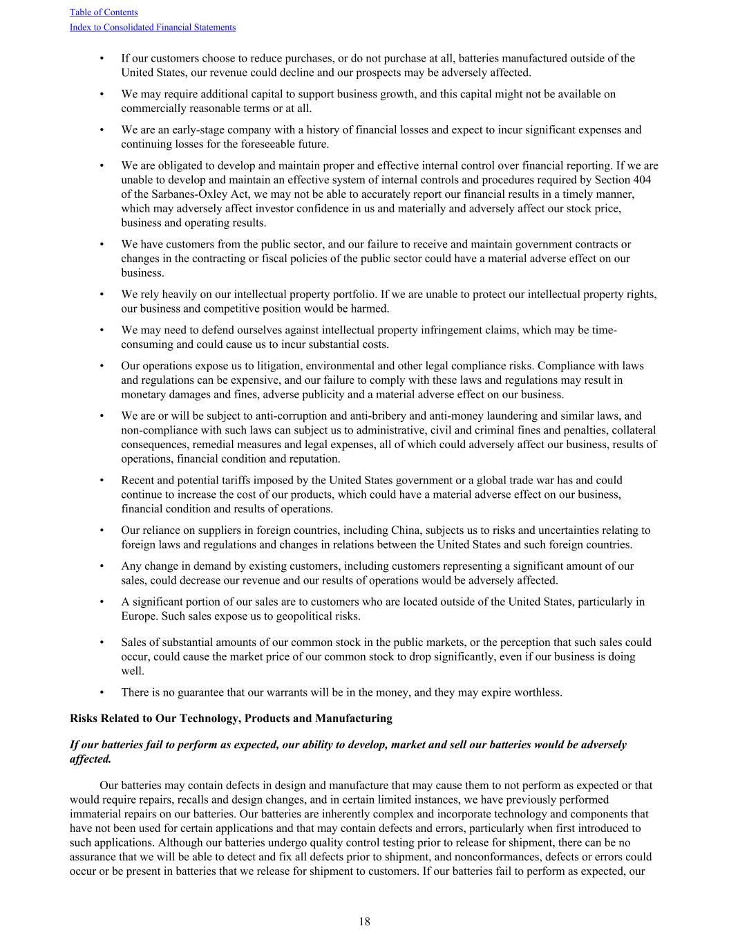 • If our customers choose to reduce purchases, or do not purchase at all, batteries manufactured outside of the United States, our revenue could decline and our prospects may be adversely affected. • We may require additional capital to support business growth, and this capital might not be available on commercially reasonable terms or at all. • We are an early-stage company with a history of financial losses and expect to incur significant expenses and continuing losses for the foreseeable future. • We are obligated to develop and maintain proper and effective internal control over financial reporting. If we are unable to develop and maintain an effective system of internal controls and procedures required by Section 404 of the Sarbanes-Oxley Act, we may not be able to accurately report our financial results in a timely manner, which may adversely affect investor confidence in us and materially and adversely affect our stock price, business and operating results. • We have customers from the public sector, and our failure to receive and maintain government contracts or changes in the contracting or fiscal policies of the public sector could have a material adverse effect on our business. • We rely heavily on our intellectual property portfolio. If we are unable to protect our intellectual property rights, our business and competitive position would be harmed. • We may need to defend ourselves against intellectual property infringement claims, which may be time- consuming and could cause us to incur substantial costs. • Our operations expose us to litigation, environmental and other legal compliance risks. Compliance with laws and regulations can be expensive, and our failure to comply with these laws and regulations may result in monetary damages and fines, adverse publicity and a material adverse effect on our business. • We are or will be subject to anti-corruption and anti-bribery and anti-money laundering and similar laws, and non-compliance with such laws can subject us to administrative, civil and criminal fines and penalties, collateral consequences, remedial measures and legal expenses, all of which could adversely affect our business, results of operations, financial condition and reputation. • Recent and potential tariffs imposed by the United States government or a global trade war has and could continue to increase the cost of our products, which could have a material adverse effect on our business, financial condition and results of operations. • Our reliance on suppliers in foreign countries, including China, subjects us to risks and uncertainties relating to foreign laws and regulations and changes in relations between the United States and such foreign countries. • Any change in demand by existing customers, including customers representing a significant amount of our sales, could decrease our revenue and our results of operations would be adversely affected. • A significant portion of our sales are to customers who are located outside of the United States, particularly in Europe. Such sales expose us to geopolitical risks. • Sales of substantial amounts of our common stock in the public markets, or the perception that such sales could occur, could cause the market price of our common stock to drop significantly, even if our business is doing well. • There is no guarantee that our warrants will be in the money, and they may expire worthless. Risks Related to Our Technology, Products and Manufacturing If our batteries fail to perform as expected, our ability to develop, market and sell our batteries would be adversely affected. Our batteries may contain defects in design and manufacture that may cause them to not perform as expected or that would require repairs, recalls and design changes, and in certain limited instances, we have previously performed immaterial repairs on our batteries. Our batteries are inherently complex and incorporate technology and components that have not been used for certain applications and that may contain defects and errors, particularly when first introduced to such applications. Although our batteries undergo quality control testing prior to release for shipment, there can be no assurance that we will be able to detect and fix all defects prior to shipment, and nonconformances, defects or errors could occur or be present in batteries that we release for shipment to customers. If our batteries fail to perform as expected, our Table of Contents Index to Consolidated Financial Statements 18