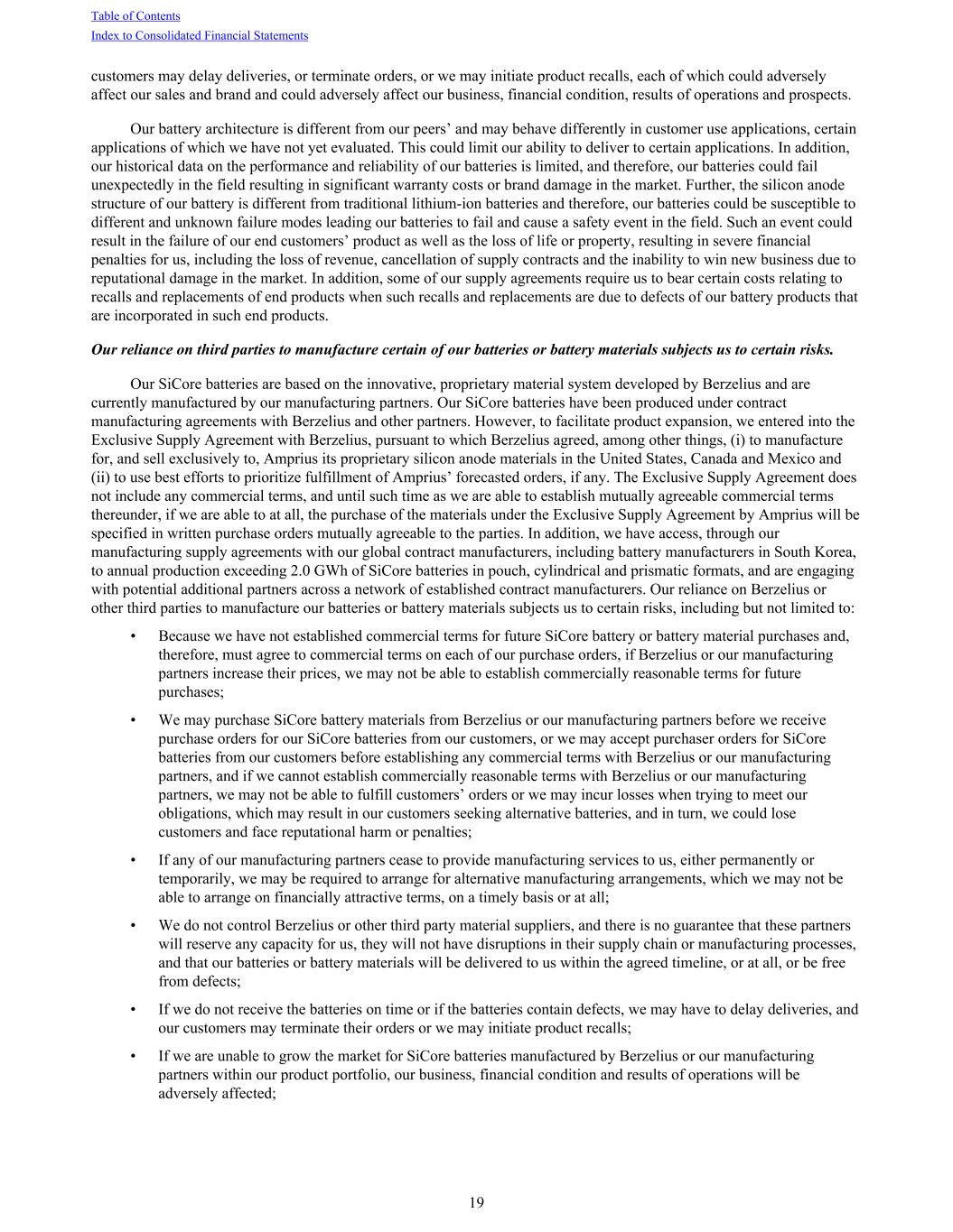 customers may delay deliveries, or terminate orders, or we may initiate product recalls, each of which could adversely affect our sales and brand and could adversely affect our business, financial condition, results of operations and prospects. Our battery architecture is different from our peers’ and may behave differently in customer use applications, certain applications of which we have not yet evaluated. This could limit our ability to deliver to certain applications. In addition, our historical data on the performance and reliability of our batteries is limited, and therefore, our batteries could fail unexpectedly in the field resulting in significant warranty costs or brand damage in the market. Further, the silicon anode structure of our battery is different from traditional lithium-ion batteries and therefore, our batteries could be susceptible to different and unknown failure modes leading our batteries to fail and cause a safety event in the field. Such an event could result in the failure of our end customers’ product as well as the loss of life or property, resulting in severe financial penalties for us, including the loss of revenue, cancellation of supply contracts and the inability to win new business due to reputational damage in the market. In addition, some of our supply agreements require us to bear certain costs relating to recalls and replacements of end products when such recalls and replacements are due to defects of our battery products that are incorporated in such end products. Our reliance on third parties to manufacture certain of our batteries or battery materials subjects us to certain risks. Our SiCore batteries are based on the innovative, proprietary material system developed by Berzelius and are currently manufactured by our manufacturing partners. Our SiCore batteries have been produced under contract manufacturing agreements with Berzelius and other partners. However, to facilitate product expansion, we entered into the Exclusive Supply Agreement with Berzelius, pursuant to which Berzelius agreed, among other things, (i) to manufacture for, and sell exclusively to, Amprius its proprietary silicon anode materials in the United States, Canada and Mexico and (ii) to use best efforts to prioritize fulfillment of Amprius’ forecasted orders, if any. The Exclusive Supply Agreement does not include any commercial terms, and until such time as we are able to establish mutually agreeable commercial terms thereunder, if we are able to at all, the purchase of the materials under the Exclusive Supply Agreement by Amprius will be specified in written purchase orders mutually agreeable to the parties. In addition, we have access, through our manufacturing supply agreements with our global contract manufacturers, including battery manufacturers in South Korea, to annual production exceeding 2.0 GWh of SiCore batteries in pouch, cylindrical and prismatic formats, and are engaging with potential additional partners across a network of established contract manufacturers. Our reliance on Berzelius or other third parties to manufacture our batteries or battery materials subjects us to certain risks, including but not limited to: • Because we have not established commercial terms for future SiCore battery or battery material purchases and, therefore, must agree to commercial terms on each of our purchase orders, if Berzelius or our manufacturing partners increase their prices, we may not be able to establish commercially reasonable terms for future purchases; • We may purchase SiCore battery materials from Berzelius or our manufacturing partners before we receive purchase orders for our SiCore batteries from our customers, or we may accept purchaser orders for SiCore batteries from our customers before establishing any commercial terms with Berzelius or our manufacturing partners, and if we cannot establish commercially reasonable terms with Berzelius or our manufacturing partners, we may not be able to fulfill customers’ orders or we may incur losses when trying to meet our obligations, which may result in our customers seeking alternative batteries, and in turn, we could lose customers and face reputational harm or penalties; • If any of our manufacturing partners cease to provide manufacturing services to us, either permanently or temporarily, we may be required to arrange for alternative manufacturing arrangements, which we may not be able to arrange on financially attractive terms, on a timely basis or at all; • We do not control Berzelius or other third party material suppliers, and there is no guarantee that these partners will reserve any capacity for us, they will not have disruptions in their supply chain or manufacturing processes, and that our batteries or battery materials will be delivered to us within the agreed timeline, or at all, or be free from defects; • If we do not receive the batteries on time or if the batteries contain defects, we may have to delay deliveries, and our customers may terminate their orders or we may initiate product recalls; • If we are unable to grow the market for SiCore batteries manufactured by Berzelius or our manufacturing partners within our product portfolio, our business, financial condition and results of operations will be adversely affected; Table of Contents Index to Consolidated Financial Statements 19