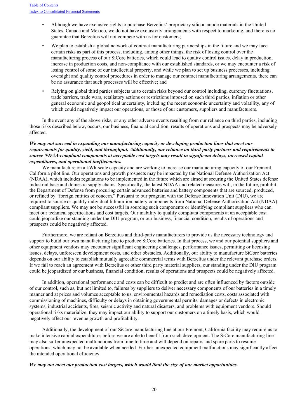 • Although we have exclusive rights to purchase Berzelius’ proprietary silicon anode materials in the United States, Canada and Mexico, we do not have exclusivity arrangements with respect to marketing, and there is no guarantee that Berzelius will not compete with us for customers; • We plan to establish a global network of contract manufacturing partnerships in the future and we may face certain risks as part of this process, including, among other things, the risk of losing control over the manufacturing process of our SiCore batteries, which could lead to quality control issues, delay in production, increase in production costs, and non-compliance with our established standards, or we may encounter a risk of losing control of some of our intellectual property, and while we plan to set up business processes, including oversight and quality control procedures in order to manage our contract manufacturing arrangements, there can be no assurance that such processes will be effective; and • Relying on global third parties subjects us to certain risks beyond our control including, currency fluctuations, trade barriers, trade wars, retaliatory actions or restrictions imposed on such third parties, inflation or other general economic and geopolitical uncertainty, including the recent economic uncertainty and volatility, any of which could negatively impact our operations, or those of our customers, suppliers and manufacturers. In the event any of the above risks, or any other adverse events resulting from our reliance on third parties, including those risks described below, occurs, our business, financial condition, results of operations and prospects may be adversely affected. We may not succeed in expanding our manufacturing capacity or developing production lines that meet our requirements for quality, yield, and throughput. Additionally, our reliance on third-party partners and requirements to source NDAA-compliant components at acceptable cost targets may result in significant delays, increased capital expenditures, and operational inefficiencies. We manufacture on a kWh-scale capacity and are working to increase our manufacturing capacity of our Fremont, California pilot line. Our operations and growth prospects may be impacted by the National Defense Authorization Act (NDAA), which includes regulations to be implemented in the future which are aimed at securing the United States defense industrial base and domestic supply chains. Specifically, the latest NDAA and related measures will, in the future, prohibit the Department of Defense from procuring certain advanced batteries and battery components that are sourced, produced, or refined by “foreign entities of concern.” Pursuant to our program with the Defense Innovation Unit (DIU), we are required to source or qualify individual lithium-ion battery components from National Defense Authorization Act (NDAA) compliant suppliers. We may not be successful in sourcing such components or identifying compliant suppliers who can meet our technical specifications and cost targets. Our inability to qualify compliant components at an acceptable cost could jeopardize our standing under the DIU program, or our business, financial condition, results of operations and prospects could be negatively affected. Furthermore, we are reliant on Berzelius and third-party manufacturers to provide us the necessary technology and support to build our own manufacturing line to produce SiCore batteries. In that process, we and our potential suppliers and other equipment vendors may encounter significant engineering challenges, performance issues, permitting or licensing issues, delays, unforeseen development costs, and other obstacles. Additionally, our ability to manufacture SiCore batteries depends on our ability to establish mutually agreeable commercial terms with Berzelius under the relevant purchase orders. If we fail to reach an agreement with Berzelius or other third party material suppliers, our standing under the DIU program could be jeopardized or our business, financial condition, results of operations and prospects could be negatively affected. In addition, operational performance and costs can be difficult to predict and are often influenced by factors outside of our control, such as, but not limited to, failures by suppliers to deliver necessary components of our batteries in a timely manner and at prices and volumes acceptable to us, environmental hazards and remediation costs, costs associated with commissioning of machines, difficulty or delays in obtaining governmental permits, damages or defects in electronic systems, industrial accidents, fires, seismic activity and natural disasters, and problems with equipment vendors. Should operational risks materialize, they may impact our ability to support our customers on a timely basis, which would negatively affect our revenue growth and profitability. Additionally, the development of our SiCore manufacturing line at our Fremont, California facility may require us to make intensive capital expenditures before we are able to benefit from such development. The SiCore manufacturing line may also suffer unexpected malfunctions from time to time and will depend on repairs and spare parts to resume operations, which may not be available when needed. Further, unexpected equipment malfunctions may significantly affect the intended operational efficiency. We may not meet our production cost targets, which would limit the size of our market opportunities. Table of Contents Index to Consolidated Financial Statements 20