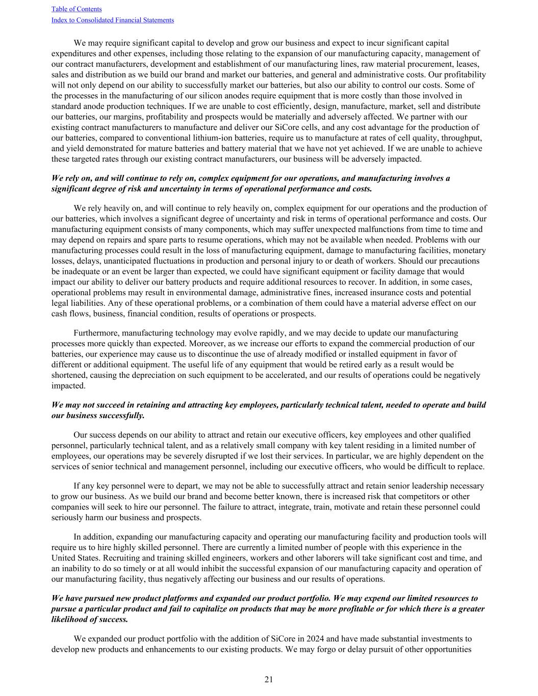 We may require significant capital to develop and grow our business and expect to incur significant capital expenditures and other expenses, including those relating to the expansion of our manufacturing capacity, management of our contract manufacturers, development and establishment of our manufacturing lines, raw material procurement, leases, sales and distribution as we build our brand and market our batteries, and general and administrative costs. Our profitability will not only depend on our ability to successfully market our batteries, but also our ability to control our costs. Some of the processes in the manufacturing of our silicon anodes require equipment that is more costly than those involved in standard anode production techniques. If we are unable to cost efficiently, design, manufacture, market, sell and distribute our batteries, our margins, profitability and prospects would be materially and adversely affected. We partner with our existing contract manufacturers to manufacture and deliver our SiCore cells, and any cost advantage for the production of our batteries, compared to conventional lithium-ion batteries, require us to manufacture at rates of cell quality, throughput, and yield demonstrated for mature batteries and battery material that we have not yet achieved. If we are unable to achieve these targeted rates through our existing contract manufacturers, our business will be adversely impacted. We rely on, and will continue to rely on, complex equipment for our operations, and manufacturing involves a significant degree of risk and uncertainty in terms of operational performance and costs. We rely heavily on, and will continue to rely heavily on, complex equipment for our operations and the production of our batteries, which involves a significant degree of uncertainty and risk in terms of operational performance and costs. Our manufacturing equipment consists of many components, which may suffer unexpected malfunctions from time to time and may depend on repairs and spare parts to resume operations, which may not be available when needed. Problems with our manufacturing processes could result in the loss of manufacturing equipment, damage to manufacturing facilities, monetary losses, delays, unanticipated fluctuations in production and personal injury to or death of workers. Should our precautions be inadequate or an event be larger than expected, we could have significant equipment or facility damage that would impact our ability to deliver our battery products and require additional resources to recover. In addition, in some cases, operational problems may result in environmental damage, administrative fines, increased insurance costs and potential legal liabilities. Any of these operational problems, or a combination of them could have a material adverse effect on our cash flows, business, financial condition, results of operations or prospects. Furthermore, manufacturing technology may evolve rapidly, and we may decide to update our manufacturing processes more quickly than expected. Moreover, as we increase our efforts to expand the commercial production of our batteries, our experience may cause us to discontinue the use of already modified or installed equipment in favor of different or additional equipment. The useful life of any equipment that would be retired early as a result would be shortened, causing the depreciation on such equipment to be accelerated, and our results of operations could be negatively impacted. We may not succeed in retaining and attracting key employees, particularly technical talent, needed to operate and build our business successfully. Our success depends on our ability to attract and retain our executive officers, key employees and other qualified personnel, particularly technical talent, and as a relatively small company with key talent residing in a limited number of employees, our operations may be severely disrupted if we lost their services. In particular, we are highly dependent on the services of senior technical and management personnel, including our executive officers, who would be difficult to replace. If any key personnel were to depart, we may not be able to successfully attract and retain senior leadership necessary to grow our business. As we build our brand and become better known, there is increased risk that competitors or other companies will seek to hire our personnel. The failure to attract, integrate, train, motivate and retain these personnel could seriously harm our business and prospects. In addition, expanding our manufacturing capacity and operating our manufacturing facility and production tools will require us to hire highly skilled personnel. There are currently a limited number of people with this experience in the United States. Recruiting and training skilled engineers, workers and other laborers will take significant cost and time, and an inability to do so timely or at all would inhibit the successful expansion of our manufacturing capacity and operation of our manufacturing facility, thus negatively affecting our business and our results of operations. We have pursued new product platforms and expanded our product portfolio. We may expend our limited resources to pursue a particular product and fail to capitalize on products that may be more profitable or for which there is a greater likelihood of success. We expanded our product portfolio with the addition of SiCore in 2024 and have made substantial investments to develop new products and enhancements to our existing products. We may forgo or delay pursuit of other opportunities Table of Contents Index to Consolidated Financial Statements 21