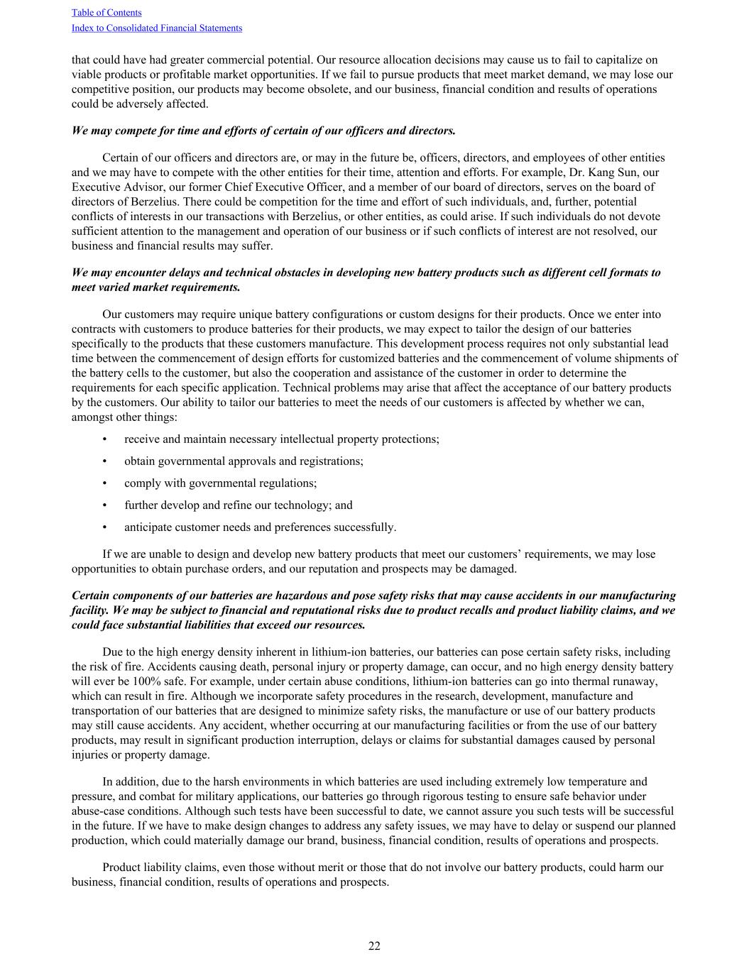 that could have had greater commercial potential. Our resource allocation decisions may cause us to fail to capitalize on viable products or profitable market opportunities. If we fail to pursue products that meet market demand, we may lose our competitive position, our products may become obsolete, and our business, financial condition and results of operations could be adversely affected. We may compete for time and efforts of certain of our officers and directors. Certain of our officers and directors are, or may in the future be, officers, directors, and employees of other entities and we may have to compete with the other entities for their time, attention and efforts. For example, Dr. Kang Sun, our Executive Advisor, our former Chief Executive Officer, and a member of our board of directors, serves on the board of directors of Berzelius. There could be competition for the time and effort of such individuals, and, further, potential conflicts of interests in our transactions with Berzelius, or other entities, as could arise. If such individuals do not devote sufficient attention to the management and operation of our business or if such conflicts of interest are not resolved, our business and financial results may suffer. We may encounter delays and technical obstacles in developing new battery products such as different cell formats to meet varied market requirements. Our customers may require unique battery configurations or custom designs for their products. Once we enter into contracts with customers to produce batteries for their products, we may expect to tailor the design of our batteries specifically to the products that these customers manufacture. This development process requires not only substantial lead time between the commencement of design efforts for customized batteries and the commencement of volume shipments of the battery cells to the customer, but also the cooperation and assistance of the customer in order to determine the requirements for each specific application. Technical problems may arise that affect the acceptance of our battery products by the customers. Our ability to tailor our batteries to meet the needs of our customers is affected by whether we can, amongst other things: • receive and maintain necessary intellectual property protections; • obtain governmental approvals and registrations; • comply with governmental regulations; • further develop and refine our technology; and • anticipate customer needs and preferences successfully. If we are unable to design and develop new battery products that meet our customers’ requirements, we may lose opportunities to obtain purchase orders, and our reputation and prospects may be damaged. Certain components of our batteries are hazardous and pose safety risks that may cause accidents in our manufacturing facility. We may be subject to financial and reputational risks due to product recalls and product liability claims, and we could face substantial liabilities that exceed our resources. Due to the high energy density inherent in lithium-ion batteries, our batteries can pose certain safety risks, including the risk of fire. Accidents causing death, personal injury or property damage, can occur, and no high energy density battery will ever be 100% safe. For example, under certain abuse conditions, lithium-ion batteries can go into thermal runaway, which can result in fire. Although we incorporate safety procedures in the research, development, manufacture and transportation of our batteries that are designed to minimize safety risks, the manufacture or use of our battery products may still cause accidents. Any accident, whether occurring at our manufacturing facilities or from the use of our battery products, may result in significant production interruption, delays or claims for substantial damages caused by personal injuries or property damage. In addition, due to the harsh environments in which batteries are used including extremely low temperature and pressure, and combat for military applications, our batteries go through rigorous testing to ensure safe behavior under abuse-case conditions. Although such tests have been successful to date, we cannot assure you such tests will be successful in the future. If we have to make design changes to address any safety issues, we may have to delay or suspend our planned production, which could materially damage our brand, business, financial condition, results of operations and prospects. Product liability claims, even those without merit or those that do not involve our battery products, could harm our business, financial condition, results of operations and prospects. Table of Contents Index to Consolidated Financial Statements 22