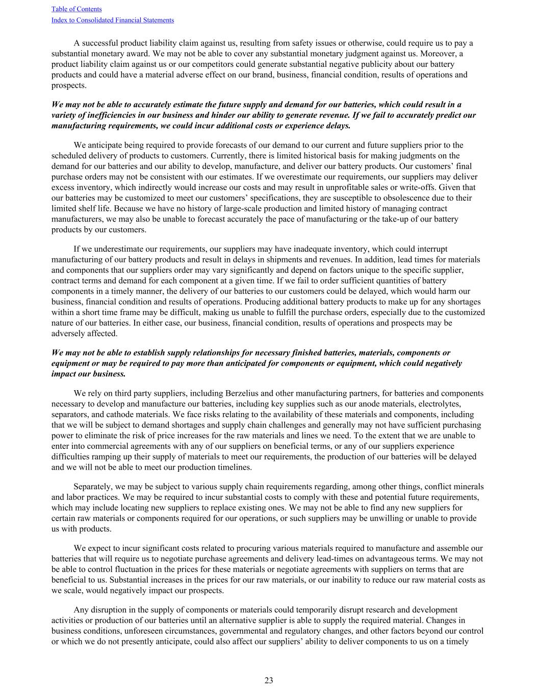 A successful product liability claim against us, resulting from safety issues or otherwise, could require us to pay a substantial monetary award. We may not be able to cover any substantial monetary judgment against us. Moreover, a product liability claim against us or our competitors could generate substantial negative publicity about our battery products and could have a material adverse effect on our brand, business, financial condition, results of operations and prospects. We may not be able to accurately estimate the future supply and demand for our batteries, which could result in a variety of inefficiencies in our business and hinder our ability to generate revenue. If we fail to accurately predict our manufacturing requirements, we could incur additional costs or experience delays. We anticipate being required to provide forecasts of our demand to our current and future suppliers prior to the scheduled delivery of products to customers. Currently, there is limited historical basis for making judgments on the demand for our batteries and our ability to develop, manufacture, and deliver our battery products. Our customers’ final purchase orders may not be consistent with our estimates. If we overestimate our requirements, our suppliers may deliver excess inventory, which indirectly would increase our costs and may result in unprofitable sales or write-offs. Given that our batteries may be customized to meet our customers’ specifications, they are susceptible to obsolescence due to their limited shelf life. Because we have no history of large-scale production and limited history of managing contract manufacturers, we may also be unable to forecast accurately the pace of manufacturing or the take-up of our battery products by our customers. If we underestimate our requirements, our suppliers may have inadequate inventory, which could interrupt manufacturing of our battery products and result in delays in shipments and revenues. In addition, lead times for materials and components that our suppliers order may vary significantly and depend on factors unique to the specific supplier, contract terms and demand for each component at a given time. If we fail to order sufficient quantities of battery components in a timely manner, the delivery of our batteries to our customers could be delayed, which would harm our business, financial condition and results of operations. Producing additional battery products to make up for any shortages within a short time frame may be difficult, making us unable to fulfill the purchase orders, especially due to the customized nature of our batteries. In either case, our business, financial condition, results of operations and prospects may be adversely affected. We may not be able to establish supply relationships for necessary finished batteries, materials, components or equipment or may be required to pay more than anticipated for components or equipment, which could negatively impact our business. We rely on third party suppliers, including Berzelius and other manufacturing partners, for batteries and components necessary to develop and manufacture our batteries, including key supplies such as our anode materials, electrolytes, separators, and cathode materials. We face risks relating to the availability of these materials and components, including that we will be subject to demand shortages and supply chain challenges and generally may not have sufficient purchasing power to eliminate the risk of price increases for the raw materials and lines we need. To the extent that we are unable to enter into commercial agreements with any of our suppliers on beneficial terms, or any of our suppliers experience difficulties ramping up their supply of materials to meet our requirements, the production of our batteries will be delayed and we will not be able to meet our production timelines. Separately, we may be subject to various supply chain requirements regarding, among other things, conflict minerals and labor practices. We may be required to incur substantial costs to comply with these and potential future requirements, which may include locating new suppliers to replace existing ones. We may not be able to find any new suppliers for certain raw materials or components required for our operations, or such suppliers may be unwilling or unable to provide us with products. We expect to incur significant costs related to procuring various materials required to manufacture and assemble our batteries that will require us to negotiate purchase agreements and delivery lead-times on advantageous terms. We may not be able to control fluctuation in the prices for these materials or negotiate agreements with suppliers on terms that are beneficial to us. Substantial increases in the prices for our raw materials, or our inability to reduce our raw material costs as we scale, would negatively impact our prospects. Any disruption in the supply of components or materials could temporarily disrupt research and development activities or production of our batteries until an alternative supplier is able to supply the required material. Changes in business conditions, unforeseen circumstances, governmental and regulatory changes, and other factors beyond our control or which we do not presently anticipate, could also affect our suppliers’ ability to deliver components to us on a timely Table of Contents Index to Consolidated Financial Statements 23