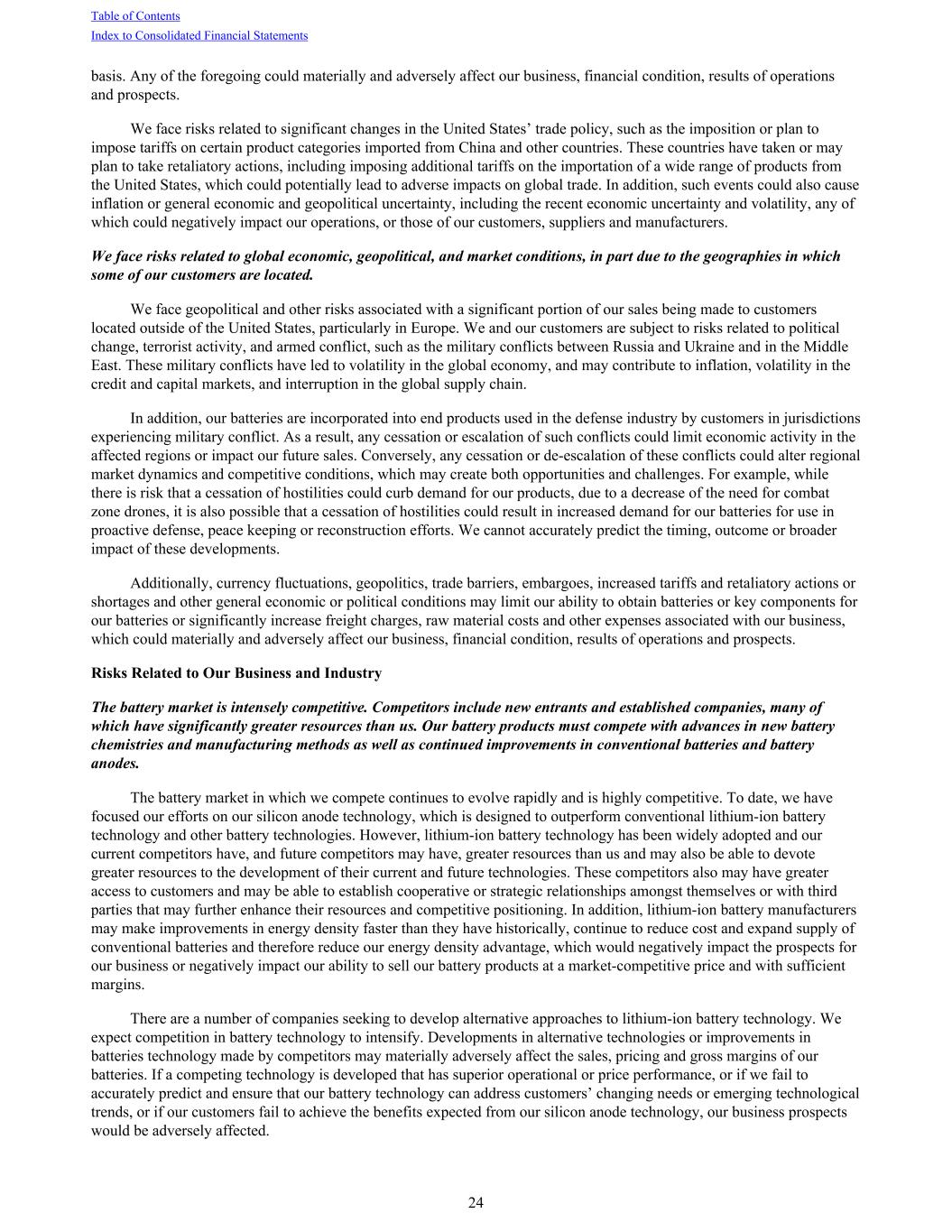 basis. Any of the foregoing could materially and adversely affect our business, financial condition, results of operations and prospects. We face risks related to significant changes in the United States’ trade policy, such as the imposition or plan to impose tariffs on certain product categories imported from China and other countries. These countries have taken or may plan to take retaliatory actions, including imposing additional tariffs on the importation of a wide range of products from the United States, which could potentially lead to adverse impacts on global trade. In addition, such events could also cause inflation or general economic and geopolitical uncertainty, including the recent economic uncertainty and volatility, any of which could negatively impact our operations, or those of our customers, suppliers and manufacturers. We face risks related to global economic, geopolitical, and market conditions, in part due to the geographies in which some of our customers are located. We face geopolitical and other risks associated with a significant portion of our sales being made to customers located outside of the United States, particularly in Europe. We and our customers are subject to risks related to political change, terrorist activity, and armed conflict, such as the military conflicts between Russia and Ukraine and in the Middle East. These military conflicts have led to volatility in the global economy, and may contribute to inflation, volatility in the credit and capital markets, and interruption in the global supply chain. In addition, our batteries are incorporated into end products used in the defense industry by customers in jurisdictions experiencing military conflict. As a result, any cessation or escalation of such conflicts could limit economic activity in the affected regions or impact our future sales. Conversely, any cessation or de-escalation of these conflicts could alter regional market dynamics and competitive conditions, which may create both opportunities and challenges. For example, while there is risk that a cessation of hostilities could curb demand for our products, due to a decrease of the need for combat zone drones, it is also possible that a cessation of hostilities could result in increased demand for our batteries for use in proactive defense, peace keeping or reconstruction efforts. We cannot accurately predict the timing, outcome or broader impact of these developments. Additionally, currency fluctuations, geopolitics, trade barriers, embargoes, increased tariffs and retaliatory actions or shortages and other general economic or political conditions may limit our ability to obtain batteries or key components for our batteries or significantly increase freight charges, raw material costs and other expenses associated with our business, which could materially and adversely affect our business, financial condition, results of operations and prospects. Risks Related to Our Business and Industry The battery market is intensely competitive. Competitors include new entrants and established companies, many of which have significantly greater resources than us. Our battery products must compete with advances in new battery chemistries and manufacturing methods as well as continued improvements in conventional batteries and battery anodes. The battery market in which we compete continues to evolve rapidly and is highly competitive. To date, we have focused our efforts on our silicon anode technology, which is designed to outperform conventional lithium-ion battery technology and other battery technologies. However, lithium-ion battery technology has been widely adopted and our current competitors have, and future competitors may have, greater resources than us and may also be able to devote greater resources to the development of their current and future technologies. These competitors also may have greater access to customers and may be able to establish cooperative or strategic relationships amongst themselves or with third parties that may further enhance their resources and competitive positioning. In addition, lithium-ion battery manufacturers may make improvements in energy density faster than they have historically, continue to reduce cost and expand supply of conventional batteries and therefore reduce our energy density advantage, which would negatively impact the prospects for our business or negatively impact our ability to sell our battery products at a market-competitive price and with sufficient margins. There are a number of companies seeking to develop alternative approaches to lithium-ion battery technology. We expect competition in battery technology to intensify. Developments in alternative technologies or improvements in batteries technology made by competitors may materially adversely affect the sales, pricing and gross margins of our batteries. If a competing technology is developed that has superior operational or price performance, or if we fail to accurately predict and ensure that our battery technology can address customers’ changing needs or emerging technological trends, or if our customers fail to achieve the benefits expected from our silicon anode technology, our business prospects would be adversely affected. Table of Contents Index to Consolidated Financial Statements 24