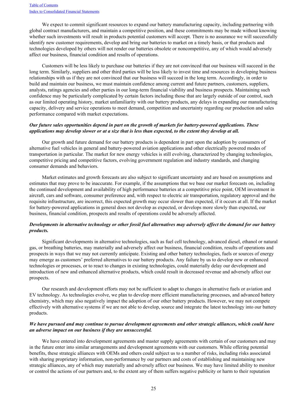We expect to commit significant resources to expand our battery manufacturing capacity, including partnering with global contract manufacturers, and maintain a competitive position, and these commitments may be made without knowing whether such investments will result in products potential customers will accept. There is no assurance we will successfully identify new customer requirements, develop and bring our batteries to market on a timely basis, or that products and technologies developed by others will not render our batteries obsolete or noncompetitive, any of which would adversely affect our business, financial condition and results of operations. Customers will be less likely to purchase our batteries if they are not convinced that our business will succeed in the long term. Similarly, suppliers and other third parties will be less likely to invest time and resources in developing business relationships with us if they are not convinced that our business will succeed in the long term. Accordingly, in order to build and maintain our business, we must maintain confidence among current and future partners, customers, suppliers, analysts, ratings agencies and other parties in our long-term financial viability and business prospects. Maintaining such confidence may be particularly complicated by certain factors including those that are largely outside of our control, such as our limited operating history, market unfamiliarity with our battery products, any delays in expanding our manufacturing capacity, delivery and service operations to meet demand, competition and uncertainty regarding our production and sales performance compared with market expectations. Our future sales opportunities depend in part on the growth of markets for battery-powered applications. These applications may develop slower or at a size that is less than expected, to the extent they develop at all. Our growth and future demand for our battery products is dependent in part upon the adoption by consumers of alternative fuel vehicles in general and battery-powered aviation applications and other electrically powered modes of transportation in particular. The market for new energy vehicles is still evolving, characterized by changing technologies, competitive pricing and competitive factors, evolving government regulation and industry standards, and changing consumer demands and behaviors. Market estimates and growth forecasts are also subject to significant uncertainty and are based on assumptions and estimates that may prove to be inaccurate. For example, if the assumptions that we base our market forecasts on, including the continued development and availability of high performance batteries at a competitive price point, OEM investment in aircraft, cars and software, consumer preference and, with respect to electric air transportation, regulatory approval and the requisite infrastructure, are incorrect, this expected growth may occur slower than expected, if it occurs at all. If the market for battery-powered applications in general does not develop as expected, or develops more slowly than expected, our business, financial condition, prospects and results of operations could be adversely affected. Developments in alternative technology or other fossil fuel alternatives may adversely affect the demand for our battery products. Significant developments in alternative technologies, such as fuel cell technology, advanced diesel, ethanol or natural gas, or breathing batteries, may materially and adversely affect our business, financial condition, results of operations and prospects in ways that we may not currently anticipate. Existing and other battery technologies, fuels or sources of energy may emerge as customers’ preferred alternatives to our battery products. Any failure by us to develop new or enhanced technologies or processes, or to react to changes in existing technologies, could materially delay our development and introduction of new and enhanced alternative products, which could result in decreased revenue and adversely affect our prospects. Our research and development efforts may not be sufficient to adapt to changes in alternative fuels or aviation and EV technology. As technologies evolve, we plan to develop more efficient manufacturing processes, and advanced battery chemistry, which may also negatively impact the adoption of our other battery products. However, we may not compete effectively with alternative systems if we are not able to develop, source and integrate the latest technology into our battery products. We have pursued and may continue to pursue development agreements and other strategic alliances, which could have an adverse impact on our business if they are unsuccessful. We have entered into development agreements and master supply agreements with certain of our customers and may in the future enter into similar arrangements and development agreements with our customers. While offering potential benefits, these strategic alliances with OEMs and others could subject us to a number of risks, including risks associated with sharing proprietary information, non-performance by our partners and costs of establishing and maintaining new strategic alliances, any of which may materially and adversely affect our business. We may have limited ability to monitor or control the actions of our partners and, to the extent any of them suffers negative publicity or harm to their reputation Table of Contents Index to Consolidated Financial Statements 25