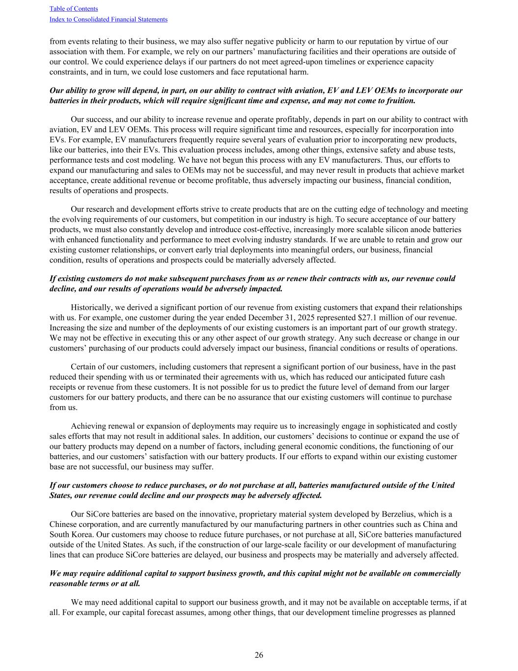 from events relating to their business, we may also suffer negative publicity or harm to our reputation by virtue of our association with them. For example, we rely on our partners’ manufacturing facilities and their operations are outside of our control. We could experience delays if our partners do not meet agreed-upon timelines or experience capacity constraints, and in turn, we could lose customers and face reputational harm. Our ability to grow will depend, in part, on our ability to contract with aviation, EV and LEV OEMs to incorporate our batteries in their products, which will require significant time and expense, and may not come to fruition. Our success, and our ability to increase revenue and operate profitably, depends in part on our ability to contract with aviation, EV and LEV OEMs. This process will require significant time and resources, especially for incorporation into EVs. For example, EV manufacturers frequently require several years of evaluation prior to incorporating new products, like our batteries, into their EVs. This evaluation process includes, among other things, extensive safety and abuse tests, performance tests and cost modeling. We have not begun this process with any EV manufacturers. Thus, our efforts to expand our manufacturing and sales to OEMs may not be successful, and may never result in products that achieve market acceptance, create additional revenue or become profitable, thus adversely impacting our business, financial condition, results of operations and prospects. Our research and development efforts strive to create products that are on the cutting edge of technology and meeting the evolving requirements of our customers, but competition in our industry is high. To secure acceptance of our battery products, we must also constantly develop and introduce cost-effective, increasingly more scalable silicon anode batteries with enhanced functionality and performance to meet evolving industry standards. If we are unable to retain and grow our existing customer relationships, or convert early trial deployments into meaningful orders, our business, financial condition, results of operations and prospects could be materially adversely affected. If existing customers do not make subsequent purchases from us or renew their contracts with us, our revenue could decline, and our results of operations would be adversely impacted. Historically, we derived a significant portion of our revenue from existing customers that expand their relationships with us. For example, one customer during the year ended December 31, 2025 represented $27.1 million of our revenue. Increasing the size and number of the deployments of our existing customers is an important part of our growth strategy. We may not be effective in executing this or any other aspect of our growth strategy. Any such decrease or change in our customers’ purchasing of our products could adversely impact our business, financial conditions or results of operations. Certain of our customers, including customers that represent a significant portion of our business, have in the past reduced their spending with us or terminated their agreements with us, which has reduced our anticipated future cash receipts or revenue from these customers. It is not possible for us to predict the future level of demand from our larger customers for our battery products, and there can be no assurance that our existing customers will continue to purchase from us. Achieving renewal or expansion of deployments may require us to increasingly engage in sophisticated and costly sales efforts that may not result in additional sales. In addition, our customers’ decisions to continue or expand the use of our battery products may depend on a number of factors, including general economic conditions, the functioning of our batteries, and our customers’ satisfaction with our battery products. If our efforts to expand within our existing customer base are not successful, our business may suffer. If our customers choose to reduce purchases, or do not purchase at all, batteries manufactured outside of the United States, our revenue could decline and our prospects may be adversely affected. Our SiCore batteries are based on the innovative, proprietary material system developed by Berzelius, which is a Chinese corporation, and are currently manufactured by our manufacturing partners in other countries such as China and South Korea. Our customers may choose to reduce future purchases, or not purchase at all, SiCore batteries manufactured outside of the United States. As such, if the construction of our large-scale facility or our development of manufacturing lines that can produce SiCore batteries are delayed, our business and prospects may be materially and adversely affected. We may require additional capital to support business growth, and this capital might not be available on commercially reasonable terms or at all. We may need additional capital to support our business growth, and it may not be available on acceptable terms, if at all. For example, our capital forecast assumes, among other things, that our development timeline progresses as planned Table of Contents Index to Consolidated Financial Statements 26