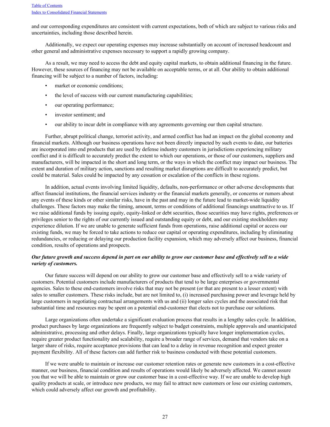 and our corresponding expenditures are consistent with current expectations, both of which are subject to various risks and uncertainties, including those described herein. Additionally, we expect our operating expenses may increase substantially on account of increased headcount and other general and administrative expenses necessary to support a rapidly growing company. As a result, we may need to access the debt and equity capital markets, to obtain additional financing in the future. However, these sources of financing may not be available on acceptable terms, or at all. Our ability to obtain additional financing will be subject to a number of factors, including: • market or economic conditions; • the level of success with our current manufacturing capabilities; • our operating performance; • investor sentiment; and • our ability to incur debt in compliance with any agreements governing our then capital structure. Further, abrupt political change, terrorist activity, and armed conflict has had an impact on the global economy and financial markets. Although our business operations have not been directly impacted by such events to date, our batteries are incorporated into end products that are used by defense industry customers in jurisdictions experiencing military conflict and it is difficult to accurately predict the extent to which our operations, or those of our customers, suppliers and manufacturers, will be impacted in the short and long term, or the ways in which the conflict may impact our business. The extent and duration of military action, sanctions and resulting market disruptions are difficult to accurately predict, but could be material. Sales could be impacted by any cessation or escalation of the conflicts in these regions. In addition, actual events involving limited liquidity, defaults, non-performance or other adverse developments that affect financial institutions, the financial services industry or the financial markets generally, or concerns or rumors about any events of these kinds or other similar risks, have in the past and may in the future lead to market-wide liquidity challenges. These factors may make the timing, amount, terms or conditions of additional financings unattractive to us. If we raise additional funds by issuing equity, equity-linked or debt securities, those securities may have rights, preferences or privileges senior to the rights of our currently issued and outstanding equity or debt, and our existing stockholders may experience dilution. If we are unable to generate sufficient funds from operations, raise additional capital or access our existing funds, we may be forced to take actions to reduce our capital or operating expenditures, including by eliminating redundancies, or reducing or delaying our production facility expansion, which may adversely affect our business, financial condition, results of operations and prospects. Our future growth and success depend in part on our ability to grow our customer base and effectively sell to a wide variety of customers. Our future success will depend on our ability to grow our customer base and effectively sell to a wide variety of customers. Potential customers include manufacturers of products that tend to be large enterprises or governmental agencies. Sales to these end-customers involve risks that may not be present (or that are present to a lesser extent) with sales to smaller customers. These risks include, but are not limited to, (i) increased purchasing power and leverage held by large customers in negotiating contractual arrangements with us and (ii) longer sales cycles and the associated risk that substantial time and resources may be spent on a potential end-customer that elects not to purchase our solutions. Large organizations often undertake a significant evaluation process that results in a lengthy sales cycle. In addition, product purchases by large organizations are frequently subject to budget constraints, multiple approvals and unanticipated administrative, processing and other delays. Finally, large organizations typically have longer implementation cycles, require greater product functionality and scalability, require a broader range of services, demand that vendors take on a larger share of risks, require acceptance provisions that can lead to a delay in revenue recognition and expect greater payment flexibility. All of these factors can add further risk to business conducted with these potential customers. If we were unable to maintain or increase our customer retention rates or generate new customers in a cost-effective manner, our business, financial condition and results of operations would likely be adversely affected. We cannot assure you that we will be able to maintain or grow our customer base in a cost-effective way. If we are unable to develop high quality products at scale, or introduce new products, we may fail to attract new customers or lose our existing customers, which could adversely affect our growth and profitability. Table of Contents Index to Consolidated Financial Statements 27