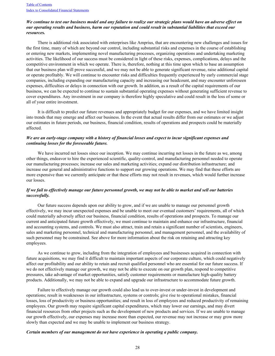 We continue to test our business model and any failure to realize our strategic plans would have an adverse effect on our operating results and business, harm our reputation and could result in substantial liabilities that exceed our resources. There is additional risk associated with enterprises like Amprius, that are encountering new challenges and issues for the first time, many of which are beyond our control, including substantial risks and expenses in the course of establishing or entering new markets, implementing novel manufacturing processes, organizing operations and undertaking marketing activities. The likelihood of our success must be considered in light of these risks, expenses, complications, delays and the competitive environment in which we operate. There is, therefore, nothing at this time upon which to base an assumption that our business plan will prove successful, and we may not be able to generate significant revenue, raise additional capital or operate profitably. We will continue to encounter risks and difficulties frequently experienced by early commercial stage companies, including expanding our manufacturing capacity and increasing our headcount, and may encounter unforeseen expenses, difficulties or delays in connection with our growth. In addition, as a result of the capital requirements of our business, we can be expected to continue to sustain substantial operating expenses without generating sufficient revenue to cover expenditures. Any investment in our company is therefore highly speculative and could result in the loss of some or all of your entire investment. It is difficult to predict our future revenues and appropriately budget for our expenses, and we have limited insight into trends that may emerge and affect our business. In the event that actual results differ from our estimates or we adjust our estimates in future periods, our business, financial condition, results of operations and prospects could be materially affected. We are an early-stage company with a history of financial losses and expect to incur significant expenses and continuing losses for the foreseeable future. We have incurred net losses since our inception. We may continue incurring net losses in the future as we, among other things, endeavor to hire the experienced scientific, quality-control, and manufacturing personnel needed to operate our manufacturing processes; increase our sales and marketing activities; expand our distribution infrastructure; and increase our general and administrative functions to support our growing operations. We may find that these efforts are more expensive than we currently anticipate or that these efforts may not result in revenues, which would further increase our losses. If we fail to effectively manage our future personnel growth, we may not be able to market and sell our batteries successfully. Our future success depends upon our ability to grow, and if we are unable to manage our personnel growth effectively, we may incur unexpected expenses and be unable to meet our eventual customers’ requirements, all of which could materially adversely affect our business, financial condition, results of operations and prospects. To manage our current and anticipated future growth effectively, we must continue to maintain and enhance our infrastructure, financial and accounting systems, and controls. We must also attract, train and retain a significant number of scientists, engineers, sales and marketing personnel, technical and manufacturing personnel, and management personnel, and the availability of such personnel may be constrained. See above for more information about the risk on retaining and attracting key employees. As we continue to grow, including from the integration of employees and businesses acquired in connection with future acquisitions, we may find it difficult to maintain important aspects of our corporate culture, which could negatively affect our profitability and our ability to retain and recruit qualified personnel who are essential for our future success. If we do not effectively manage our growth, we may not be able to execute on our growth plan, respond to competitive pressures, take advantage of market opportunities, satisfy customer requirements or manufacture high-quality battery products. Additionally, we may not be able to expand and upgrade our infrastructure to accommodate future growth. Failure to effectively manage our growth could also lead us to over-invest or under-invest in development and operations; result in weaknesses in our infrastructure, systems or controls; give rise to operational mistakes, financial losses, loss of productivity or business opportunities; and result in loss of employees and reduced productivity of remaining employees. Our growth may require significant capital expenditures, which may lower our earnings, and may divert financial resources from other projects such as the development of new products and services. If we are unable to manage our growth effectively, our expenses may increase more than expected, our revenue may not increase or may grow more slowly than expected and we may be unable to implement our business strategy. Certain members of our management do not have experience in operating a public company. Table of Contents Index to Consolidated Financial Statements 28