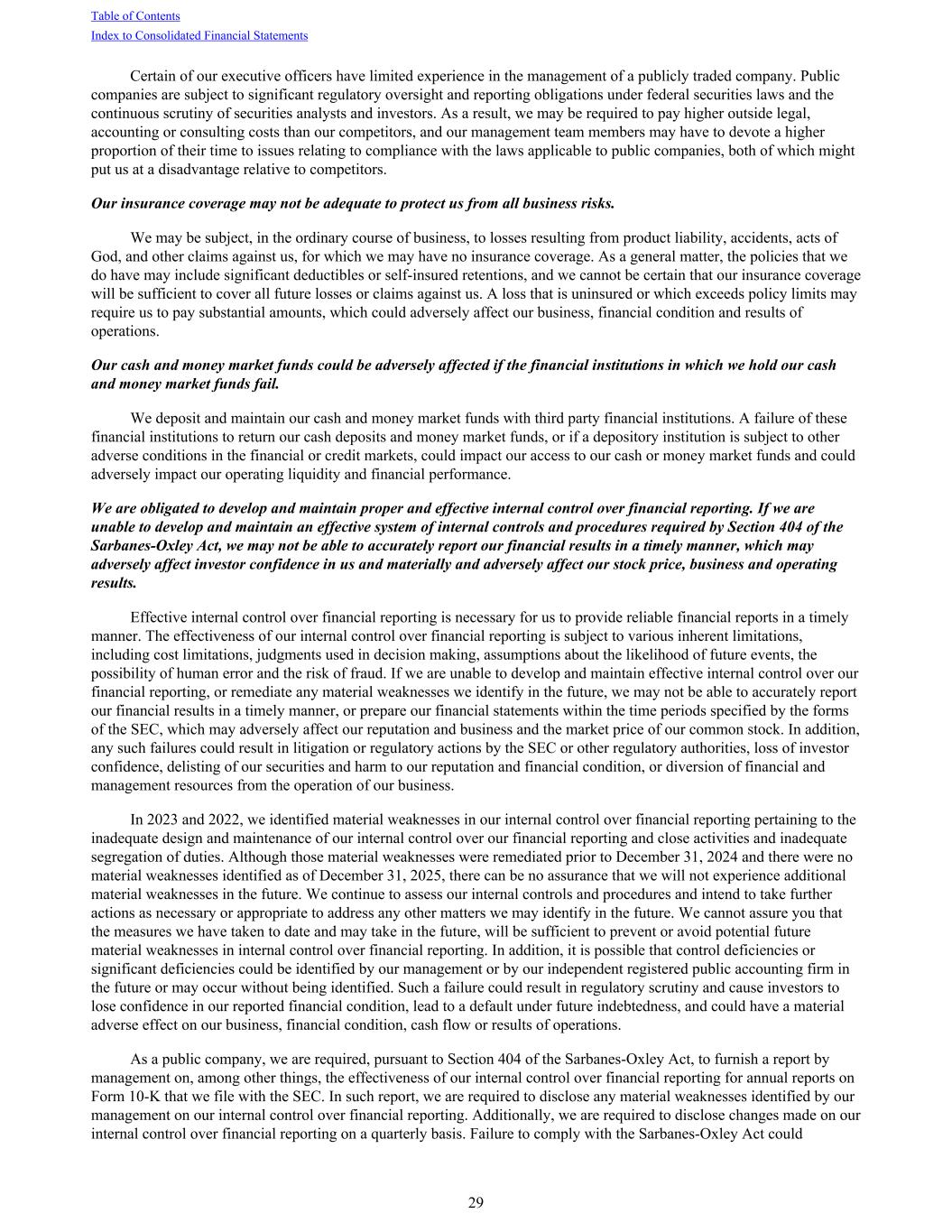 Certain of our executive officers have limited experience in the management of a publicly traded company. Public companies are subject to significant regulatory oversight and reporting obligations under federal securities laws and the continuous scrutiny of securities analysts and investors. As a result, we may be required to pay higher outside legal, accounting or consulting costs than our competitors, and our management team members may have to devote a higher proportion of their time to issues relating to compliance with the laws applicable to public companies, both of which might put us at a disadvantage relative to competitors. Our insurance coverage may not be adequate to protect us from all business risks. We may be subject, in the ordinary course of business, to losses resulting from product liability, accidents, acts of God, and other claims against us, for which we may have no insurance coverage. As a general matter, the policies that we do have may include significant deductibles or self-insured retentions, and we cannot be certain that our insurance coverage will be sufficient to cover all future losses or claims against us. A loss that is uninsured or which exceeds policy limits may require us to pay substantial amounts, which could adversely affect our business, financial condition and results of operations. Our cash and money market funds could be adversely affected if the financial institutions in which we hold our cash and money market funds fail. We deposit and maintain our cash and money market funds with third party financial institutions. A failure of these financial institutions to return our cash deposits and money market funds, or if a depository institution is subject to other adverse conditions in the financial or credit markets, could impact our access to our cash or money market funds and could adversely impact our operating liquidity and financial performance. We are obligated to develop and maintain proper and effective internal control over financial reporting. If we are unable to develop and maintain an effective system of internal controls and procedures required by Section 404 of the Sarbanes-Oxley Act, we may not be able to accurately report our financial results in a timely manner, which may adversely affect investor confidence in us and materially and adversely affect our stock price, business and operating results. Effective internal control over financial reporting is necessary for us to provide reliable financial reports in a timely manner. The effectiveness of our internal control over financial reporting is subject to various inherent limitations, including cost limitations, judgments used in decision making, assumptions about the likelihood of future events, the possibility of human error and the risk of fraud. If we are unable to develop and maintain effective internal control over our financial reporting, or remediate any material weaknesses we identify in the future, we may not be able to accurately report our financial results in a timely manner, or prepare our financial statements within the time periods specified by the forms of the SEC, which may adversely affect our reputation and business and the market price of our common stock. In addition, any such failures could result in litigation or regulatory actions by the SEC or other regulatory authorities, loss of investor confidence, delisting of our securities and harm to our reputation and financial condition, or diversion of financial and management resources from the operation of our business. In 2023 and 2022, we identified material weaknesses in our internal control over financial reporting pertaining to the inadequate design and maintenance of our internal control over our financial reporting and close activities and inadequate segregation of duties. Although those material weaknesses were remediated prior to December 31, 2024 and there were no material weaknesses identified as of December 31, 2025, there can be no assurance that we will not experience additional material weaknesses in the future. We continue to assess our internal controls and procedures and intend to take further actions as necessary or appropriate to address any other matters we may identify in the future. We cannot assure you that the measures we have taken to date and may take in the future, will be sufficient to prevent or avoid potential future material weaknesses in internal control over financial reporting. In addition, it is possible that control deficiencies or significant deficiencies could be identified by our management or by our independent registered public accounting firm in the future or may occur without being identified. Such a failure could result in regulatory scrutiny and cause investors to lose confidence in our reported financial condition, lead to a default under future indebtedness, and could have a material adverse effect on our business, financial condition, cash flow or results of operations. As a public company, we are required, pursuant to Section 404 of the Sarbanes-Oxley Act, to furnish a report by management on, among other things, the effectiveness of our internal control over financial reporting for annual reports on Form 10-K that we file with the SEC. In such report, we are required to disclose any material weaknesses identified by our management on our internal control over financial reporting. Additionally, we are required to disclose changes made on our internal control over financial reporting on a quarterly basis. Failure to comply with the Sarbanes-Oxley Act could Table of Contents Index to Consolidated Financial Statements 29