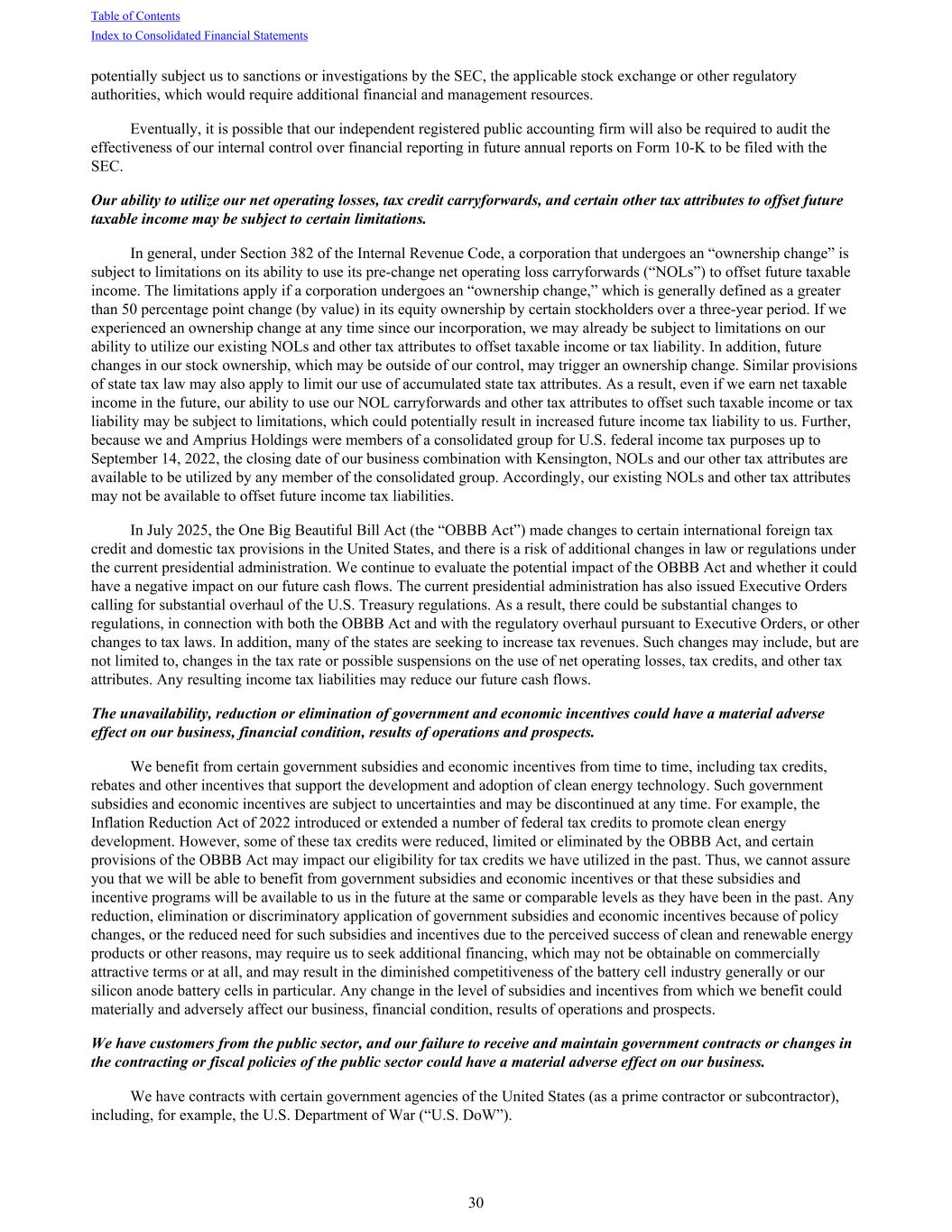 potentially subject us to sanctions or investigations by the SEC, the applicable stock exchange or other regulatory authorities, which would require additional financial and management resources. Eventually, it is possible that our independent registered public accounting firm will also be required to audit the effectiveness of our internal control over financial reporting in future annual reports on Form 10-K to be filed with the SEC. Our ability to utilize our net operating losses, tax credit carryforwards, and certain other tax attributes to offset future taxable income may be subject to certain limitations. In general, under Section 382 of the Internal Revenue Code, a corporation that undergoes an “ownership change” is subject to limitations on its ability to use its pre-change net operating loss carryforwards (“NOLs”) to offset future taxable income. The limitations apply if a corporation undergoes an “ownership change,” which is generally defined as a greater than 50 percentage point change (by value) in its equity ownership by certain stockholders over a three-year period. If we experienced an ownership change at any time since our incorporation, we may already be subject to limitations on our ability to utilize our existing NOLs and other tax attributes to offset taxable income or tax liability. In addition, future changes in our stock ownership, which may be outside of our control, may trigger an ownership change. Similar provisions of state tax law may also apply to limit our use of accumulated state tax attributes. As a result, even if we earn net taxable income in the future, our ability to use our NOL carryforwards and other tax attributes to offset such taxable income or tax liability may be subject to limitations, which could potentially result in increased future income tax liability to us. Further, because we and Amprius Holdings were members of a consolidated group for U.S. federal income tax purposes up to September 14, 2022, the closing date of our business combination with Kensington, NOLs and our other tax attributes are available to be utilized by any member of the consolidated group. Accordingly, our existing NOLs and other tax attributes may not be available to offset future income tax liabilities. In July 2025, the One Big Beautiful Bill Act (the “OBBB Act”) made changes to certain international foreign tax credit and domestic tax provisions in the United States, and there is a risk of additional changes in law or regulations under the current presidential administration. We continue to evaluate the potential impact of the OBBB Act and whether it could have a negative impact on our future cash flows. The current presidential administration has also issued Executive Orders calling for substantial overhaul of the U.S. Treasury regulations. As a result, there could be substantial changes to regulations, in connection with both the OBBB Act and with the regulatory overhaul pursuant to Executive Orders, or other changes to tax laws. In addition, many of the states are seeking to increase tax revenues. Such changes may include, but are not limited to, changes in the tax rate or possible suspensions on the use of net operating losses, tax credits, and other tax attributes. Any resulting income tax liabilities may reduce our future cash flows. The unavailability, reduction or elimination of government and economic incentives could have a material adverse effect on our business, financial condition, results of operations and prospects. We benefit from certain government subsidies and economic incentives from time to time, including tax credits, rebates and other incentives that support the development and adoption of clean energy technology. Such government subsidies and economic incentives are subject to uncertainties and may be discontinued at any time. For example, the Inflation Reduction Act of 2022 introduced or extended a number of federal tax credits to promote clean energy development. However, some of these tax credits were reduced, limited or eliminated by the OBBB Act, and certain provisions of the OBBB Act may impact our eligibility for tax credits we have utilized in the past. Thus, we cannot assure you that we will be able to benefit from government subsidies and economic incentives or that these subsidies and incentive programs will be available to us in the future at the same or comparable levels as they have been in the past. Any reduction, elimination or discriminatory application of government subsidies and economic incentives because of policy changes, or the reduced need for such subsidies and incentives due to the perceived success of clean and renewable energy products or other reasons, may require us to seek additional financing, which may not be obtainable on commercially attractive terms or at all, and may result in the diminished competitiveness of the battery cell industry generally or our silicon anode battery cells in particular. Any change in the level of subsidies and incentives from which we benefit could materially and adversely affect our business, financial condition, results of operations and prospects. We have customers from the public sector, and our failure to receive and maintain government contracts or changes in the contracting or fiscal policies of the public sector could have a material adverse effect on our business. We have contracts with certain government agencies of the United States (as a prime contractor or subcontractor), including, for example, the U.S. Department of War (“U.S. DoW”). Table of Contents Index to Consolidated Financial Statements 30