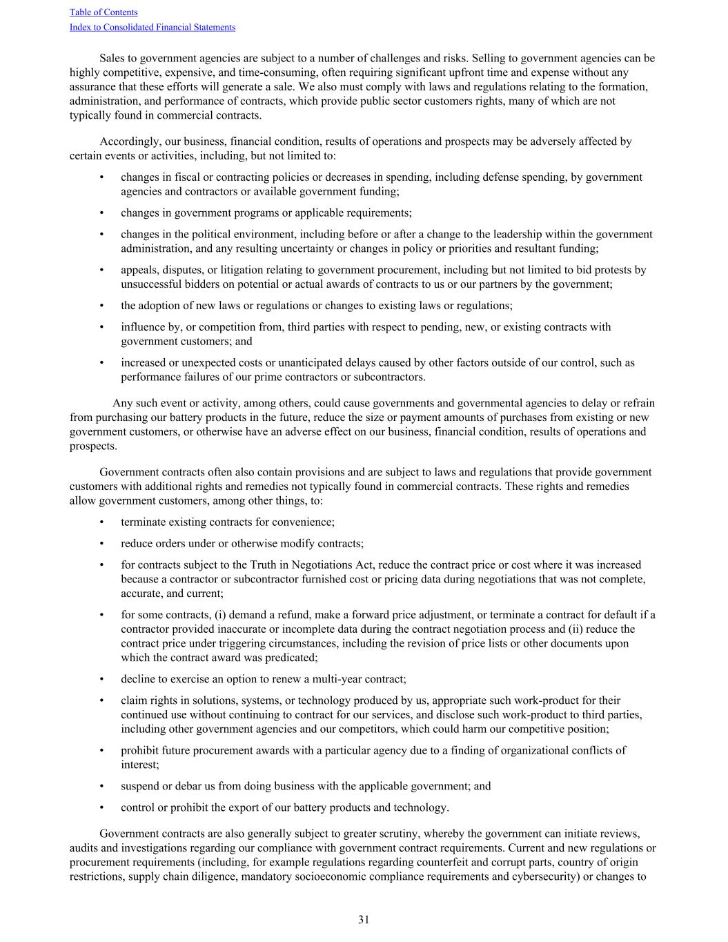 Sales to government agencies are subject to a number of challenges and risks. Selling to government agencies can be highly competitive, expensive, and time-consuming, often requiring significant upfront time and expense without any assurance that these efforts will generate a sale. We also must comply with laws and regulations relating to the formation, administration, and performance of contracts, which provide public sector customers rights, many of which are not typically found in commercial contracts. Accordingly, our business, financial condition, results of operations and prospects may be adversely affected by certain events or activities, including, but not limited to: • changes in fiscal or contracting policies or decreases in spending, including defense spending, by government agencies and contractors or available government funding; • changes in government programs or applicable requirements; • changes in the political environment, including before or after a change to the leadership within the government administration, and any resulting uncertainty or changes in policy or priorities and resultant funding; • appeals, disputes, or litigation relating to government procurement, including but not limited to bid protests by unsuccessful bidders on potential or actual awards of contracts to us or our partners by the government; • the adoption of new laws or regulations or changes to existing laws or regulations; • influence by, or competition from, third parties with respect to pending, new, or existing contracts with government customers; and • increased or unexpected costs or unanticipated delays caused by other factors outside of our control, such as performance failures of our prime contractors or subcontractors. Any such event or activity, among others, could cause governments and governmental agencies to delay or refrain from purchasing our battery products in the future, reduce the size or payment amounts of purchases from existing or new government customers, or otherwise have an adverse effect on our business, financial condition, results of operations and prospects. Government contracts often also contain provisions and are subject to laws and regulations that provide government customers with additional rights and remedies not typically found in commercial contracts. These rights and remedies allow government customers, among other things, to: • terminate existing contracts for convenience; • reduce orders under or otherwise modify contracts; • for contracts subject to the Truth in Negotiations Act, reduce the contract price or cost where it was increased because a contractor or subcontractor furnished cost or pricing data during negotiations that was not complete, accurate, and current; • for some contracts, (i) demand a refund, make a forward price adjustment, or terminate a contract for default if a contractor provided inaccurate or incomplete data during the contract negotiation process and (ii) reduce the contract price under triggering circumstances, including the revision of price lists or other documents upon which the contract award was predicated; • decline to exercise an option to renew a multi-year contract; • claim rights in solutions, systems, or technology produced by us, appropriate such work-product for their continued use without continuing to contract for our services, and disclose such work-product to third parties, including other government agencies and our competitors, which could harm our competitive position; • prohibit future procurement awards with a particular agency due to a finding of organizational conflicts of interest; • suspend or debar us from doing business with the applicable government; and • control or prohibit the export of our battery products and technology. Government contracts are also generally subject to greater scrutiny, whereby the government can initiate reviews, audits and investigations regarding our compliance with government contract requirements. Current and new regulations or procurement requirements (including, for example regulations regarding counterfeit and corrupt parts, country of origin restrictions, supply chain diligence, mandatory socioeconomic compliance requirements and cybersecurity) or changes to Table of Contents Index to Consolidated Financial Statements 31