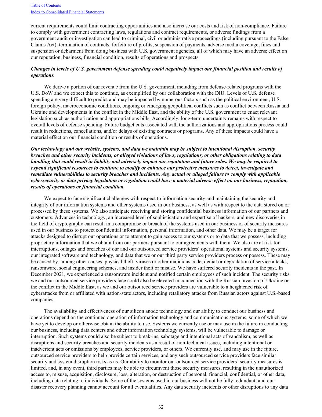 current requirements could limit contracting opportunities and also increase our costs and risk of non-compliance. Failure to comply with government contracting laws, regulations and contract requirements, or adverse findings from a government audit or investigation can lead to criminal, civil or administrative proceedings (including pursuant to the False Claims Act), termination of contracts, forfeiture of profits, suspension of payments, adverse media coverage, fines and suspension or debarment from doing business with U.S. government agencies, all of which may have an adverse effect on our reputation, business, financial condition, results of operations and prospects. Changes in levels of U.S. government defense spending could negatively impact our financial position and results of operations. We derive a portion of our revenue from the U.S. government, including from defense-related programs with the U.S. DoW and we expect this to continue, as exemplified by our collaboration with the DIU. Levels of U.S. defense spending are very difficult to predict and may be impacted by numerous factors such as the political environment, U.S. foreign policy, macroeconomic conditions, ongoing or emerging geopolitical conflicts such as conflict between Russia and Ukraine and developments in the conflict in the Middle East, and the ability of the U.S. government to enact relevant legislation such as authorization and appropriations bills. Accordingly, long-term uncertainty remains with respect to overall levels of defense spending. Future budget cuts associated with the authorizations and appropriations process could result in reductions, cancellations, and/or delays of existing contracts or programs. Any of these impacts could have a material effect on our financial condition or results of operations. Our technology and our website, systems, and data we maintain may be subject to intentional disruption, security breaches and other security incidents, or alleged violations of laws, regulations, or other obligations relating to data handling that could result in liability and adversely impact our reputation and future sales. We may be required to expend significant resources to continue to modify or enhance our protective measures to detect, investigate and remediate vulnerabilities to security breaches and incidents. Any actual or alleged failure to comply with applicable cybersecurity or data privacy legislation or regulation could have a material adverse effect on our business, reputation, results of operations or financial condition. We expect to face significant challenges with respect to information security and maintaining the security and integrity of our information systems and other systems used in our business, as well as with respect to the data stored on or processed by these systems. We also anticipate receiving and storing confidential business information of our partners and customers. Advances in technology, an increased level of sophistication and expertise of hackers, and new discoveries in the field of cryptography can result in a compromise or breach of the systems used in our business or of security measures used in our business to protect confidential information, personal information, and other data. We may be a target for attacks designed to disrupt our operations or to attempt to gain access to our systems or to data that we possess, including proprietary information that we obtain from our partners pursuant to our agreements with them. We also are at risk for interruptions, outages and breaches of our and our outsourced service providers’ operational systems and security systems, our integrated software and technology, and data that we or our third party service providers process or possess. These may be caused by, among other causes, physical theft, viruses or other malicious code, denial or degradation of service attacks, ransomware, social engineering schemes, and insider theft or misuse. We have suffered security incidents in the past. In December 2021, we experienced a ransomware incident and notified certain employees of such incident. The security risks we and our outsourced service providers face could also be elevated in connection with the Russian invasion of Ukraine or the conflict in the Middle East, as we and our outsourced service providers are vulnerable to a heightened risk of cyberattacks from or affiliated with nation-state actors, including retaliatory attacks from Russian actors against U.S.-based companies. The availability and effectiveness of our silicon anode technology and our ability to conduct our business and operations depend on the continued operation of information technology and communications systems, some of which we have yet to develop or otherwise obtain the ability to use. Systems we currently use or may use in the future in conducting our business, including data centers and other information technology systems, will be vulnerable to damage or interruption. Such systems could also be subject to break-ins, sabotage and intentional acts of vandalism, as well as disruptions and security breaches and security incidents as a result of non-technical issues, including intentional or inadvertent acts or omissions by employees, service providers, or others. We currently use, and may use in the future, outsourced service providers to help provide certain services, and any such outsourced service providers face similar security and system disruption risks as us. Our ability to monitor our outsourced service providers’ security measures is limited, and, in any event, third parties may be able to circumvent those security measures, resulting in the unauthorized access to, misuse, acquisition, disclosure, loss, alteration, or destruction of personal, financial, confidential, or other data, including data relating to individuals. Some of the systems used in our business will not be fully redundant, and our disaster recovery planning cannot account 