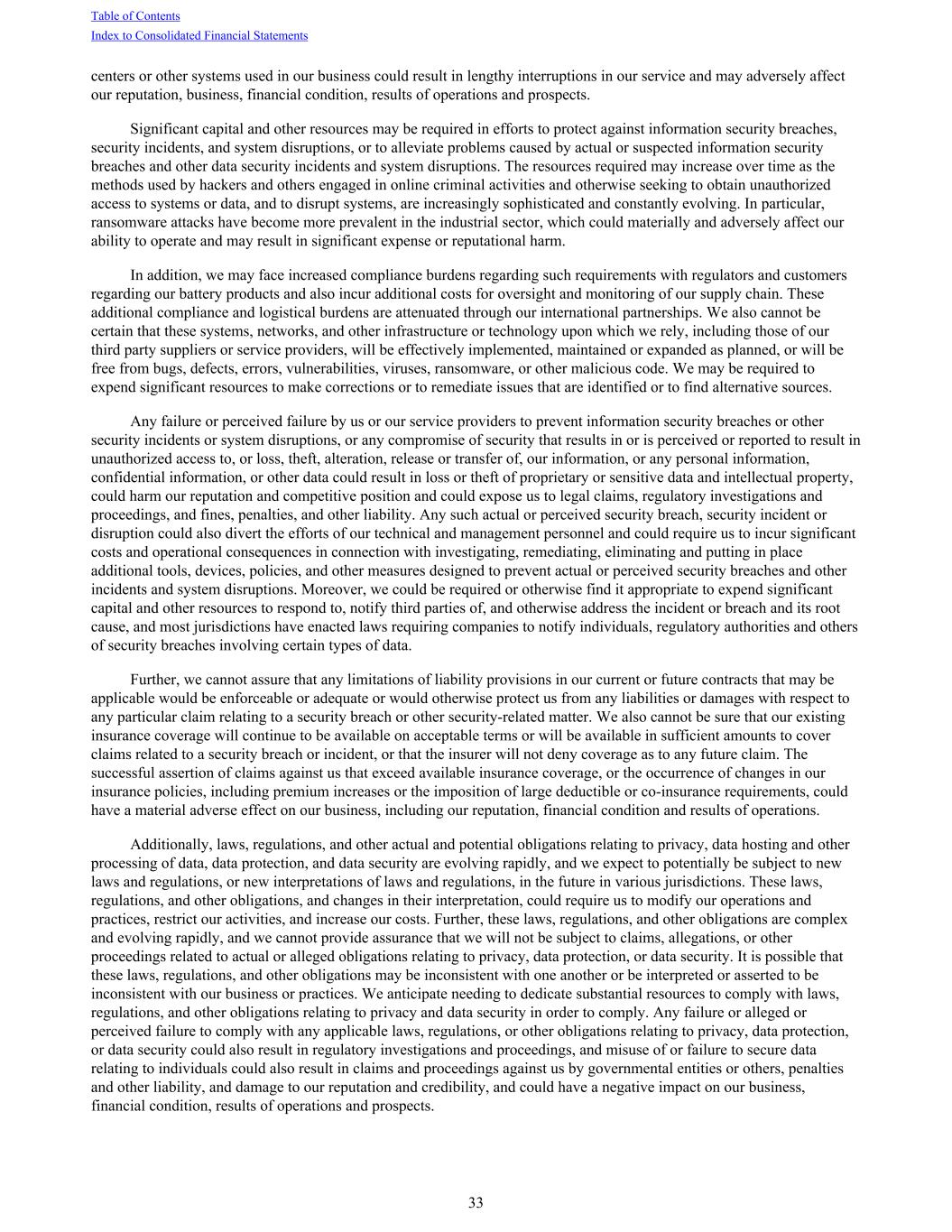 centers or other systems used in our business could result in lengthy interruptions in our service and may adversely affect our reputation, business, financial condition, results of operations and prospects. Significant capital and other resources may be required in efforts to protect against information security breaches, security incidents, and system disruptions, or to alleviate problems caused by actual or suspected information security breaches and other data security incidents and system disruptions. The resources required may increase over time as the methods used by hackers and others engaged in online criminal activities and otherwise seeking to obtain unauthorized access to systems or data, and to disrupt systems, are increasingly sophisticated and constantly evolving. In particular, ransomware attacks have become more prevalent in the industrial sector, which could materially and adversely affect our ability to operate and may result in significant expense or reputational harm. In addition, we may face increased compliance burdens regarding such requirements with regulators and customers regarding our battery products and also incur additional costs for oversight and monitoring of our supply chain. These additional compliance and logistical burdens are attenuated through our international partnerships. We also cannot be certain that these systems, networks, and other infrastructure or technology upon which we rely, including those of our third party suppliers or service providers, will be effectively implemented, maintained or expanded as planned, or will be free from bugs, defects, errors, vulnerabilities, viruses, ransomware, or other malicious code. We may be required to expend significant resources to make corrections or to remediate issues that are identified or to find alternative sources. Any failure or perceived failure by us or our service providers to prevent information security breaches or other security incidents or system disruptions, or any compromise of security that results in or is perceived or reported to result in unauthorized access to, or loss, theft, alteration, release or transfer of, our information, or any personal information, confidential information, or other data could result in loss or theft of proprietary or sensitive data and intellectual property, could harm our reputation and competitive position and could expose us to legal claims, regulatory investigations and proceedings, and fines, penalties, and other liability. Any such actual or perceived security breach, security incident or disruption could also divert the efforts of our technical and management personnel and could require us to incur significant costs and operational consequences in connection with investigating, remediating, eliminating and putting in place additional tools, devices, policies, and other measures designed to prevent actual or perceived security breaches and other incidents and system disruptions. Moreover, we could be required or otherwise find it appropriate to expend significant capital and other resources to respond to, notify third parties of, and otherwise address the incident or breach and its root cause, and most jurisdictions have enacted laws requiring companies to notify individuals, regulatory authorities and others of security breaches involving certain types of data. Further, we cannot assure that any limitations of liability provisions in our current or future contracts that may be applicable would be enforceable or adequate or would otherwise protect us from any liabilities or damages with respect to any particular claim relating to a security breach or other security-related matter. We also cannot be sure that our existing insurance coverage will continue to be available on acceptable terms or will be available in sufficient amounts to cover claims related to a security breach or incident, or that the insurer will not deny coverage as to any future claim. The successful assertion of claims against us that exceed available insurance coverage, or the occurrence of changes in our insurance policies, including premium increases or the imposition of large deductible or co-insurance requirements, could have a material adverse effect on our business, including our reputation, financial condition and results of operations. Additionally, laws, regulations, and other actual and potential obligations relating to privacy, data hosting and other processing of data, data protection, and data security are evolving rapidly, and we expect to potentially be subject to new laws and regulations, or new interpretations of laws and regulations, in the future in various jurisdictions. These laws, regulations, and other obligations, and changes in their interpretation, could require us to modify our operations and practices, restrict our activities, and increase our costs. Further, these laws, regulations, and other obligations are complex and evolving rapidly, and we cannot provide assurance that we will not be subject to claims, allegations, or other proceedings related to actual or alleged obligations relating to privacy, data protection, or data security. It is possible that these laws, regulations, and other obligations may be inconsistent with one another or be interpreted or asserted to be inconsistent with our business or practices. We anticipate needing to dedicate substantial resources to comply with laws, regulations, and other obligations relating to privacy and data security in order to comply. Any failure or alleged or perceived failure to comply with any applicable laws, regulations, or other obligations relating to privacy, data protection, or data security could also result in regulatory investigations and proceedings, and misuse of or failure to secure data relating to individuals could also result in claims and proceedings against us by governmental entities or others, penalties and other liability, and damage to our reputation and credibility, and could 