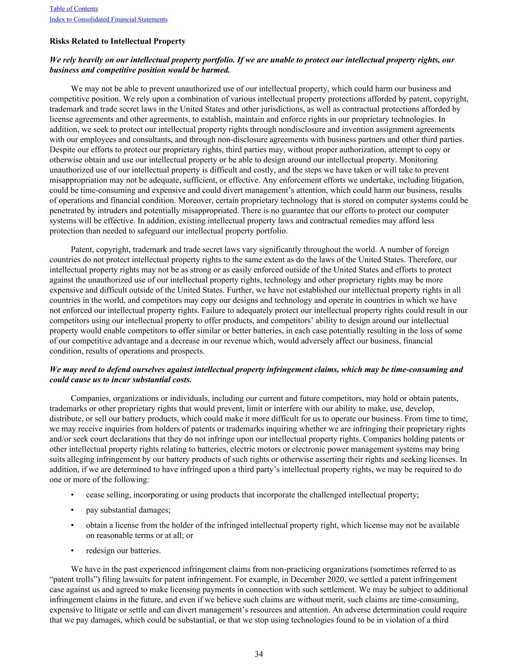 Risks Related to Intellectual Property We rely heavily on our intellectual property portfolio. If we are unable to protect our intellectual property rights, our business and competitive position would be harmed. We may not be able to prevent unauthorized use of our intellectual property, which could harm our business and competitive position. We rely upon a combination of various intellectual property protections afforded by patent, copyright, trademark and trade secret laws in the United States and other jurisdictions, as well as contractual protections afforded by license agreements and other agreements, to establish, maintain and enforce rights in our proprietary technologies. In addition, we seek to protect our intellectual property rights through nondisclosure and invention assignment agreements with our employees and consultants, and through non-disclosure agreements with business partners and other third parties. Despite our efforts to protect our proprietary rights, third parties may, without proper authorization, attempt to copy or otherwise obtain and use our intellectual property or be able to design around our intellectual property. Monitoring unauthorized use of our intellectual property is difficult and costly, and the steps we have taken or will take to prevent misappropriation may not be adequate, sufficient, or effective. Any enforcement efforts we undertake, including litigation, could be time-consuming and expensive and could divert management’s attention, which could harm our business, results of operations and financial condition. Moreover, certain proprietary technology that is stored on computer systems could be penetrated by intruders and potentially misappropriated. There is no guarantee that our efforts to protect our computer systems will be effective. In addition, existing intellectual property laws and contractual remedies may afford less protection than needed to safeguard our intellectual property portfolio. Patent, copyright, trademark and trade secret laws vary significantly throughout the world. A number of foreign countries do not protect intellectual property rights to the same extent as do the laws of the United States. Therefore, our intellectual property rights may not be as strong or as easily enforced outside of the United States and efforts to protect against the unauthorized use of our intellectual property rights, technology and other proprietary rights may be more expensive and difficult outside of the United States. Further, we have not established our intellectual property rights in all countries in the world, and competitors may copy our designs and technology and operate in countries in which we have not enforced our intellectual property rights. Failure to adequately protect our intellectual property rights could result in our competitors using our intellectual property to offer products, and competitors’ ability to design around our intellectual property would enable competitors to offer similar or better batteries, in each case potentially resulting in the loss of some of our competitive advantage and a decrease in our revenue which, would adversely affect our business, financial condition, results of operations and prospects. We may need to defend ourselves against intellectual property infringement claims, which may be time-consuming and could cause us to incur substantial costs. Companies, organizations or individuals, including our current and future competitors, may hold or obtain patents, trademarks or other proprietary rights that would prevent, limit or interfere with our ability to make, use, develop, distribute, or sell our battery products, which could make it more difficult for us to operate our business. From time to time, we may receive inquiries from holders of patents or trademarks inquiring whether we are infringing their proprietary rights and/or seek court declarations that they do not infringe upon our intellectual property rights. Companies holding patents or other intellectual property rights relating to batteries, electric motors or electronic power management systems may bring suits alleging infringement by our battery products of such rights or otherwise asserting their rights and seeking licenses. In addition, if we are determined to have infringed upon a third party’s intellectual property rights, we may be required to do one or more of the following: • cease selling, incorporating or using products that incorporate the challenged intellectual property; • pay substantial damages; • obtain a license from the holder of the infringed intellectual property right, which license may not be available on reasonable terms or at all; or • redesign our batteries. We have in the past experienced infringement claims from non-practicing organizations (sometimes referred to as “patent trolls”) filing lawsuits for patent infringement. For example, in December 2020, we settled a patent infringement case against us and agreed to make licensing payments in connection with such settlement. We may be subject to additional infringement claims in the future, and even if we believe such claims are without merit, such claims are time-consuming, expensive to litigate or settle and can divert management’s resources and attention. An adverse determination could require that we pay damages, which could be substantial, or that we stop using technologies found to be in violation of a third Table of Contents Index to Consolidated Financial Statements 34