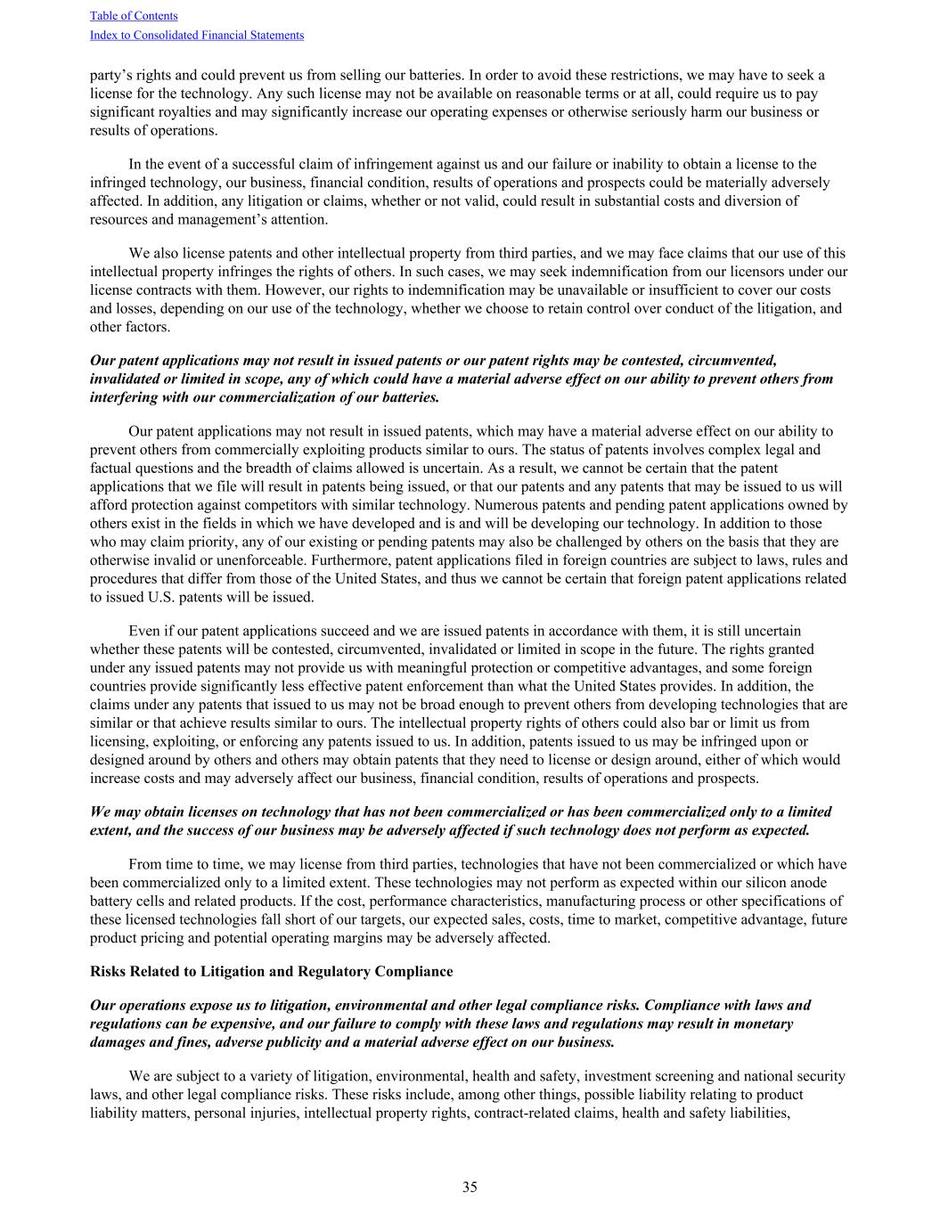 party’s rights and could prevent us from selling our batteries. In order to avoid these restrictions, we may have to seek a license for the technology. Any such license may not be available on reasonable terms or at all, could require us to pay significant royalties and may significantly increase our operating expenses or otherwise seriously harm our business or results of operations. In the event of a successful claim of infringement against us and our failure or inability to obtain a license to the infringed technology, our business, financial condition, results of operations and prospects could be materially adversely affected. In addition, any litigation or claims, whether or not valid, could result in substantial costs and diversion of resources and management’s attention. We also license patents and other intellectual property from third parties, and we may face claims that our use of this intellectual property infringes the rights of others. In such cases, we may seek indemnification from our licensors under our license contracts with them. However, our rights to indemnification may be unavailable or insufficient to cover our costs and losses, depending on our use of the technology, whether we choose to retain control over conduct of the litigation, and other factors. Our patent applications may not result in issued patents or our patent rights may be contested, circumvented, invalidated or limited in scope, any of which could have a material adverse effect on our ability to prevent others from interfering with our commercialization of our batteries. Our patent applications may not result in issued patents, which may have a material adverse effect on our ability to prevent others from commercially exploiting products similar to ours. The status of patents involves complex legal and factual questions and the breadth of claims allowed is uncertain. As a result, we cannot be certain that the patent applications that we file will result in patents being issued, or that our patents and any patents that may be issued to us will afford protection against competitors with similar technology. Numerous patents and pending patent applications owned by others exist in the fields in which we have developed and is and will be developing our technology. In addition to those who may claim priority, any of our existing or pending patents may also be challenged by others on the basis that they are otherwise invalid or unenforceable. Furthermore, patent applications filed in foreign countries are subject to laws, rules and procedures that differ from those of the United States, and thus we cannot be certain that foreign patent applications related to issued U.S. patents will be issued. Even if our patent applications succeed and we are issued patents in accordance with them, it is still uncertain whether these patents will be contested, circumvented, invalidated or limited in scope in the future. The rights granted under any issued patents may not provide us with meaningful protection or competitive advantages, and some foreign countries provide significantly less effective patent enforcement than what the United States provides. In addition, the claims under any patents that issued to us may not be broad enough to prevent others from developing technologies that are similar or that achieve results similar to ours. The intellectual property rights of others could also bar or limit us from licensing, exploiting, or enforcing any patents issued to us. In addition, patents issued to us may be infringed upon or designed around by others and others may obtain patents that they need to license or design around, either of which would increase costs and may adversely affect our business, financial condition, results of operations and prospects. We may obtain licenses on technology that has not been commercialized or has been commercialized only to a limited extent, and the success of our business may be adversely affected if such technology does not perform as expected. From time to time, we may license from third parties, technologies that have not been commercialized or which have been commercialized only to a limited extent. These technologies may not perform as expected within our silicon anode battery cells and related products. If the cost, performance characteristics, manufacturing process or other specifications of these licensed technologies fall short of our targets, our expected sales, costs, time to market, competitive advantage, future product pricing and potential operating margins may be adversely affected. Risks Related to Litigation and Regulatory Compliance Our operations expose us to litigation, environmental and other legal compliance risks. Compliance with laws and regulations can be expensive, and our failure to comply with these laws and regulations may result in monetary damages and fines, adverse publicity and a material adverse effect on our business. We are subject to a variety of litigation, environmental, health and safety, investment screening and national security laws, and other legal compliance risks. These risks include, among other things, possible liability relating to product liability matters, personal injuries, intellectual property rights, contract-related claims, health and safety liabilities, Table of Contents Index to Consolidated Financial Statements 35