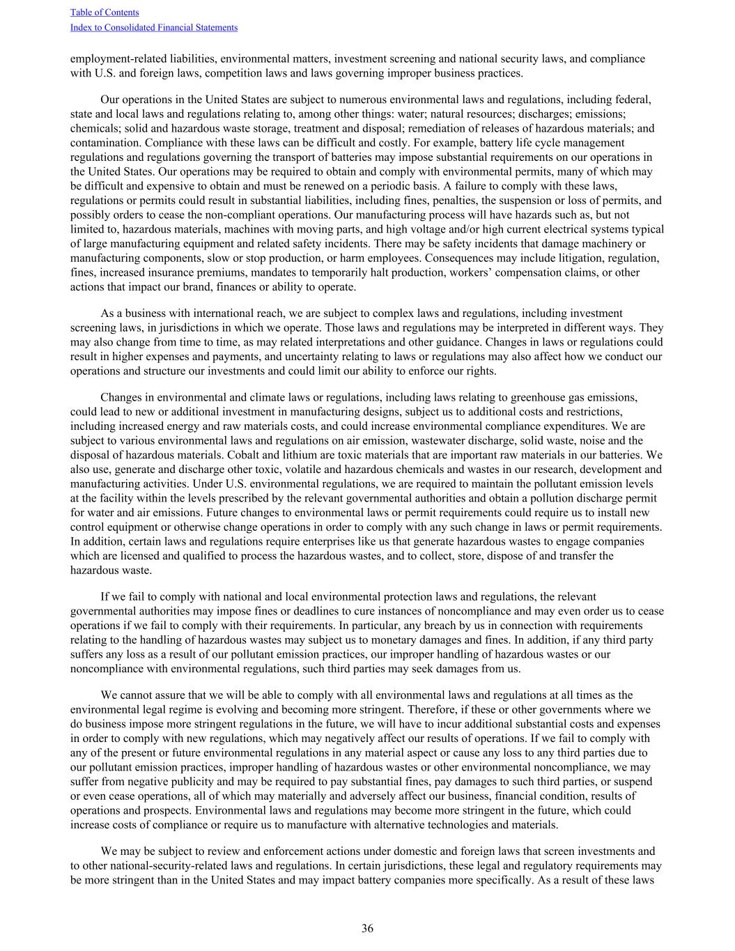 employment-related liabilities, environmental matters, investment screening and national security laws, and compliance with U.S. and foreign laws, competition laws and laws governing improper business practices. Our operations in the United States are subject to numerous environmental laws and regulations, including federal, state and local laws and regulations relating to, among other things: water; natural resources; discharges; emissions; chemicals; solid and hazardous waste storage, treatment and disposal; remediation of releases of hazardous materials; and contamination. Compliance with these laws can be difficult and costly. For example, battery life cycle management regulations and regulations governing the transport of batteries may impose substantial requirements on our operations in the United States. Our operations may be required to obtain and comply with environmental permits, many of which may be difficult and expensive to obtain and must be renewed on a periodic basis. A failure to comply with these laws, regulations or permits could result in substantial liabilities, including fines, penalties, the suspension or loss of permits, and possibly orders to cease the non-compliant operations. Our manufacturing process will have hazards such as, but not limited to, hazardous materials, machines with moving parts, and high voltage and/or high current electrical systems typical of large manufacturing equipment and related safety incidents. There may be safety incidents that damage machinery or manufacturing components, slow or stop production, or harm employees. Consequences may include litigation, regulation, fines, increased insurance premiums, mandates to temporarily halt production, workers’ compensation claims, or other actions that impact our brand, finances or ability to operate. As a business with international reach, we are subject to complex laws and regulations, including investment screening laws, in jurisdictions in which we operate. Those laws and regulations may be interpreted in different ways. They may also change from time to time, as may related interpretations and other guidance. Changes in laws or regulations could result in higher expenses and payments, and uncertainty relating to laws or regulations may also affect how we conduct our operations and structure our investments and could limit our ability to enforce our rights. Changes in environmental and climate laws or regulations, including laws relating to greenhouse gas emissions, could lead to new or additional investment in manufacturing designs, subject us to additional costs and restrictions, including increased energy and raw materials costs, and could increase environmental compliance expenditures. We are subject to various environmental laws and regulations on air emission, wastewater discharge, solid waste, noise and the disposal of hazardous materials. Cobalt and lithium are toxic materials that are important raw materials in our batteries. We also use, generate and discharge other toxic, volatile and hazardous chemicals and wastes in our research, development and manufacturing activities. Under U.S. environmental regulations, we are required to maintain the pollutant emission levels at the facility within the levels prescribed by the relevant governmental authorities and obtain a pollution discharge permit for water and air emissions. Future changes to environmental laws or permit requirements could require us to install new control equipment or otherwise change operations in order to comply with any such change in laws or permit requirements. In addition, certain laws and regulations require enterprises like us that generate hazardous wastes to engage companies which are licensed and qualified to process the hazardous wastes, and to collect, store, dispose of and transfer the hazardous waste. If we fail to comply with national and local environmental protection laws and regulations, the relevant governmental authorities may impose fines or deadlines to cure instances of noncompliance and may even order us to cease operations if we fail to comply with their requirements. In particular, any breach by us in connection with requirements relating to the handling of hazardous wastes may subject us to monetary damages and fines. In addition, if any third party suffers any loss as a result of our pollutant emission practices, our improper handling of hazardous wastes or our noncompliance with environmental regulations, such third parties may seek damages from us. We cannot assure that we will be able to comply with all environmental laws and regulations at all times as the environmental legal regime is evolving and becoming more stringent. Therefore, if these or other governments where we do business impose more stringent regulations in the future, we will have to incur additional substantial costs and expenses in order to comply with new regulations, which may negatively affect our results of operations. If we fail to comply with any of the present or future environmental regulations in any material aspect or cause any loss to any third parties due to our pollutant emission practices, improper handling of hazardous wastes or other environmental noncompliance, we may suffer from negative publicity and may be required to pay substantial fines, pay damages to such third parties, or suspend or even cease operations, all of which may materially and adversely affect our business, financial condition, results of operations and prospects. Environmental laws and regulations may become more stringent in the future, which could increase costs of compliance or require us to manufacture with alternative technologies and materials. We may be subject to review and enforcement actions under domestic and foreign laws that screen investments and to other national-security-related laws and regulations. In certain jurisdictions, these legal and regulatory requirements may be more stringent than in the United States and 