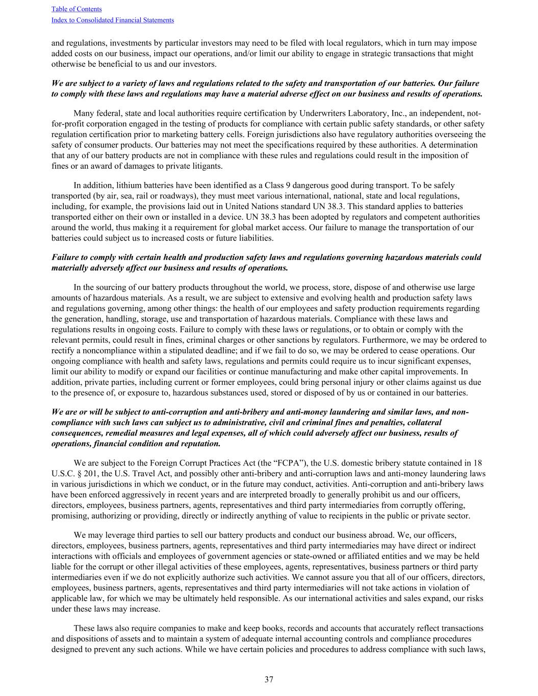 and regulations, investments by particular investors may need to be filed with local regulators, which in turn may impose added costs on our business, impact our operations, and/or limit our ability to engage in strategic transactions that might otherwise be beneficial to us and our investors. We are subject to a variety of laws and regulations related to the safety and transportation of our batteries. Our failure to comply with these laws and regulations may have a material adverse effect on our business and results of operations. Many federal, state and local authorities require certification by Underwriters Laboratory, Inc., an independent, not- for-profit corporation engaged in the testing of products for compliance with certain public safety standards, or other safety regulation certification prior to marketing battery cells. Foreign jurisdictions also have regulatory authorities overseeing the safety of consumer products. Our batteries may not meet the specifications required by these authorities. A determination that any of our battery products are not in compliance with these rules and regulations could result in the imposition of fines or an award of damages to private litigants. In addition, lithium batteries have been identified as a Class 9 dangerous good during transport. To be safely transported (by air, sea, rail or roadways), they must meet various international, national, state and local regulations, including, for example, the provisions laid out in United Nations standard UN 38.3. This standard applies to batteries transported either on their own or installed in a device. UN 38.3 has been adopted by regulators and competent authorities around the world, thus making it a requirement for global market access. Our failure to manage the transportation of our batteries could subject us to increased costs or future liabilities. Failure to comply with certain health and production safety laws and regulations governing hazardous materials could materially adversely affect our business and results of operations. In the sourcing of our battery products throughout the world, we process, store, dispose of and otherwise use large amounts of hazardous materials. As a result, we are subject to extensive and evolving health and production safety laws and regulations governing, among other things: the health of our employees and safety production requirements regarding the generation, handling, storage, use and transportation of hazardous materials. Compliance with these laws and regulations results in ongoing costs. Failure to comply with these laws or regulations, or to obtain or comply with the relevant permits, could result in fines, criminal charges or other sanctions by regulators. Furthermore, we may be ordered to rectify a noncompliance within a stipulated deadline; and if we fail to do so, we may be ordered to cease operations. Our ongoing compliance with health and safety laws, regulations and permits could require us to incur significant expenses, limit our ability to modify or expand our facilities or continue manufacturing and make other capital improvements. In addition, private parties, including current or former employees, could bring personal injury or other claims against us due to the presence of, or exposure to, hazardous substances used, stored or disposed of by us or contained in our batteries. We are or will be subject to anti-corruption and anti-bribery and anti-money laundering and similar laws, and non- compliance with such laws can subject us to administrative, civil and criminal fines and penalties, collateral consequences, remedial measures and legal expenses, all of which could adversely affect our business, results of operations, financial condition and reputation. We are subject to the Foreign Corrupt Practices Act (the “FCPA”), the U.S. domestic bribery statute contained in 18 U.S.C. § 201, the U.S. Travel Act, and possibly other anti-bribery and anti-corruption laws and anti-money laundering laws in various jurisdictions in which we conduct, or in the future may conduct, activities. Anti-corruption and anti-bribery laws have been enforced aggressively in recent years and are interpreted broadly to generally prohibit us and our officers, directors, employees, business partners, agents, representatives and third party intermediaries from corruptly offering, promising, authorizing or providing, directly or indirectly anything of value to recipients in the public or private sector. We may leverage third parties to sell our battery products and conduct our business abroad. We, our officers, directors, employees, business partners, agents, representatives and third party intermediaries may have direct or indirect interactions with officials and employees of government agencies or state-owned or affiliated entities and we may be held liable for the corrupt or other illegal activities of these employees, agents, representatives, business partners or third party intermediaries even if we do not explicitly authorize such activities. We cannot assure you that all of our officers, directors, employees, business partners, agents, representatives and third party intermediaries will not take actions in violation of applicable law, for which we may be ultimately held responsible. As our international activities and sales expand, our risks under these laws may increase. These laws also require companies to make and keep books, records and accounts that accurately reflect transactions and dispositions of assets and to maintain a system of adequate internal accounting controls and compliance procedures designed to prevent any such actions. While we have certain policies and procedures to address compliance with such laws, Table of Contents Index to Consolidated Financial Statements 37