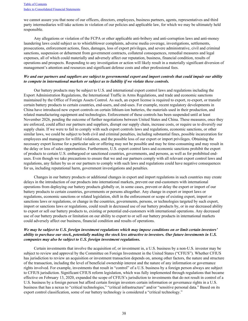 we cannot assure you that none of our officers, directors, employees, business partners, agents, representatives and third party intermediaries will take actions in violation of our policies and applicable law, for which we may be ultimately held responsible. Any allegations or violation of the FCPA or other applicable anti-bribery and anti-corruption laws and anti-money laundering laws could subject us to whistleblower complaints, adverse media coverage, investigations, settlements, prosecutions, enforcement actions, fines, damages, loss of export privileges, and severe administrative, civil and criminal sanctions, suspension or debarment from government contracts, collateral consequences, remedial measures and legal expenses, all of which could materially and adversely affect our reputation, business, financial condition, results of operations and prospects. Responding to any investigation or action will likely result in a materially significant diversion of management’s attention and resources and significant defense costs and other professional fees. We and our partners and suppliers are subject to governmental export and import controls that could impair our ability to compete in international markets or subject us to liability if we violate these controls. Our battery products may be subject to U.S. and international export control laws and regulations including the Export Administration Regulations, the International Traffic in Arms Regulations, and trade and economic sanctions maintained by the Office of Foreign Assets Control. As such, an export license is required to export, re-export, or transfer certain battery products to certain countries, end-users, and end-uses. For example, recent regulatory developments in China have introduced new export controls on certain lithium-ion batteries, the materials used in their production, and related manufacturing equipment and technologies. Enforcement of these controls has been suspended until at least November 2026, pending the outcome of further negotiations between United States and China. These measures, once they are enforced, could affect our partners and suppliers, disrupt our supply chain, increase costs, or require us to diversify our supply chain. If we were to fail to comply with such export controls laws and regulations, economic sanctions, or other similar laws, we could be subject to both civil and criminal penalties, including substantial fines, possible incarceration for employees and managers for willful violations, and the possible loss of our export or import privileges. Obtaining the necessary export license for a particular sale or offering may not be possible and may be time-consuming and may result in the delay or loss of sales opportunities. Furthermore, U.S. export control laws and economic sanctions prohibit the export of products to certain U.S. embargoed or sanctioned countries, governments, and persons, as well as for prohibited end- uses. Even though we take precautions to ensure that we and our partners comply with all relevant export control laws and regulations, any failure by us or our partners to comply with such laws and regulations could have negative consequences for us, including reputational harm, government investigations and penalties. Changes in our battery products or additional changes in export and import regulations in such countries may create delays in the introduction of our products into international markets, prevent our end-customers with international operations from deploying our battery products globally or, in some cases, prevent or delay the export or import of our battery products to certain countries, governments or persons altogether. Any change in export or import laws or regulations, economic sanctions or related legislation, shift in the enforcement or scope of existing export, import or sanctions laws or regulations, or change in the countries, governments, persons, or technologies targeted by such export, import or sanctions laws or regulations, could result in decreased use of our battery products by, or in our decreased ability to export or sell our battery products to, existing or potential end-customers with international operations. Any decreased use of our battery products or limitation on our ability to export to or sell our battery products in international markets could adversely affect our business, financial condition and results of operations. We may be subject to U.S. foreign investment regulations which may impose conditions on or limit certain investors’ ability to purchase our stock, potentially making the stock less attractive to investors. Our future investments in U.S. companies may also be subject to U.S. foreign investment regulations. Certain investments that involve the acquisition of, or investment in, a U.S. business by a non-U.S. investor may be subject to review and approval by the Committee on Foreign Investment in the United States (“CFIUS”). Whether CFIUS has jurisdiction to review an acquisition or investment transaction depends on, among other factors, the nature and structure of the transaction, including the level of beneficial ownership interest and the nature of any information or governance rights involved. For example, investments that result in “control” of a U.S. business by a foreign person always are subject to CFIUS jurisdiction. Significant CFIUS reform legislation, which was fully implemented through regulations that became effective on February 13, 2020, expanded the scope of CFIUS’s jurisdiction to investments that do not result in control of a U.S. business by a foreign person but afford certain foreign investors certain information or governance rights in a U.S. business that has a nexus to “critical technologies,” “critical infrastructure” and/or “sensitive personal data.” Based on its export control classification, some of our battery technology is considered a “critical technology.” Table of