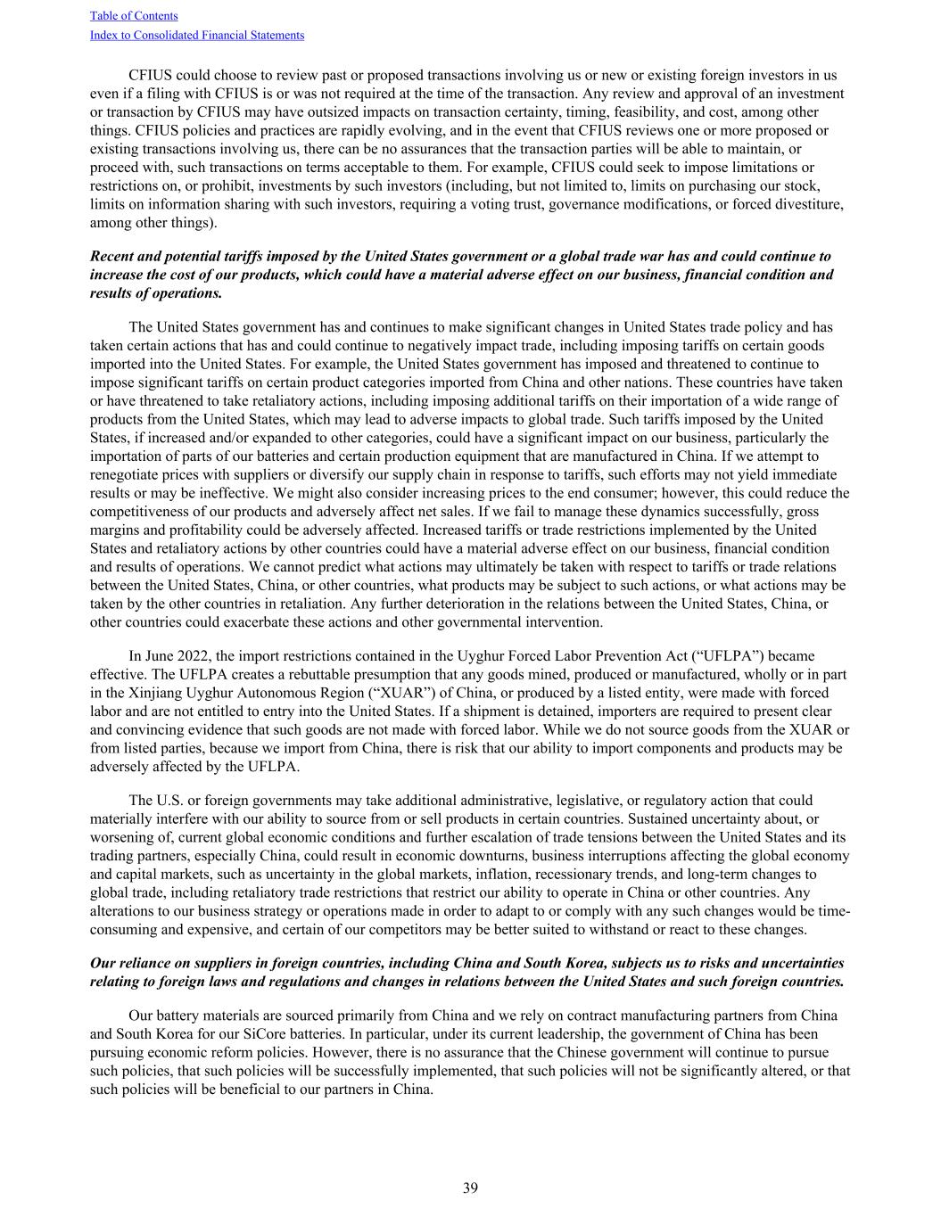 CFIUS could choose to review past or proposed transactions involving us or new or existing foreign investors in us even if a filing with CFIUS is or was not required at the time of the transaction. Any review and approval of an investment or transaction by CFIUS may have outsized impacts on transaction certainty, timing, feasibility, and cost, among other things. CFIUS policies and practices are rapidly evolving, and in the event that CFIUS reviews one or more proposed or existing transactions involving us, there can be no assurances that the transaction parties will be able to maintain, or proceed with, such transactions on terms acceptable to them. For example, CFIUS could seek to impose limitations or restrictions on, or prohibit, investments by such investors (including, but not limited to, limits on purchasing our stock, limits on information sharing with such investors, requiring a voting trust, governance modifications, or forced divestiture, among other things). Recent and potential tariffs imposed by the United States government or a global trade war has and could continue to increase the cost of our products, which could have a material adverse effect on our business, financial condition and results of operations. The United States government has and continues to make significant changes in United States trade policy and has taken certain actions that has and could continue to negatively impact trade, including imposing tariffs on certain goods imported into the United States. For example, the United States government has imposed and threatened to continue to impose significant tariffs on certain product categories imported from China and other nations. These countries have taken or have threatened to take retaliatory actions, including imposing additional tariffs on their importation of a wide range of products from the United States, which may lead to adverse impacts to global trade. Such tariffs imposed by the United States, if increased and/or expanded to other categories, could have a significant impact on our business, particularly the importation of parts of our batteries and certain production equipment that are manufactured in China. If we attempt to renegotiate prices with suppliers or diversify our supply chain in response to tariffs, such efforts may not yield immediate results or may be ineffective. We might also consider increasing prices to the end consumer; however, this could reduce the competitiveness of our products and adversely affect net sales. If we fail to manage these dynamics successfully, gross margins and profitability could be adversely affected. Increased tariffs or trade restrictions implemented by the United States and retaliatory actions by other countries could have a material adverse effect on our business, financial condition and results of operations. We cannot predict what actions may ultimately be taken with respect to tariffs or trade relations between the United States, China, or other countries, what products may be subject to such actions, or what actions may be taken by the other countries in retaliation. Any further deterioration in the relations between the United States, China, or other countries could exacerbate these actions and other governmental intervention. In June 2022, the import restrictions contained in the Uyghur Forced Labor Prevention Act (“UFLPA”) became effective. The UFLPA creates a rebuttable presumption that any goods mined, produced or manufactured, wholly or in part in the Xinjiang Uyghur Autonomous Region (“XUAR”) of China, or produced by a listed entity, were made with forced labor and are not entitled to entry into the United States. If a shipment is detained, importers are required to present clear and convincing evidence that such goods are not made with forced labor. While we do not source goods from the XUAR or from listed parties, because we import from China, there is risk that our ability to import components and products may be adversely affected by the UFLPA. The U.S. or foreign governments may take additional administrative, legislative, or regulatory action that could materially interfere with our ability to source from or sell products in certain countries. Sustained uncertainty about, or worsening of, current global economic conditions and further escalation of trade tensions between the United States and its trading partners, especially China, could result in economic downturns, business interruptions affecting the global economy and capital markets, such as uncertainty in the global markets, inflation, recessionary trends, and long-term changes to global trade, including retaliatory trade restrictions that restrict our ability to operate in China or other countries. Any alterations to our business strategy or operations made in order to adapt to or comply with any such changes would be time- consuming and expensive, and certain of our competitors may be better suited to withstand or react to these changes. Our reliance on suppliers in foreign countries, including China and South Korea, subjects us to risks and uncertainties relating to foreign laws and regulations and changes in relations between the United States and such foreign countries. Our battery materials are sourced primarily from China and we rely on contract manufacturing partners from China and South Korea for our SiCore batteries. In particular, under its current leadership, the government of China has been pursuing economic reform policies. However, there is no assurance that the Chinese government will continue to pursue such policies, that such policies will be successfully implemented, that such policies will not be significantly altered, or that such policies will be beneficial to our partners in China. Table of Contents Index to Consolidated Financial Statements 39
