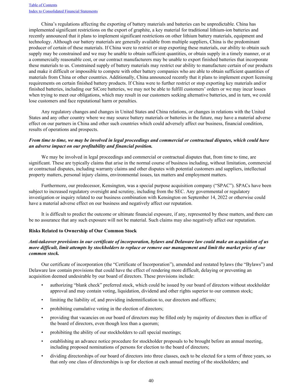 China’s regulations affecting the exporting of battery materials and batteries can be unpredictable. China has implemented significant restrictions on the export of graphite, a key material for traditional lithium-ion batteries and recently announced that it plans to implement significant restrictions on other lithium battery materials, equipment and technology. Although our battery materials are generally available from multiple suppliers, China is the predominant producer of certain of these materials. If China were to restrict or stop exporting these materials, our ability to obtain such supply may be constrained and we may be unable to obtain sufficient quantities, or obtain supply in a timely manner, or at a commercially reasonable cost, or our contract manufacturers may be unable to export finished batteries that incorporate these materials to us. Constrained supply of battery materials may restrict our ability to manufacture certain of our products and make it difficult or impossible to compete with other battery companies who are able to obtain sufficient quantities of materials from China or other countries. Additionally, China announced recently that it plans to implement export licensing requirements on certain finished battery products. If China were to further restrict or stop exporting key materials and/or finished batteries, including our SiCore batteries, we may not be able to fulfill customers’ orders or we may incur losses when trying to meet our obligations, which may result in our customers seeking alternative batteries, and in turn, we could lose customers and face reputational harm or penalties. Any regulatory changes and changes in United States and China relations, or changes in relations with the United States and any other country where we may source battery materials or batteries in the future, may have a material adverse effect on our partners in China and other such countries which could adversely affect our business, financial condition, results of operations and prospects. From time to time, we may be involved in legal proceedings and commercial or contractual disputes, which could have an adverse impact on our profitability and financial position. We may be involved in legal proceedings and commercial or contractual disputes that, from time to time, are significant. These are typically claims that arise in the normal course of business including, without limitation, commercial or contractual disputes, including warranty claims and other disputes with potential customers and suppliers, intellectual property matters, personal injury claims, environmental issues, tax matters and employment matters. Furthermore, our predecessor, Kensington, was a special purpose acquisition company (“SPAC”). SPACs have been subject to increased regulatory oversight and scrutiny, including from the SEC. Any governmental or regulatory investigation or inquiry related to our business combination with Kensington on September 14, 2022 or otherwise could have a material adverse effect on our business and negatively affect our reputation. It is difficult to predict the outcome or ultimate financial exposure, if any, represented by these matters, and there can be no assurance that any such exposure will not be material. Such claims may also negatively affect our reputation. Risks Related to Ownership of Our Common Stock Anti-takeover provisions in our certificate of incorporation, bylaws and Delaware law could make an acquisition of us more difficult, limit attempts by stockholders to replace or remove our management and limit the market price of our common stock. Our certificate of incorporation (the “Certificate of Incorporation”), amended and restated bylaws (the “Bylaws”) and Delaware law contain provisions that could have the effect of rendering more difficult, delaying or preventing an acquisition deemed undesirable by our board of directors. These provisions include: • authorizing “blank check” preferred stock, which could be issued by our board of directors without stockholder approval and may contain voting, liquidation, dividend and other rights superior to our common stock; • limiting the liability of, and providing indemnification to, our directors and officers; • prohibiting cumulative voting in the election of directors; • providing that vacancies on our board of directors may be filled only by majority of directors then in office of the board of directors, even though less than a quorum; • prohibiting the ability of our stockholders to call special meetings; • establishing an advance notice procedure for stockholder proposals to be brought before an annual meeting, including proposed nominations of persons for election to the board of directors; • dividing directorships of our board of directors into three classes, each to be elected for a term of three years, so that only one class of directorships is up for election at each annual meeting of the stockholders; and Table of Contents Index to Consolidated Financial Statements 40